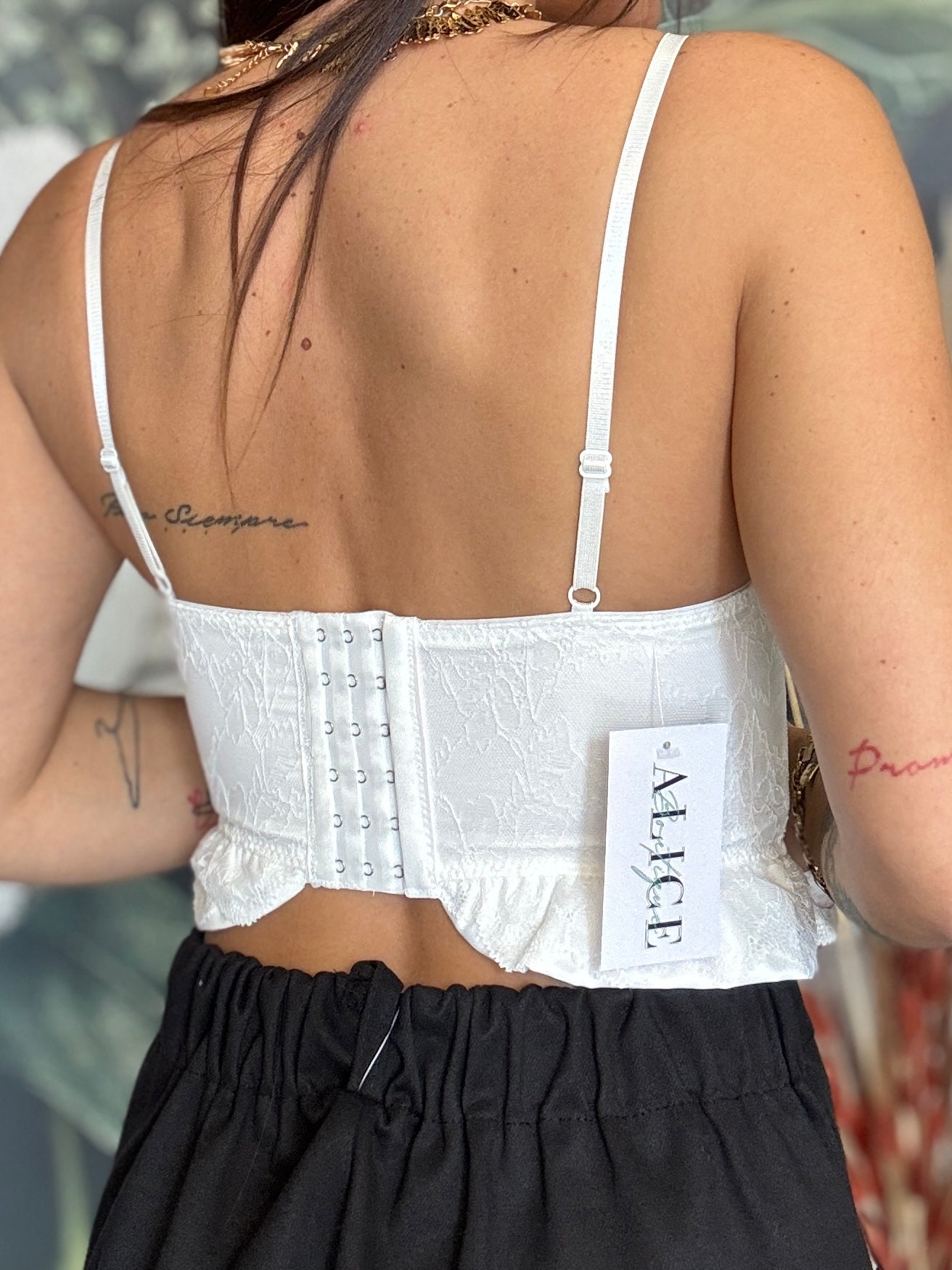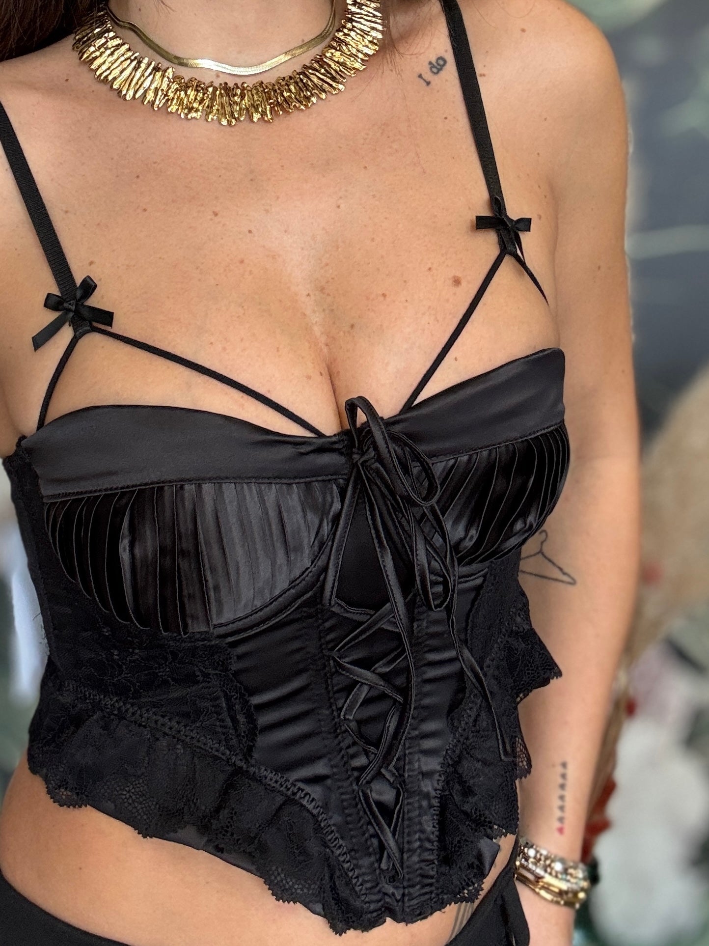 Corpetto in tessuto lucido, sul davanti presenta un dettaglio a stecche che richiama lo stile del corsetto con chiusura decorativa a nastro intrecciato al centro. Le coppe sono arricciate e leggermente imbottite, le spalline sottili e regolabili. Il bordo inferiore ha una piccola balza arricciata .