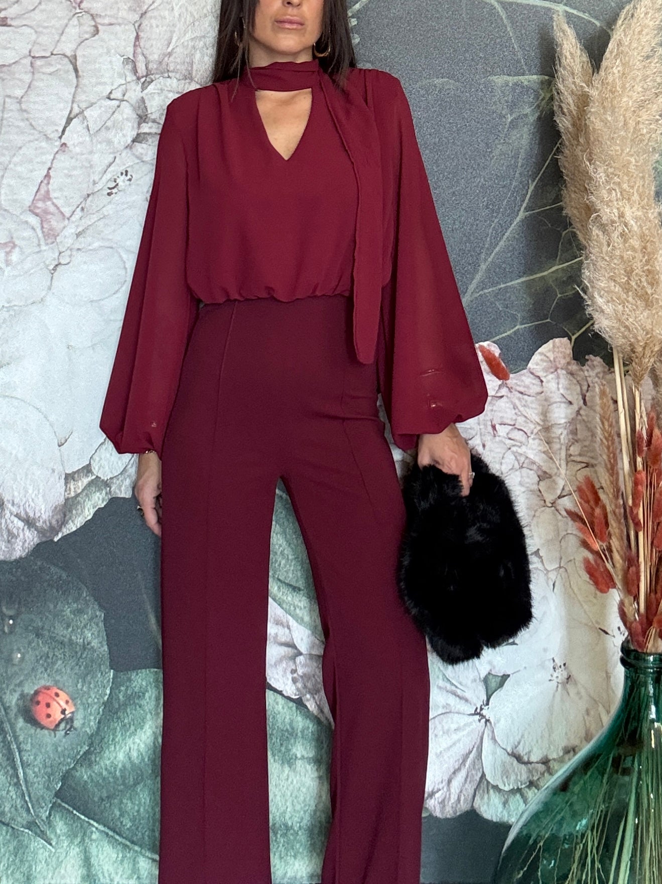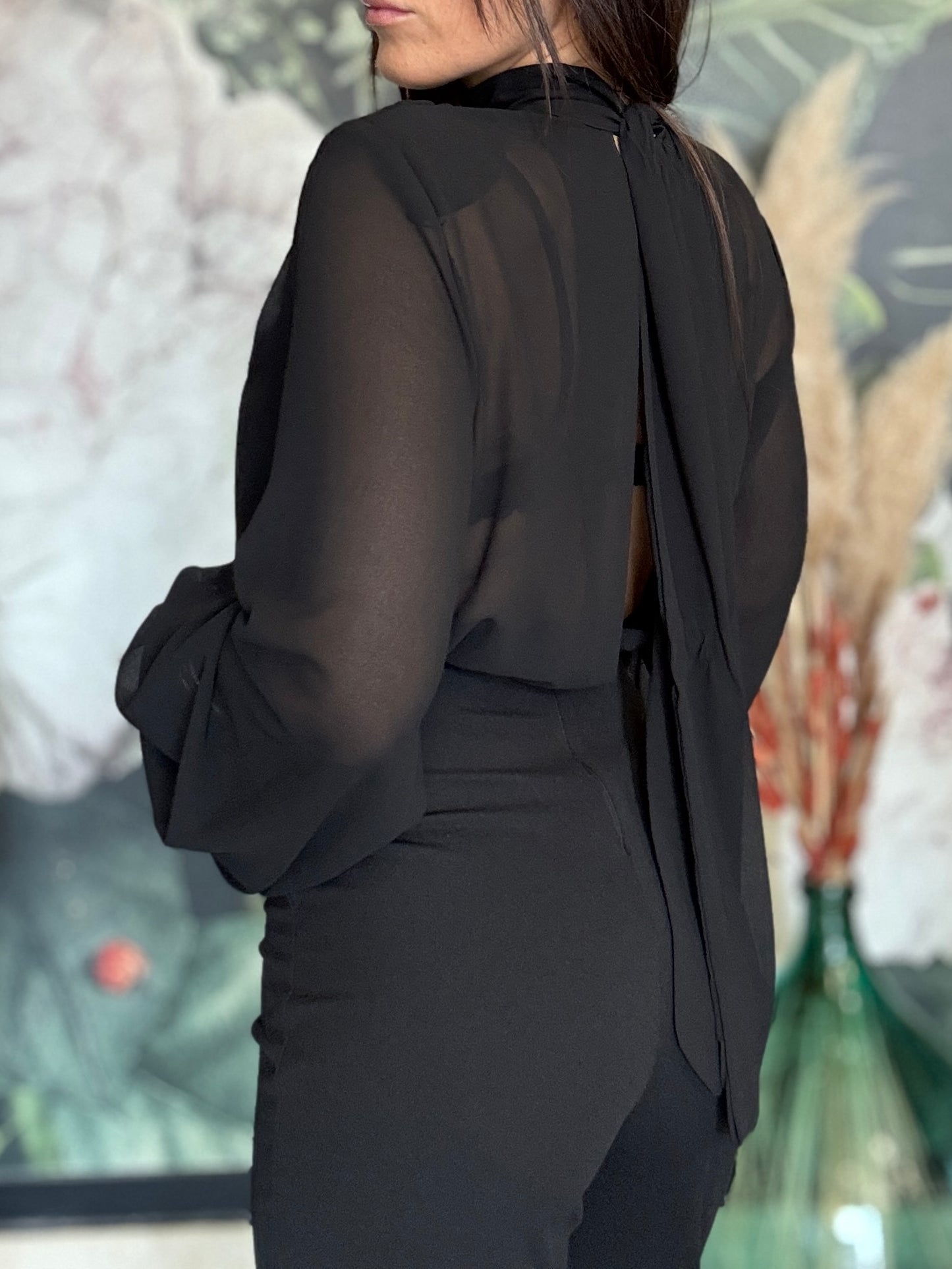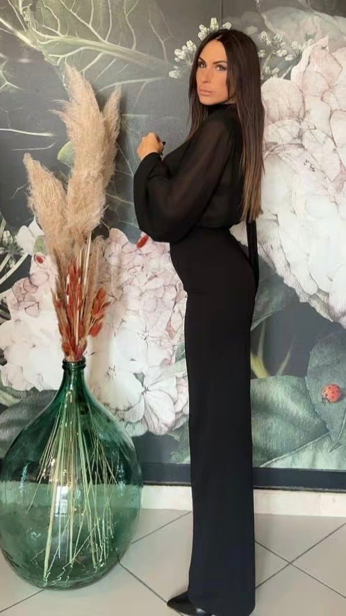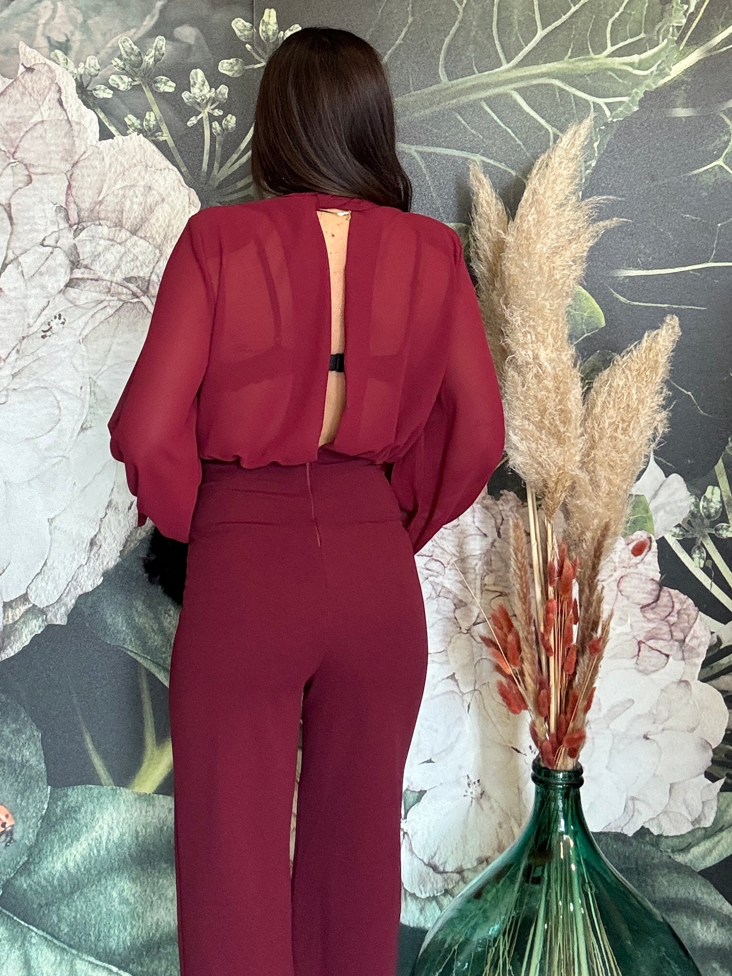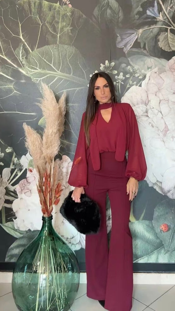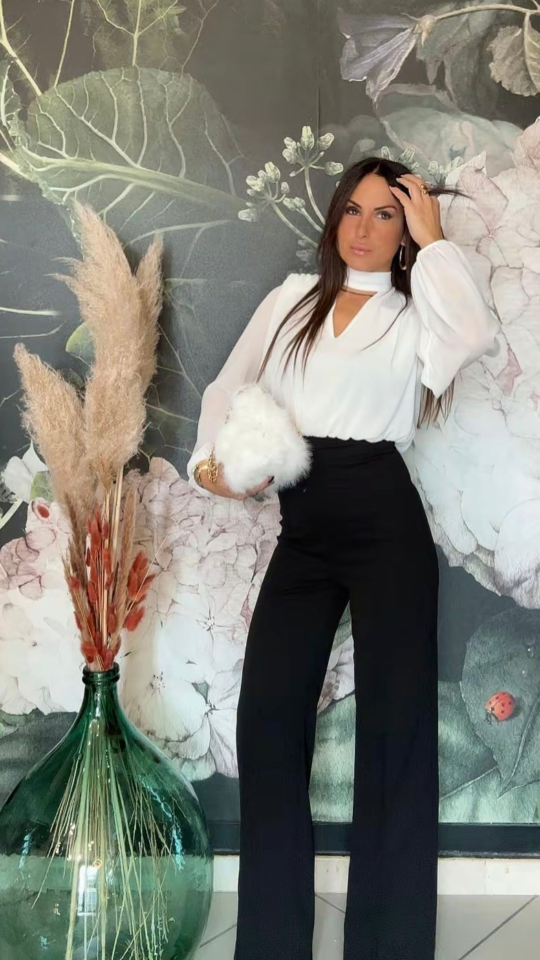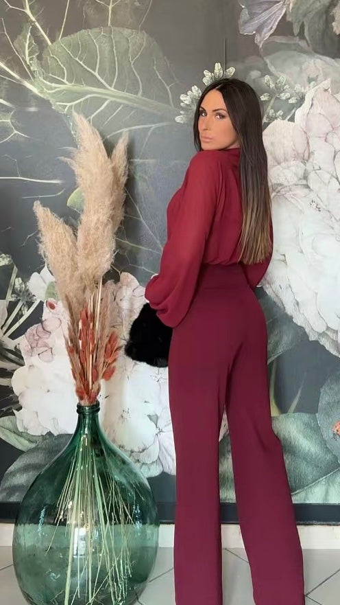 Tuta intera elegante composta dalla blusa in tessuto fluido con maniche lunghe e ampie, scollata a V con una chiusura sul collo, la parte posteriore è parzialmente aperta. Il pantalone a vita alta, dal taglio dritto e lungo, zip invisibile sul retro e elastico in vita.