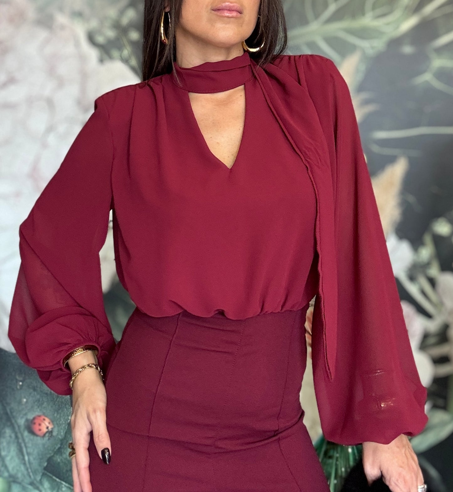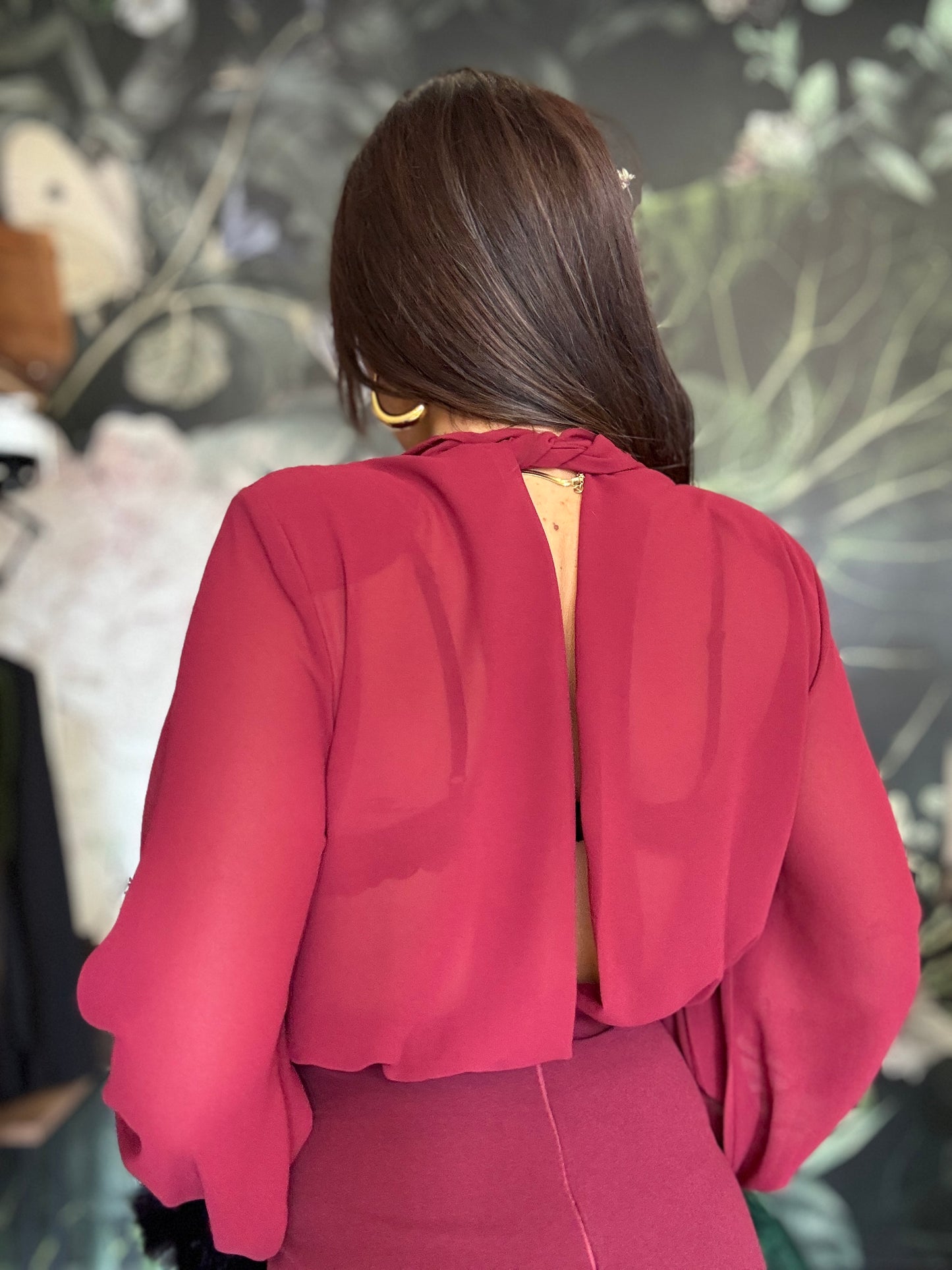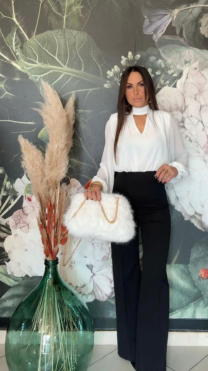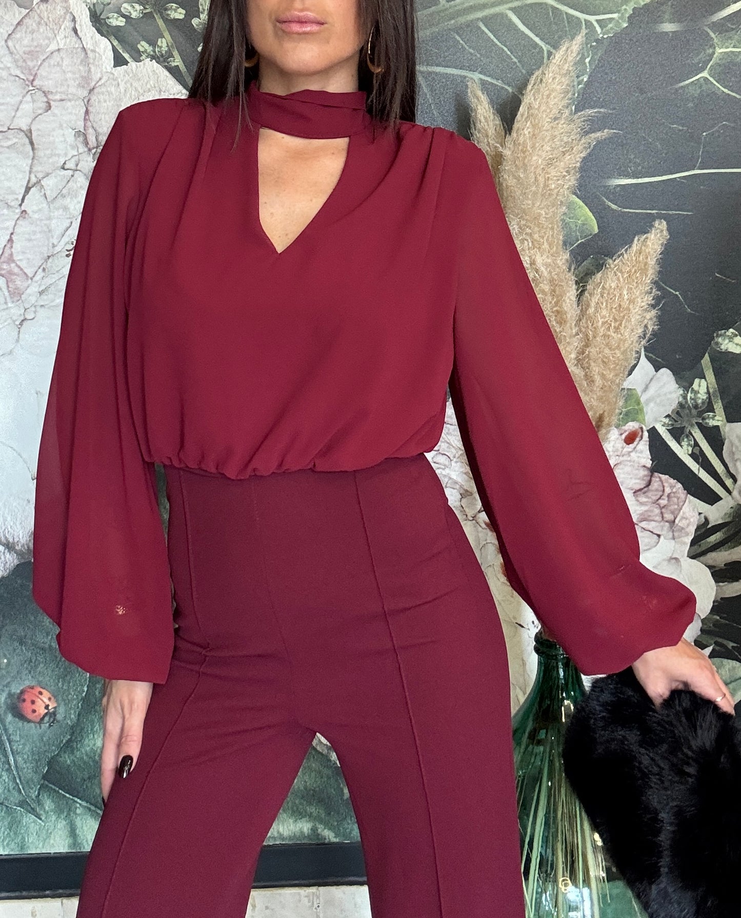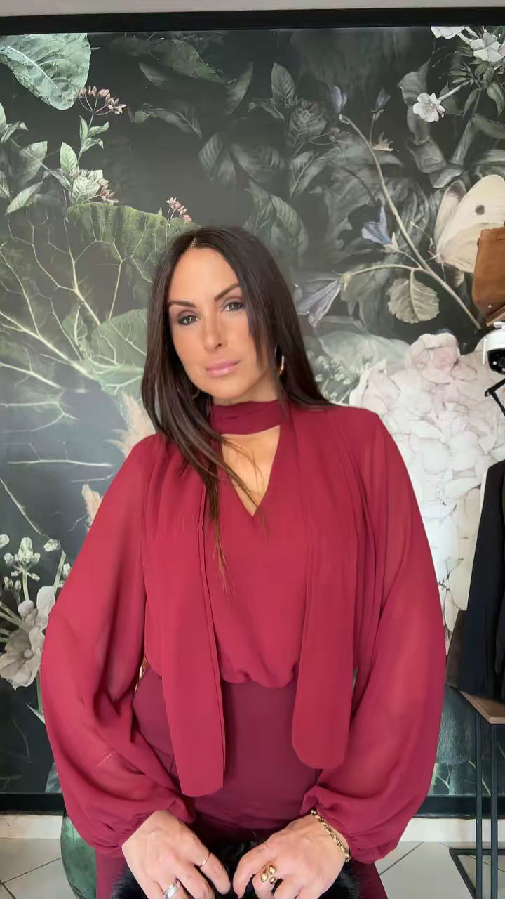 Tuta intera elegante composta dalla blusa in tessuto fluido con maniche lunghe e ampie, scollata a V con una chiusura sul collo, la parte posteriore è parzialmente aperta. Il pantalone a vita alta, dal taglio dritto e lungo, zip invisibile sul retro e elastico in vita.