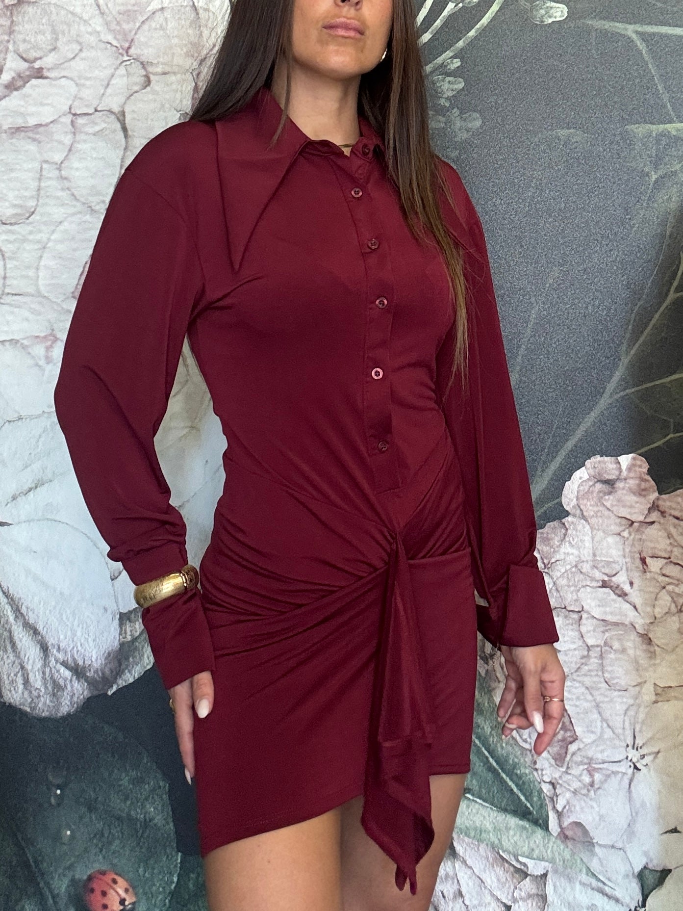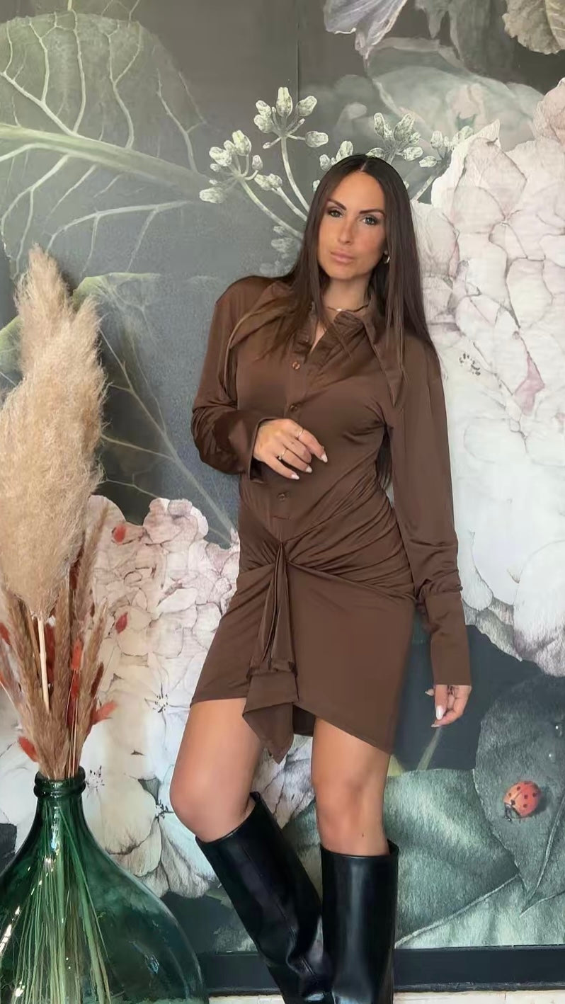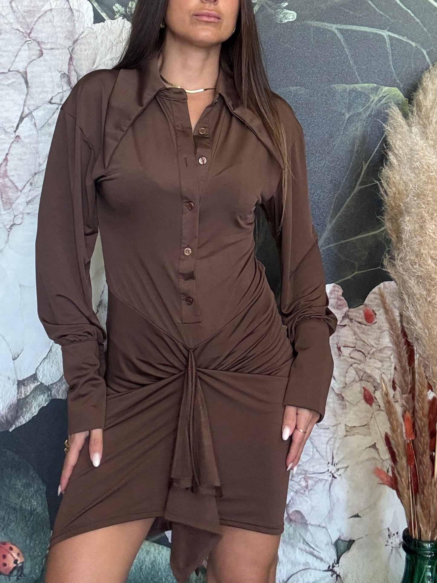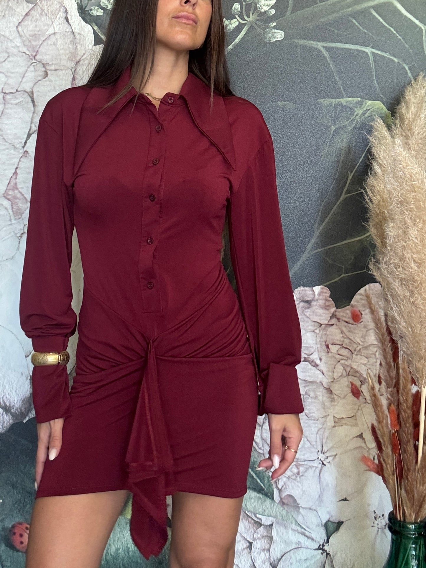 Abito con colletto a punta , abbottonatura sul davanati, manica morbida con polsino alto. La parte inferiore frontale della gonna è per metà drappeggiata, ma resta comunque fasciante sul retro, sottogonna applicato.