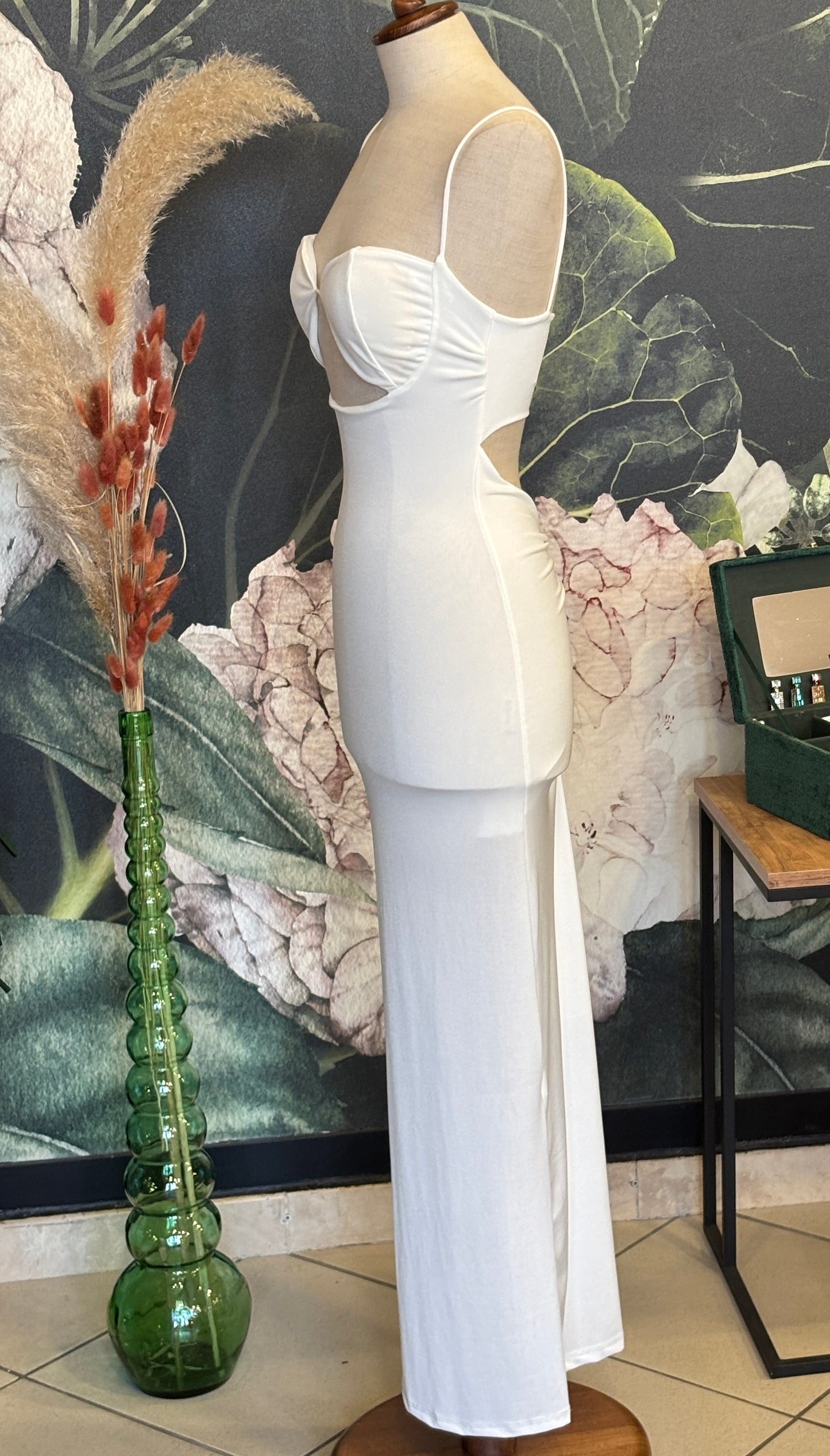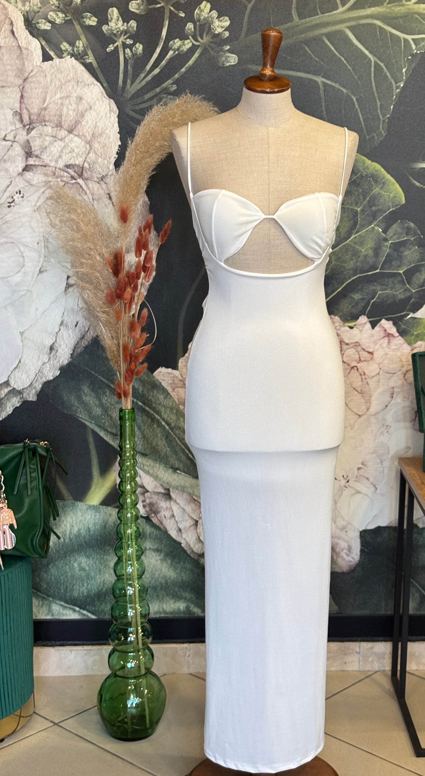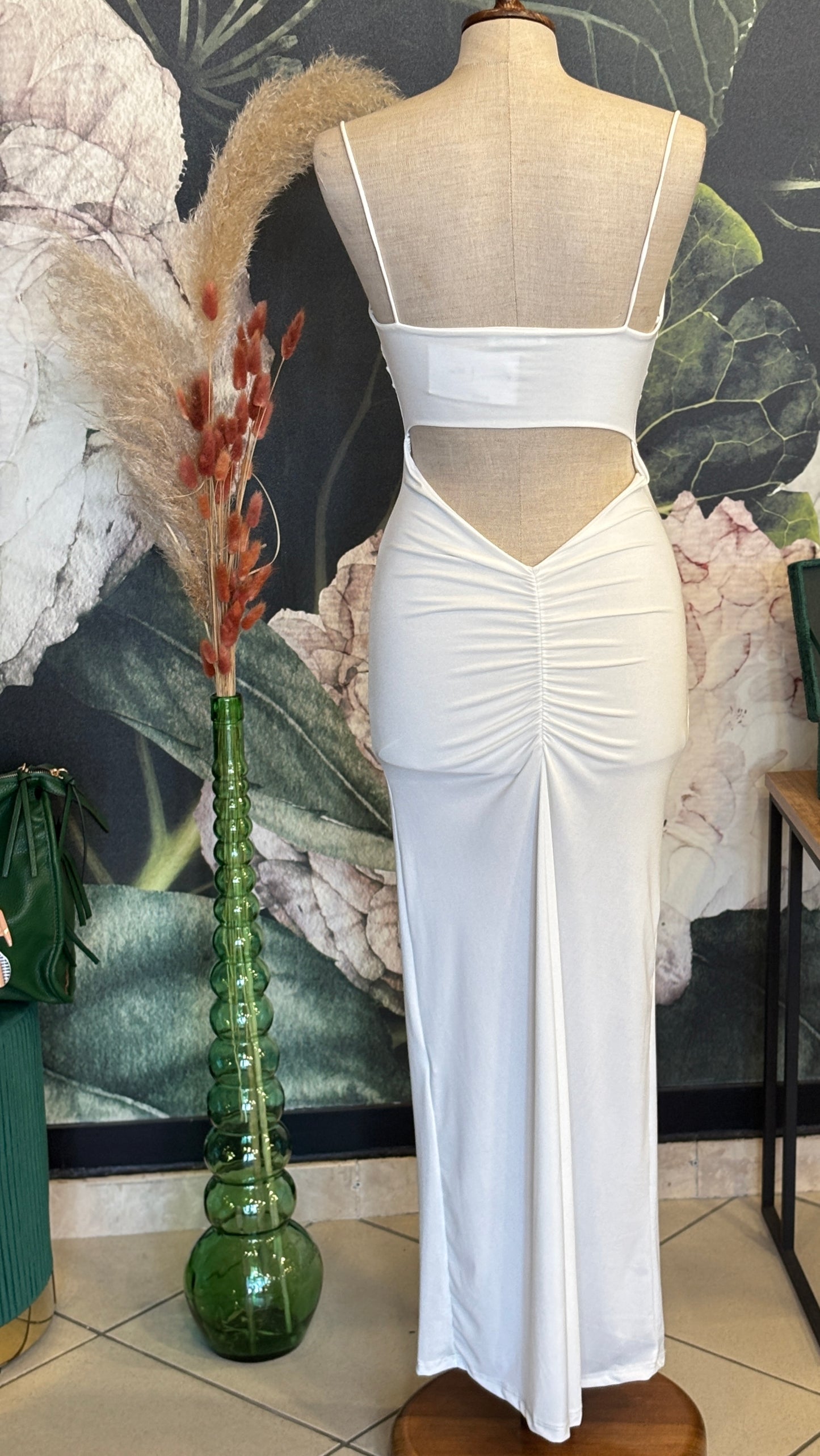 Abito lungo, con spalline in elastico, coppe inserite, apertura sotto il seno e sul retro, drappeggiato sul retro.