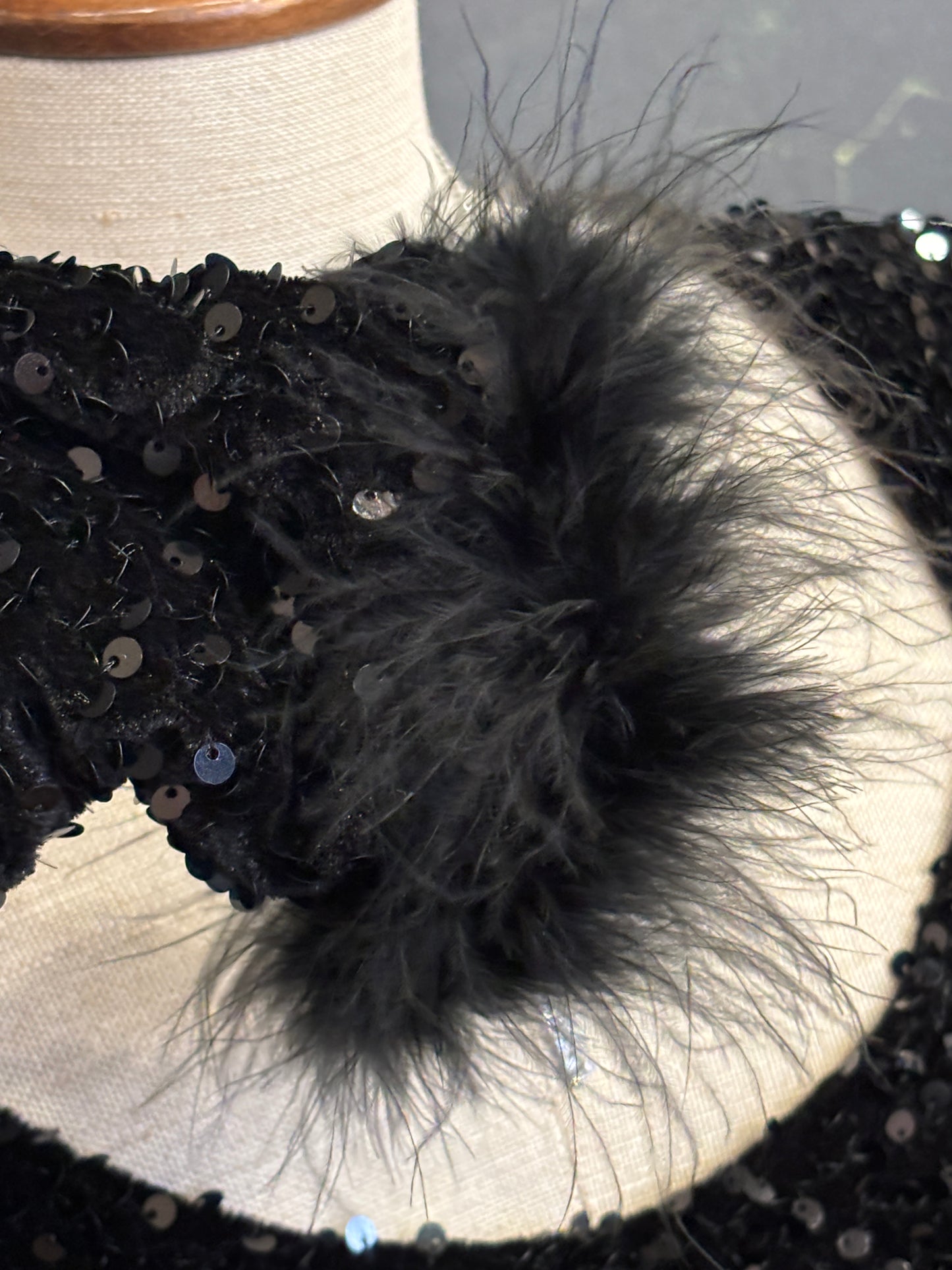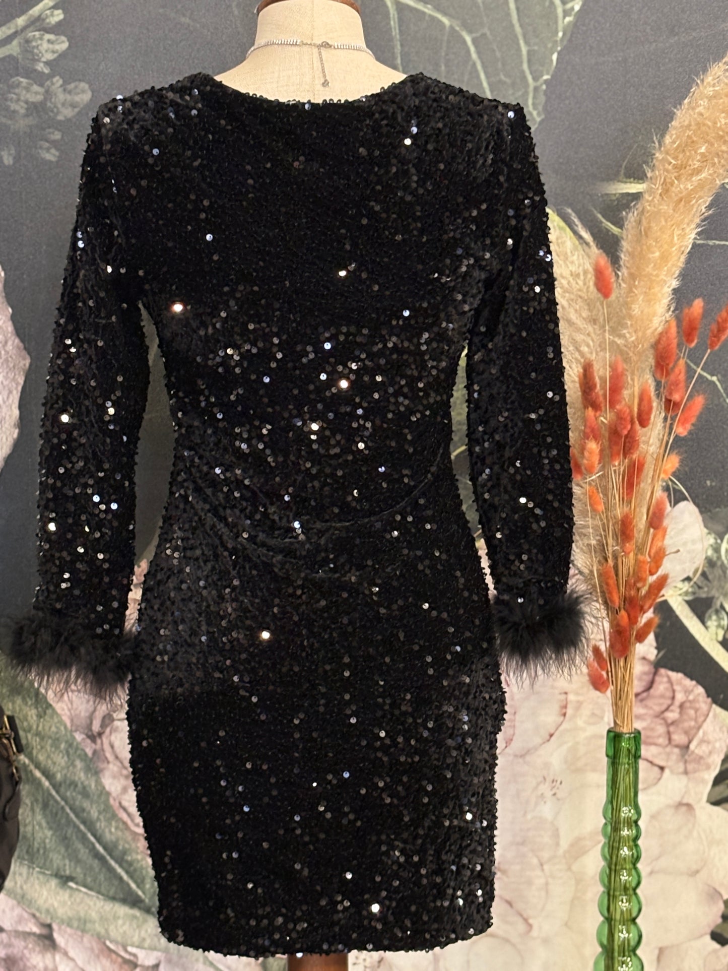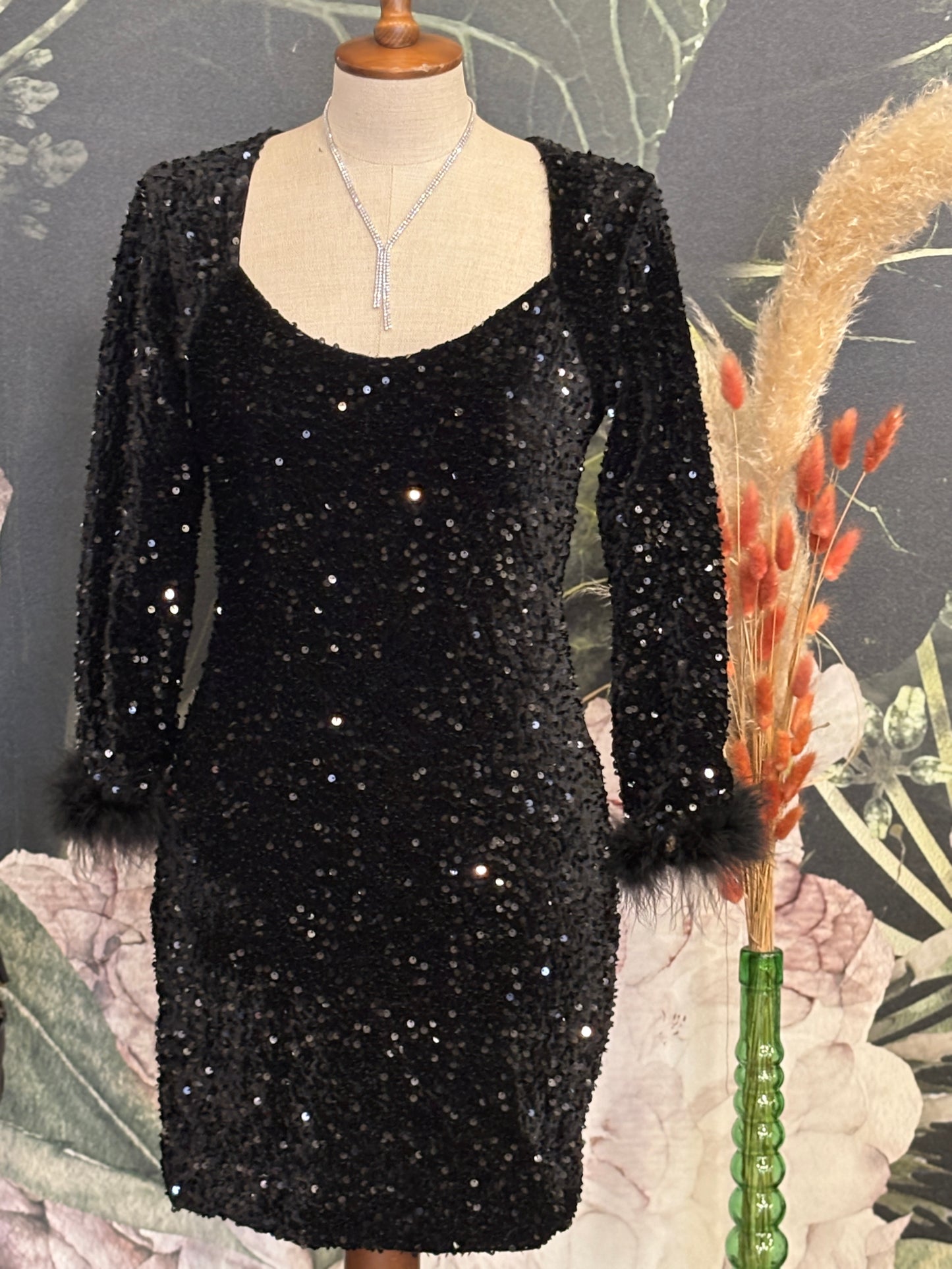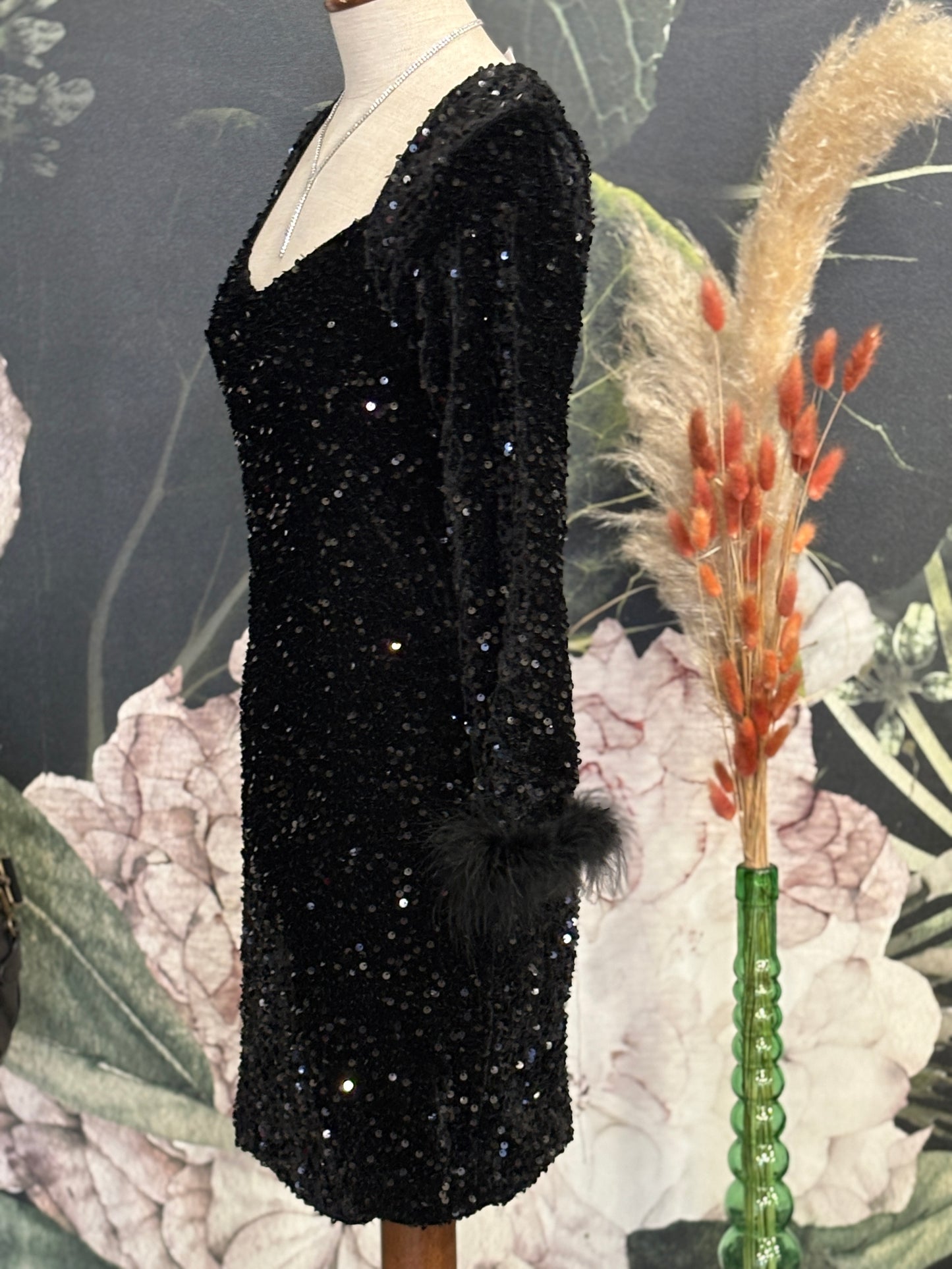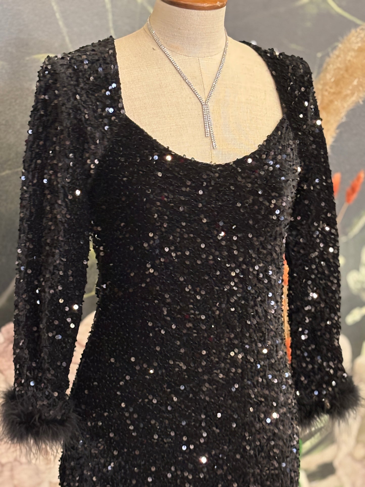 Tubino in paillettes manica lunga con piume sui polsini, scollo ovale, fodera interna.