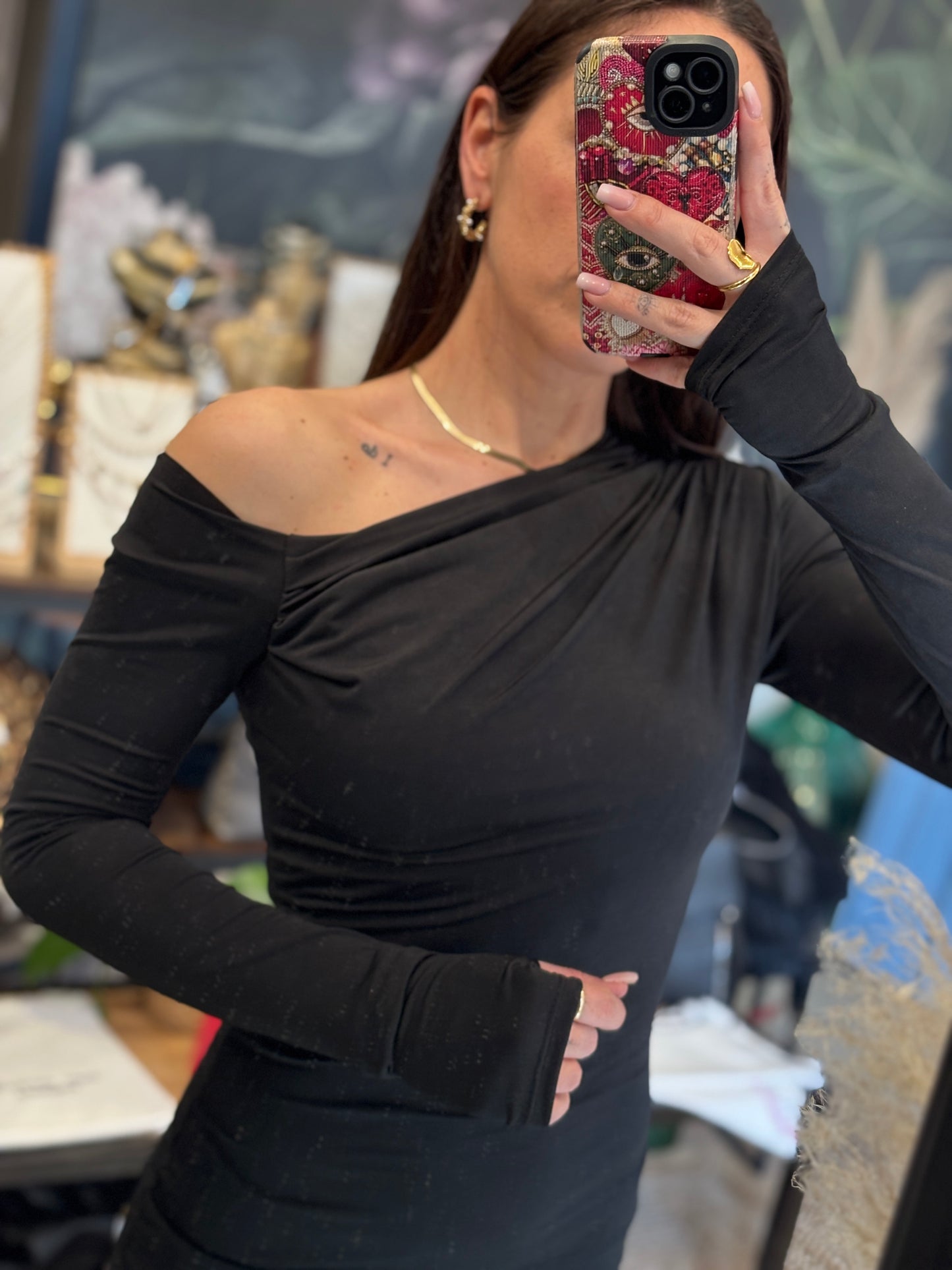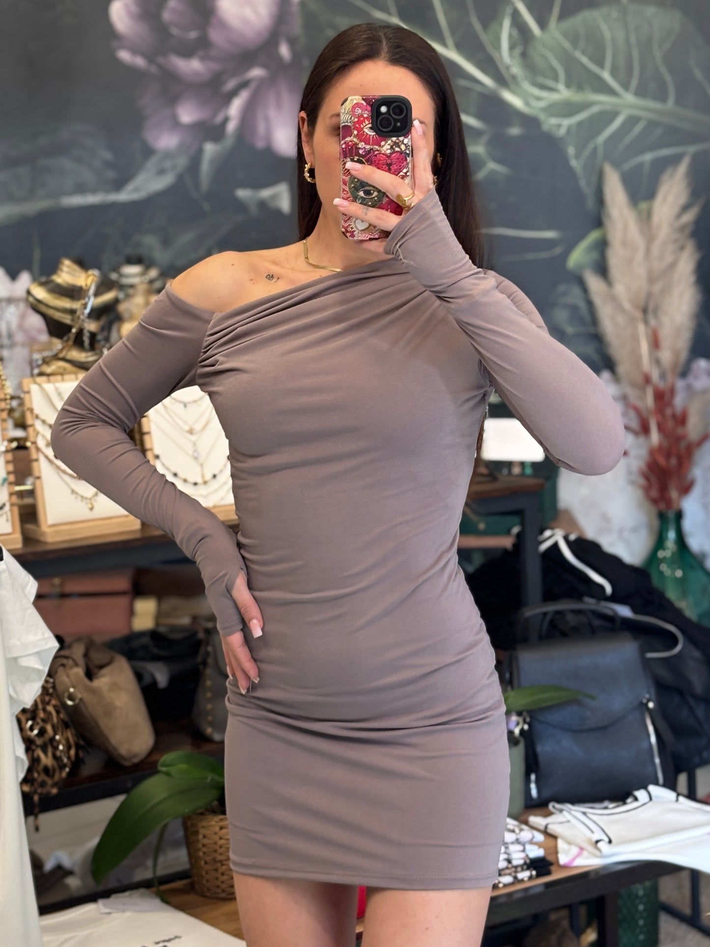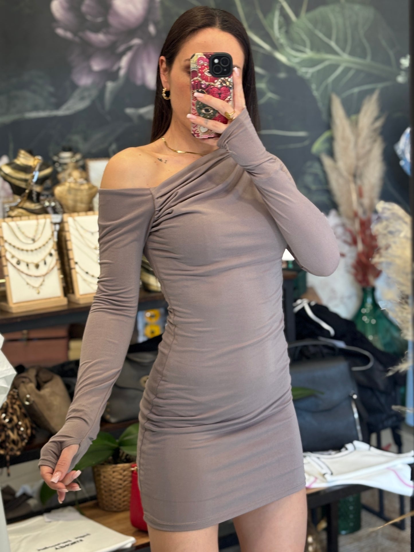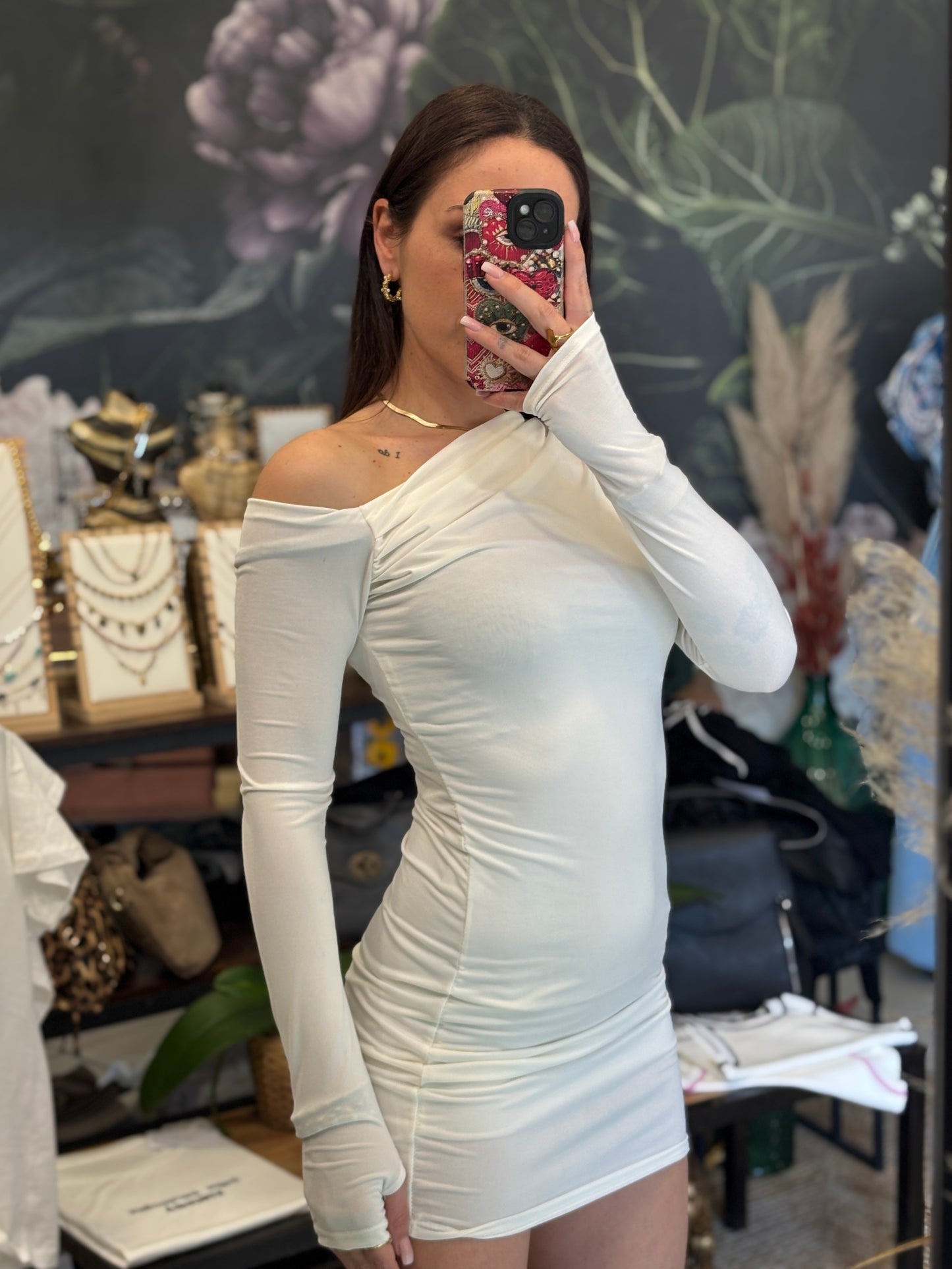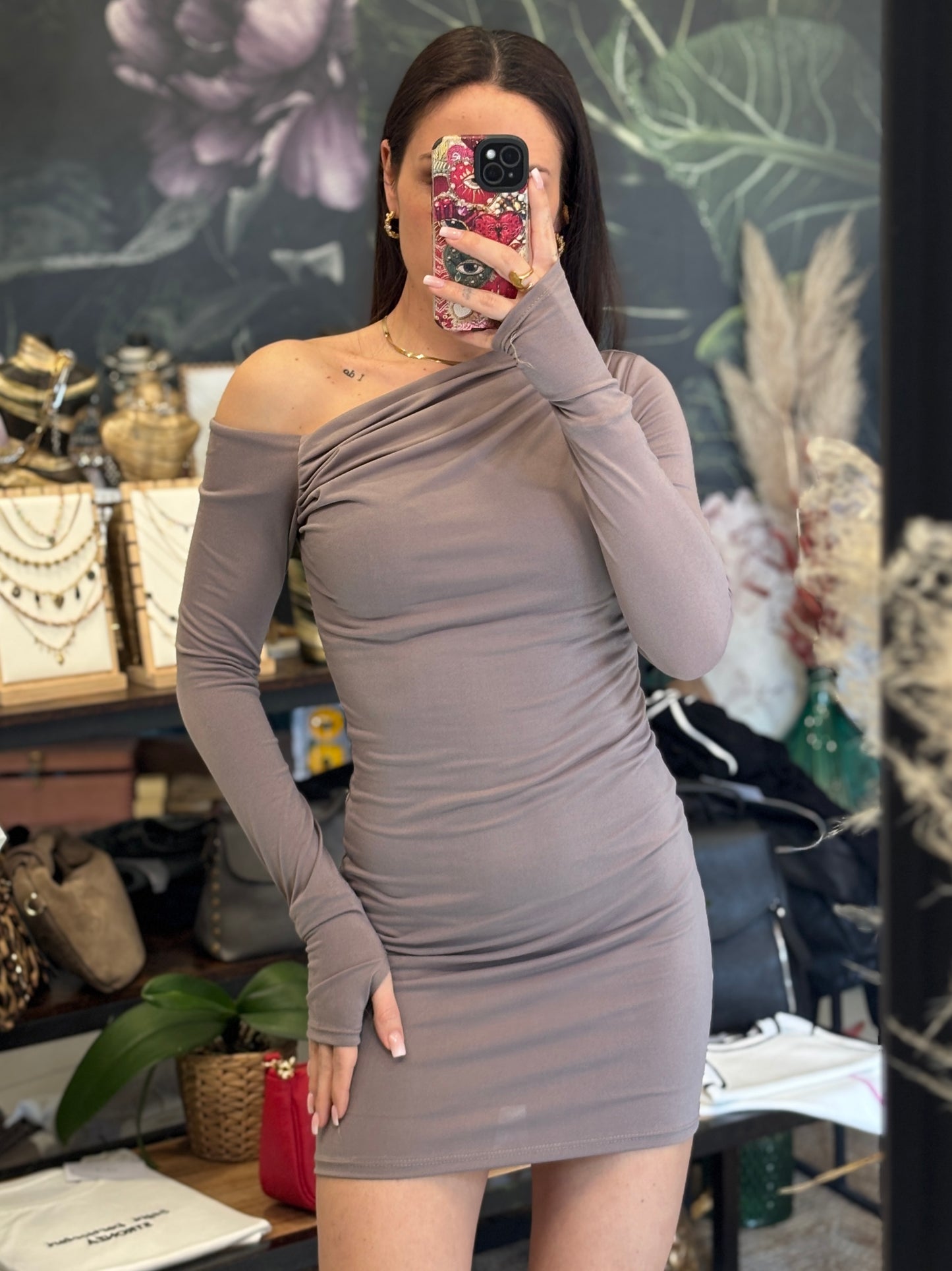 Mini Abito con scollo obliquo, drappeggio sulla spalla e manica a guanto, vestibilità aderente.