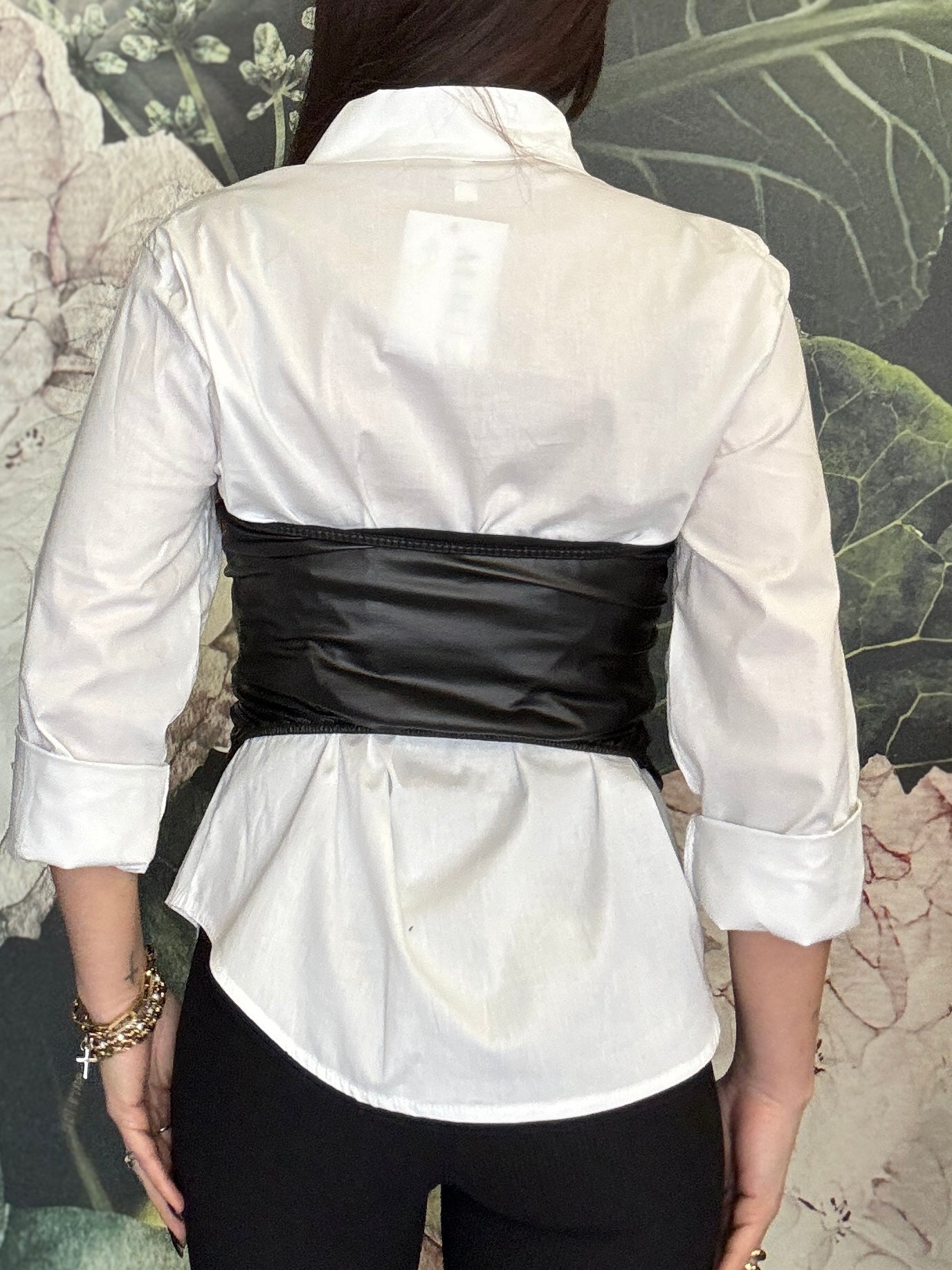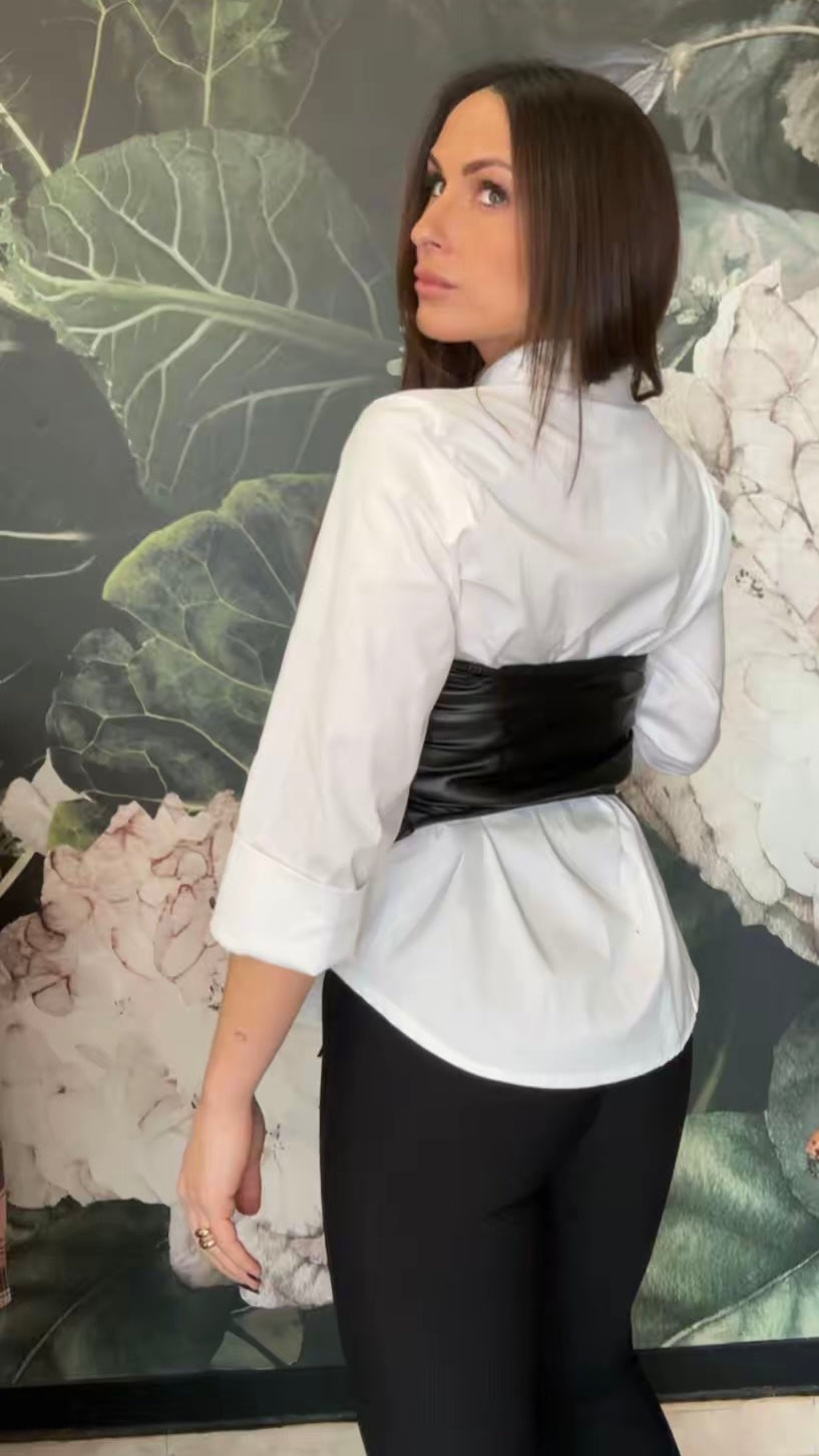 Camicia dal taglio classico con corsetto elasticizzato con effetto simil pelle da sovrapporre, i due capi sono separabili ed utilizzabili singolarmente. Il corsetto internamente è leggermente imbottito.