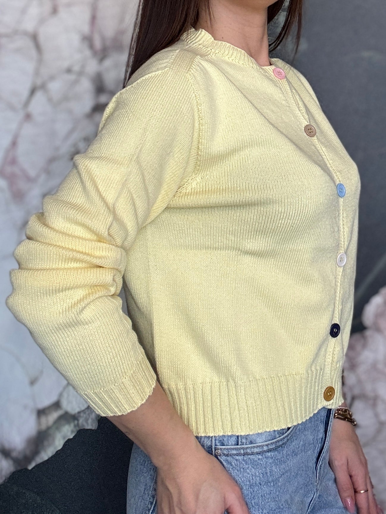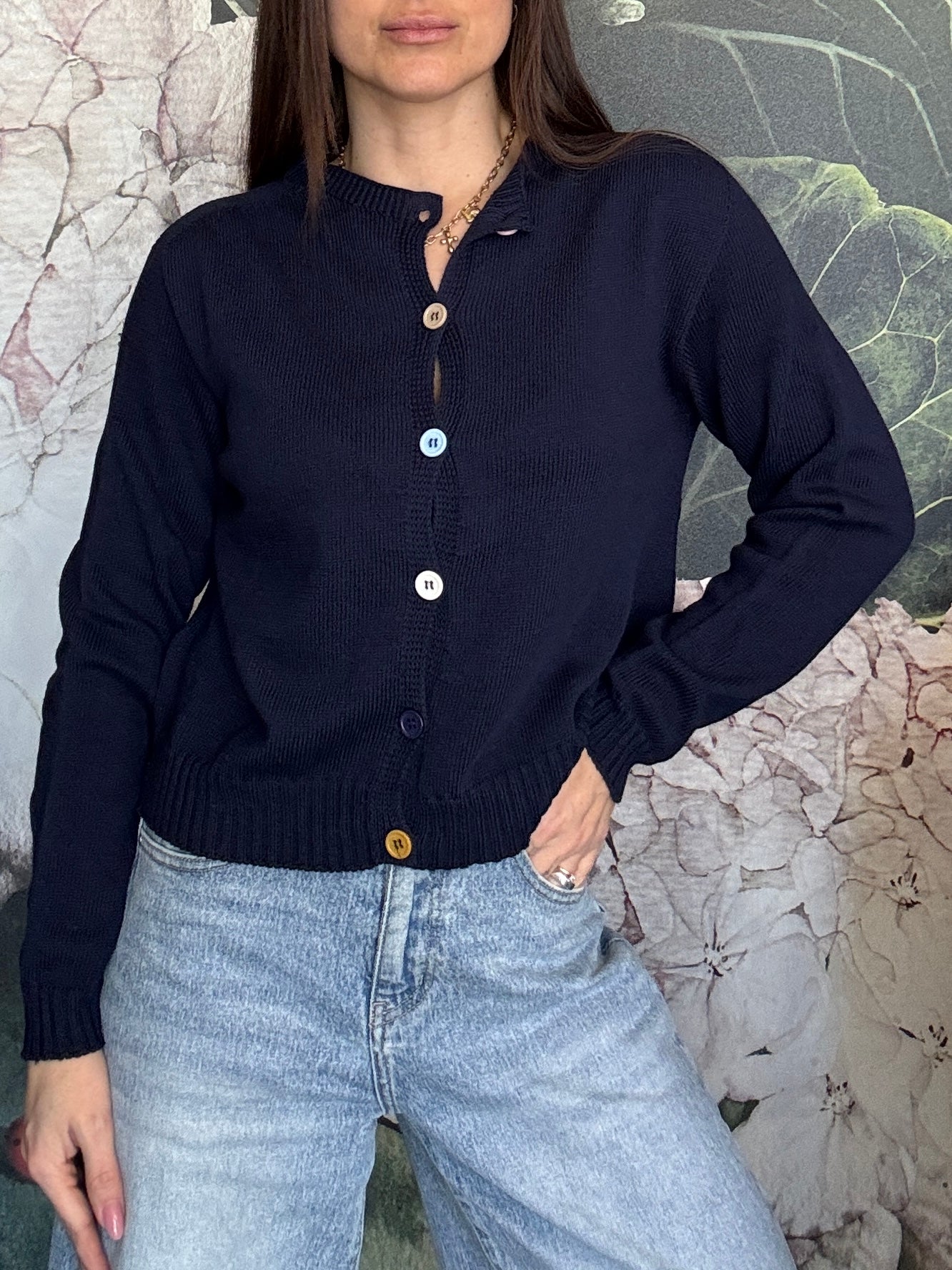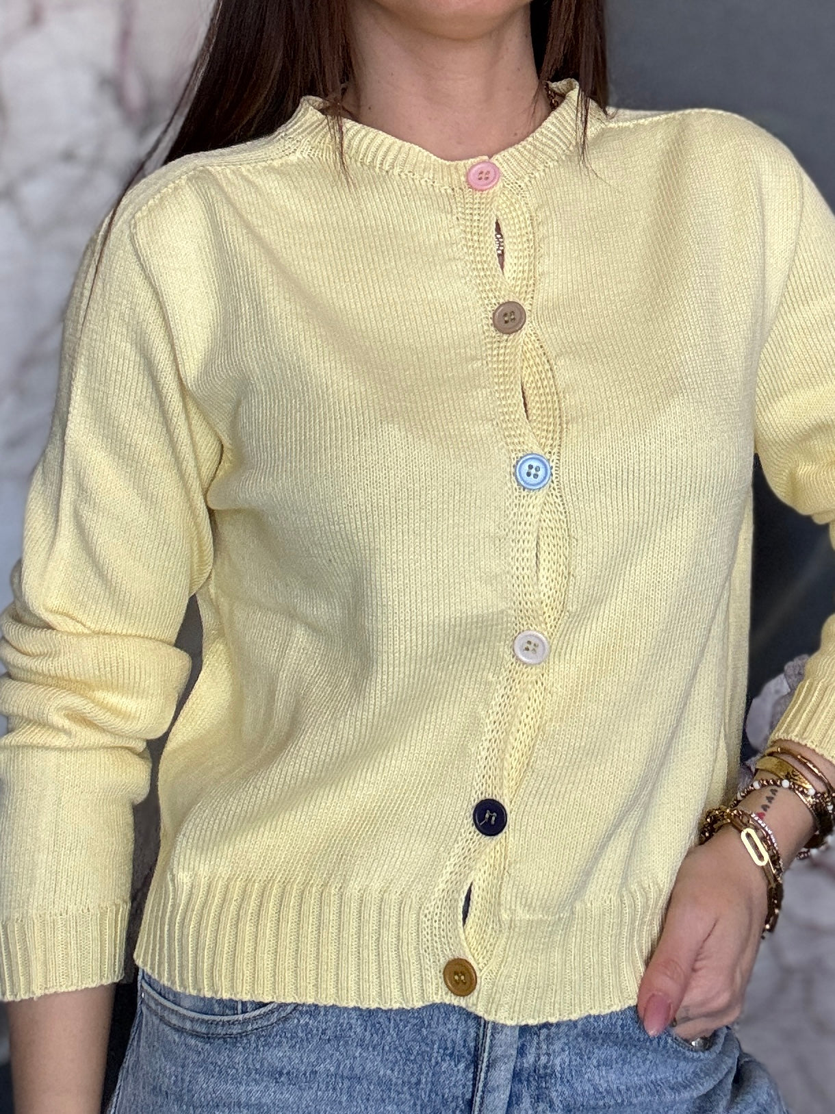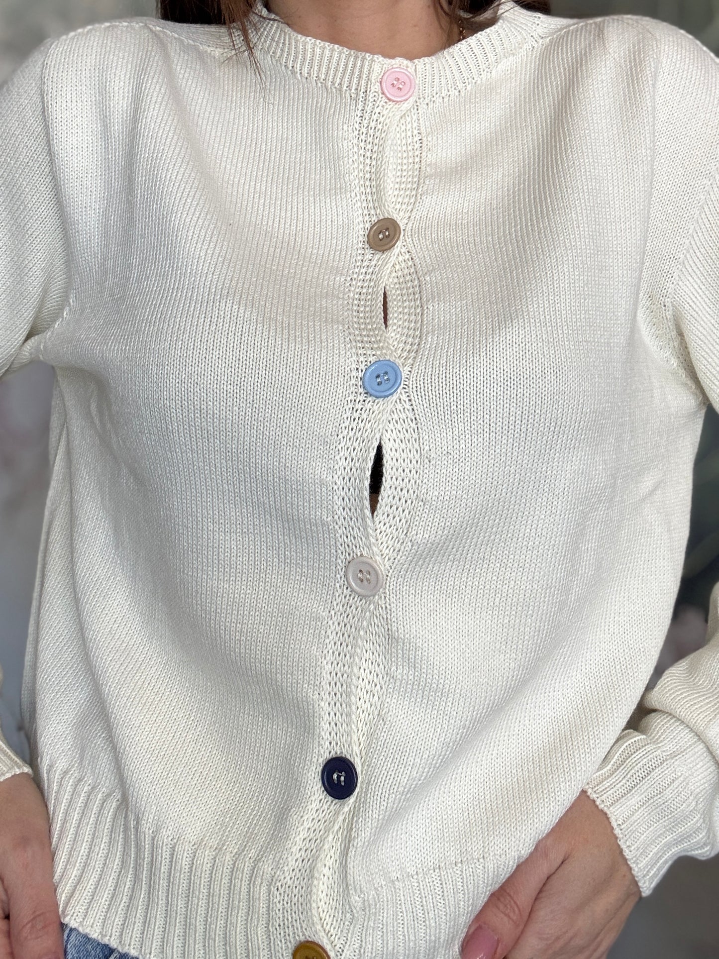 Cardigan con bottoni multicolor, girocollo, manica lunga, finiture a costine su polsini e fondo, vestibilità morbida.