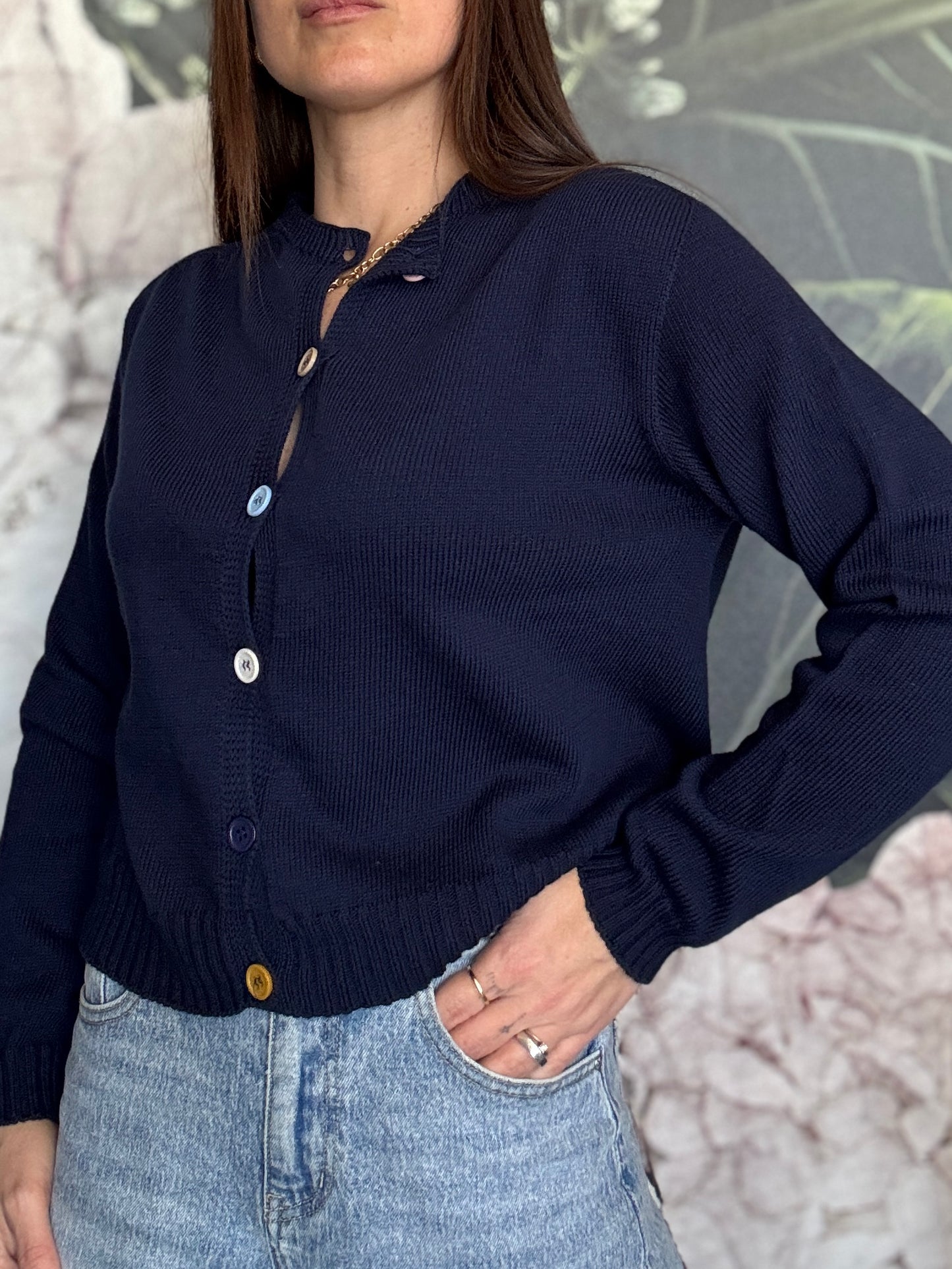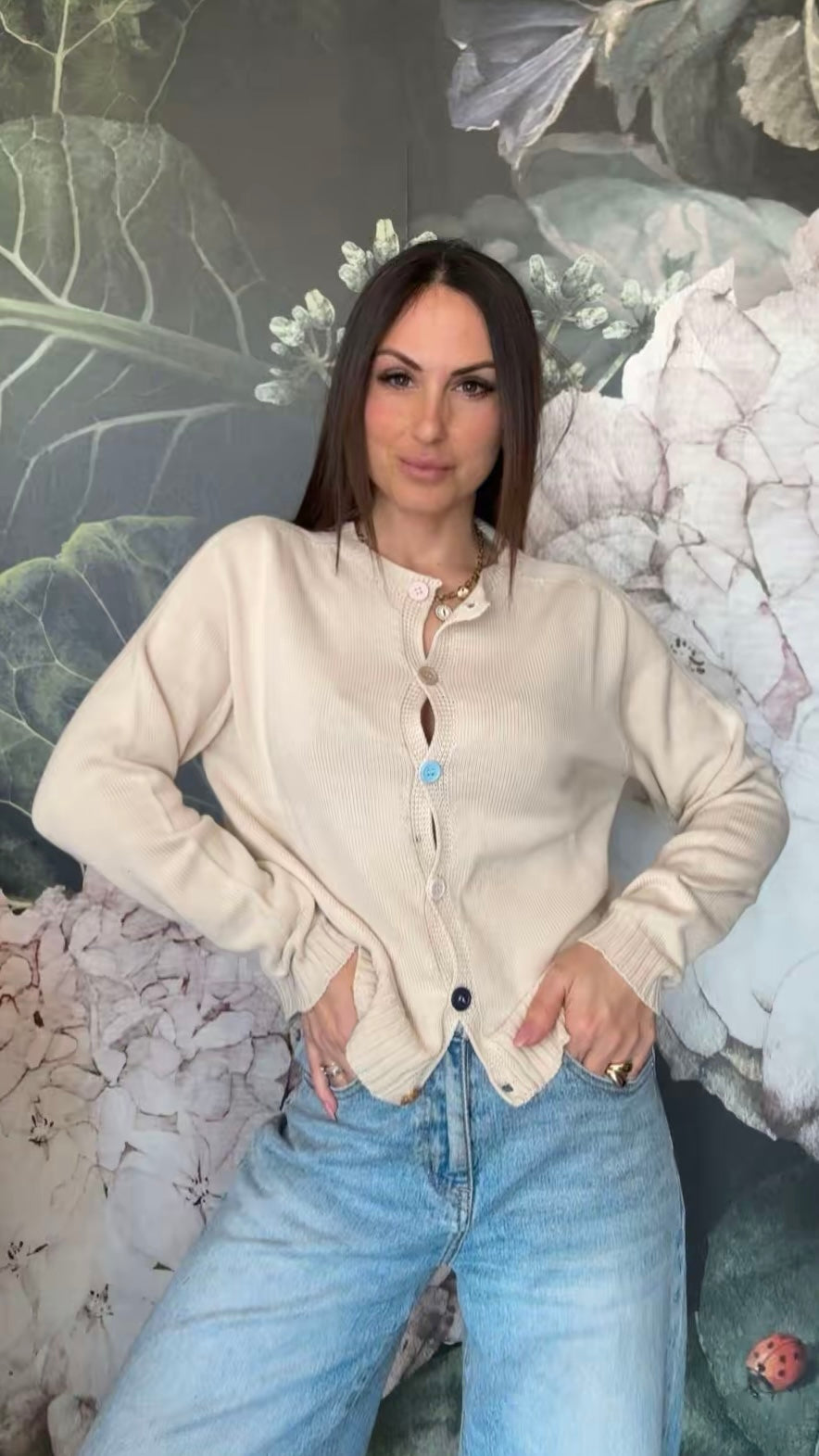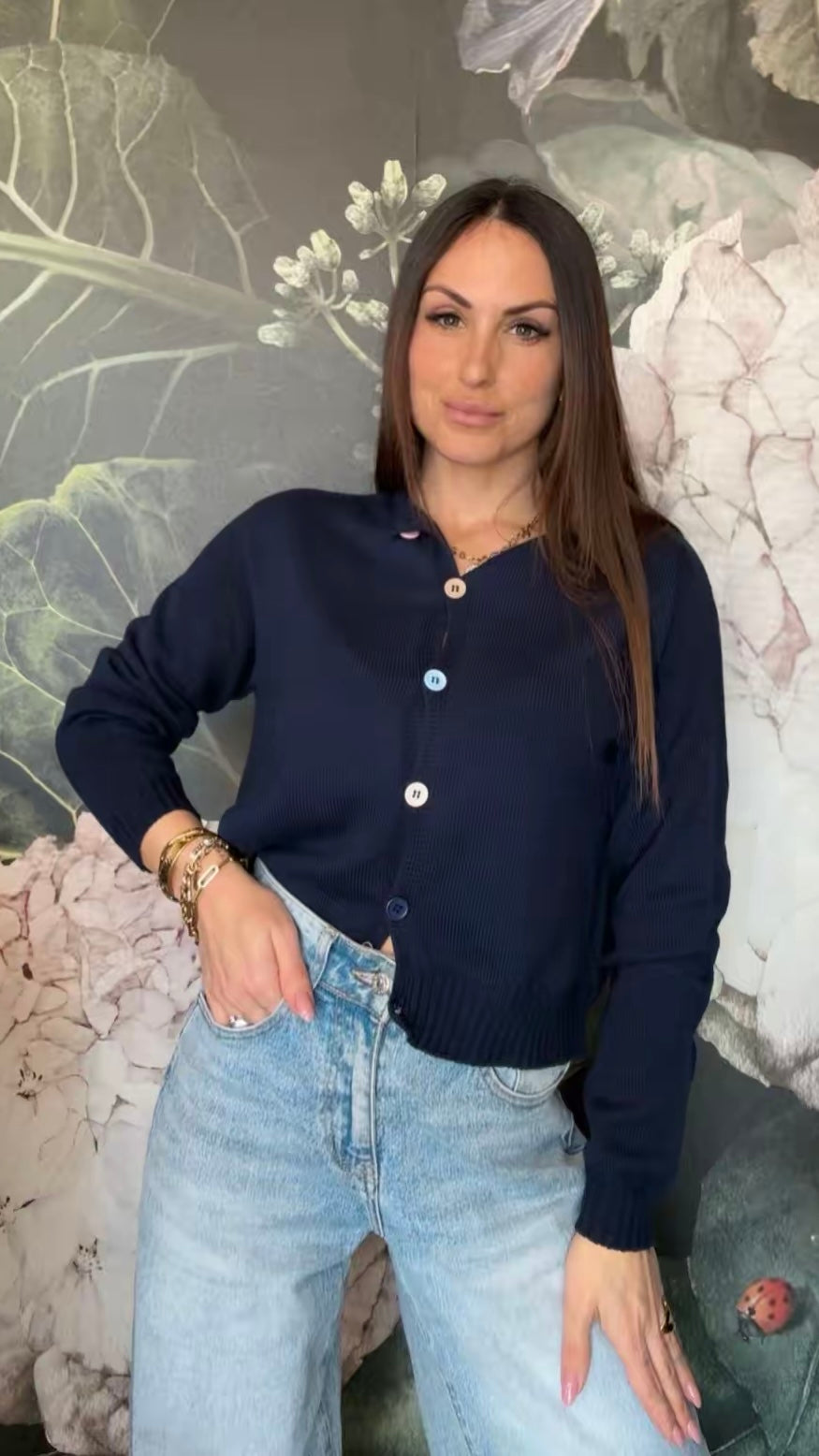 Cardigan con bottoni multicolor, girocollo, manica lunga, finiture a costine su polsini e fondo, vestibilità morbida.