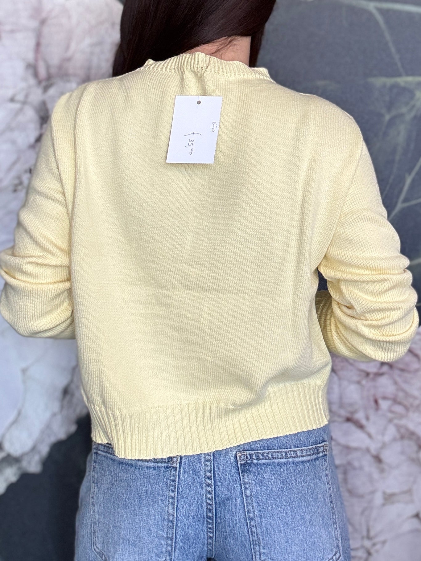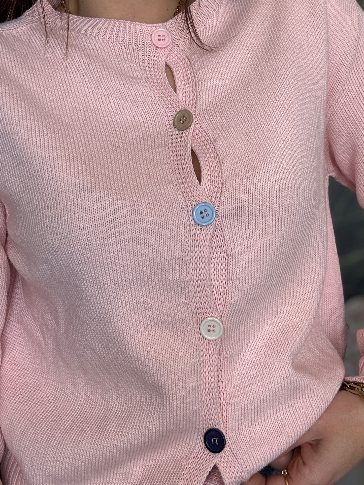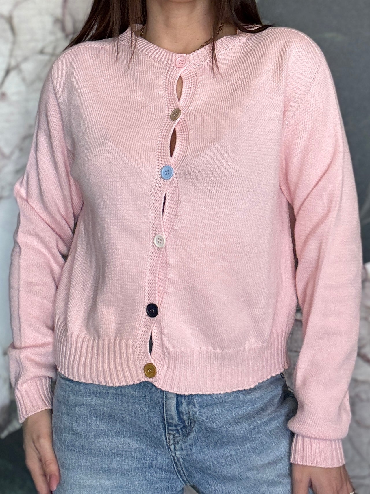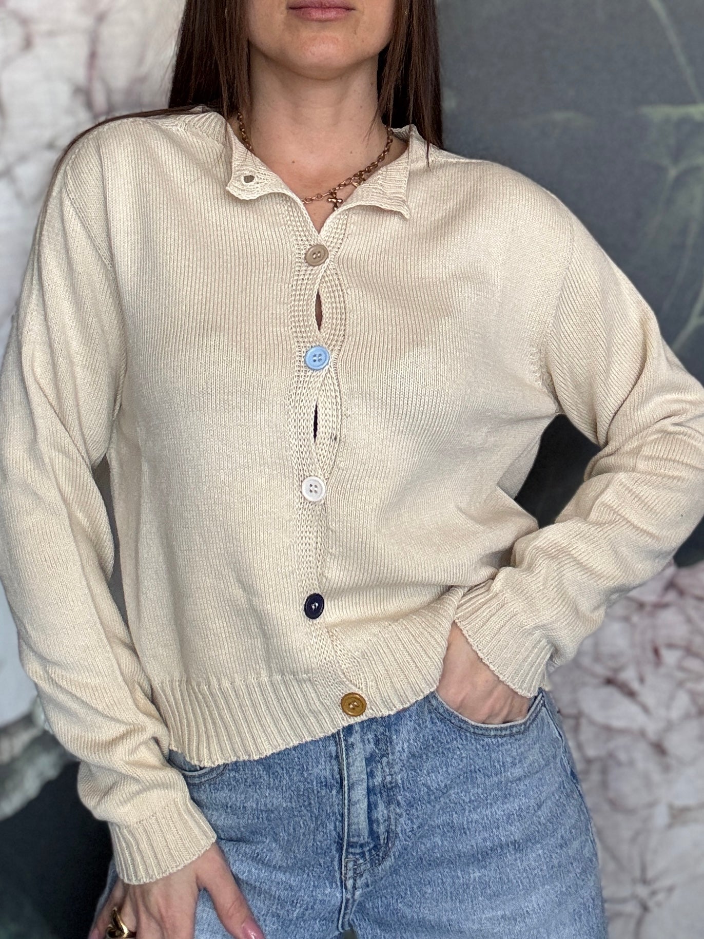 Cardigan con bottoni multicolor, girocollo, manica lunga, finiture a costine su polsini e fondo, vestibilità morbida.