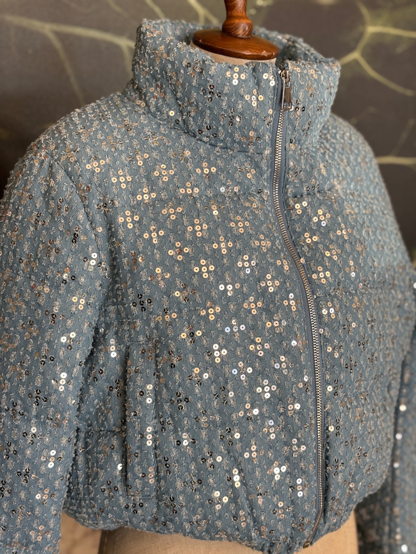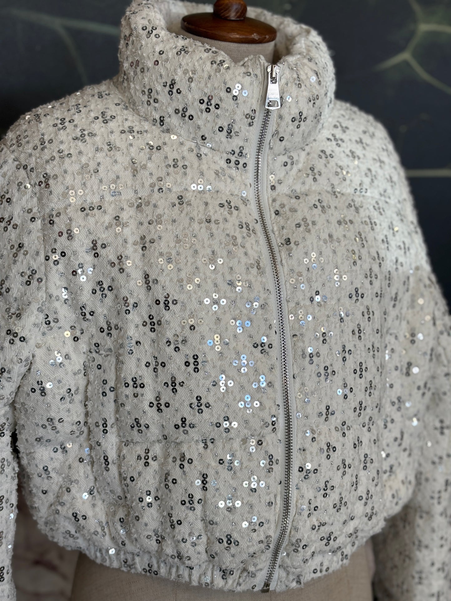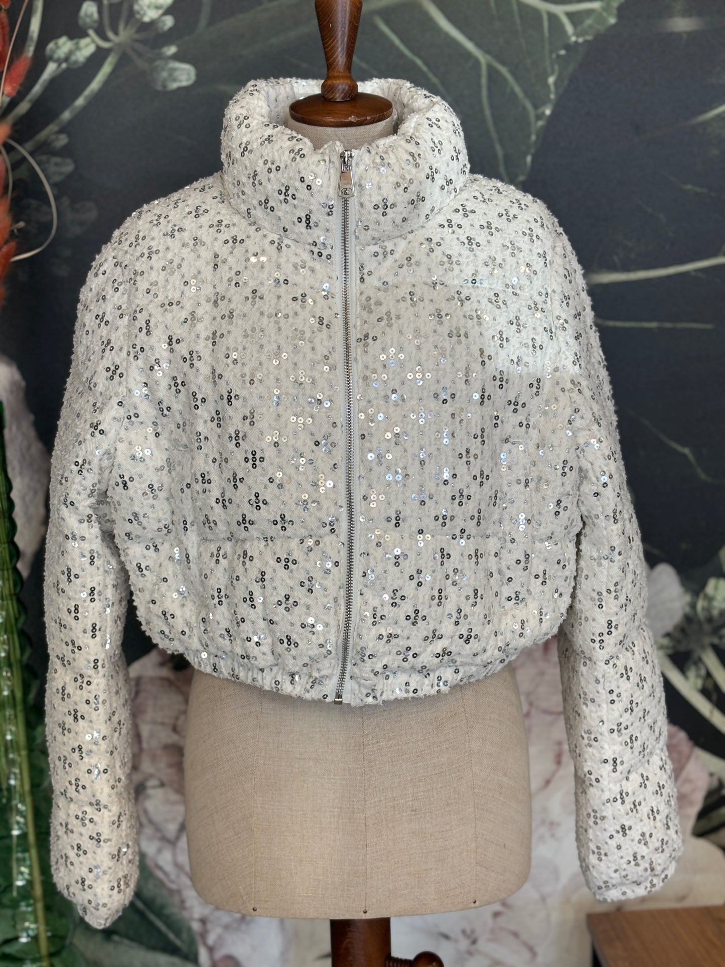 Bomberino corto, lavorazione in lurex e paillettes argentate, elastico in vita e sui polsini, tasche laterali, chiusura con zip sul davanti, fodera interna.