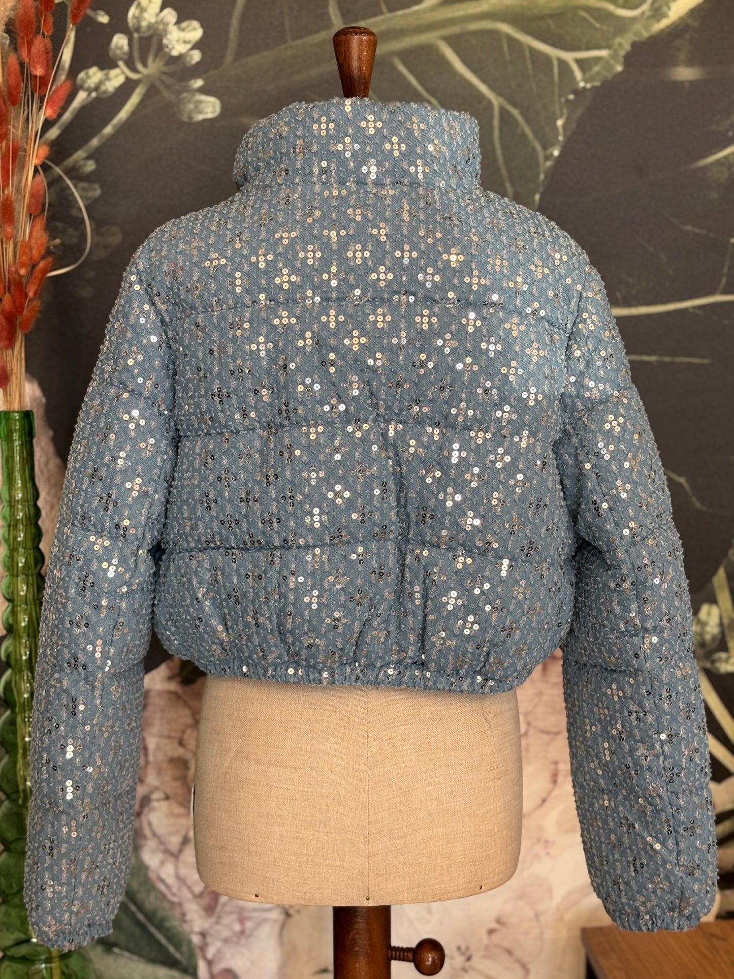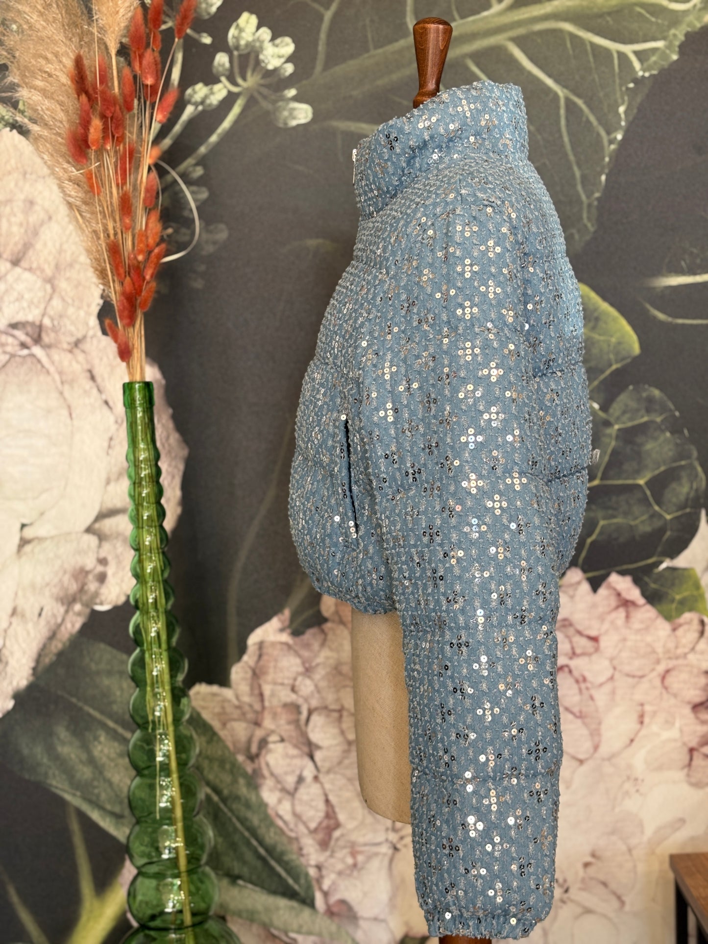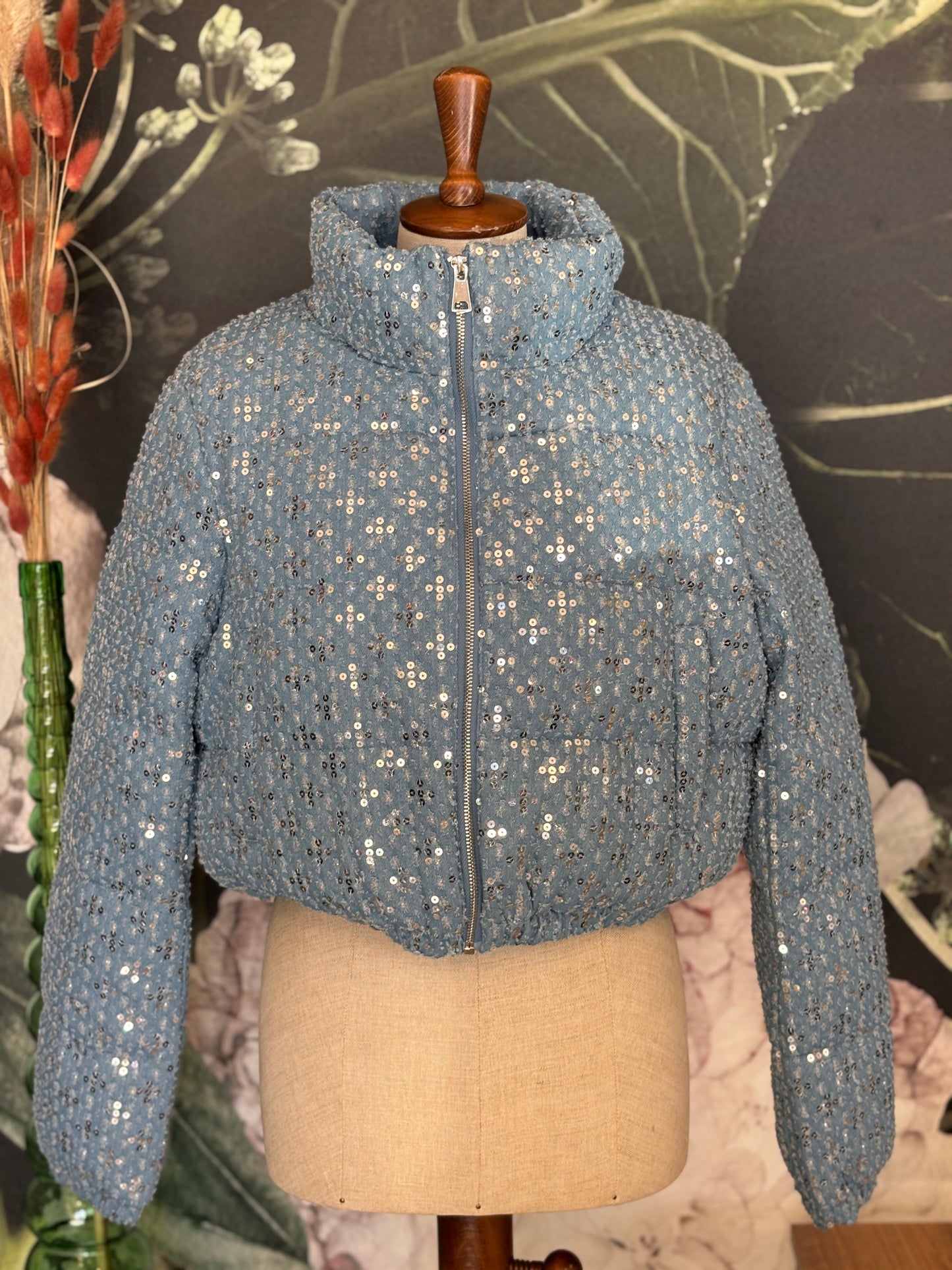 Bomberino corto, lavorazione in lurex e paillettes argentate, elastico in vita e sui polsini, tasche laterali, chiusura con zip sul davanti, fodera interna.