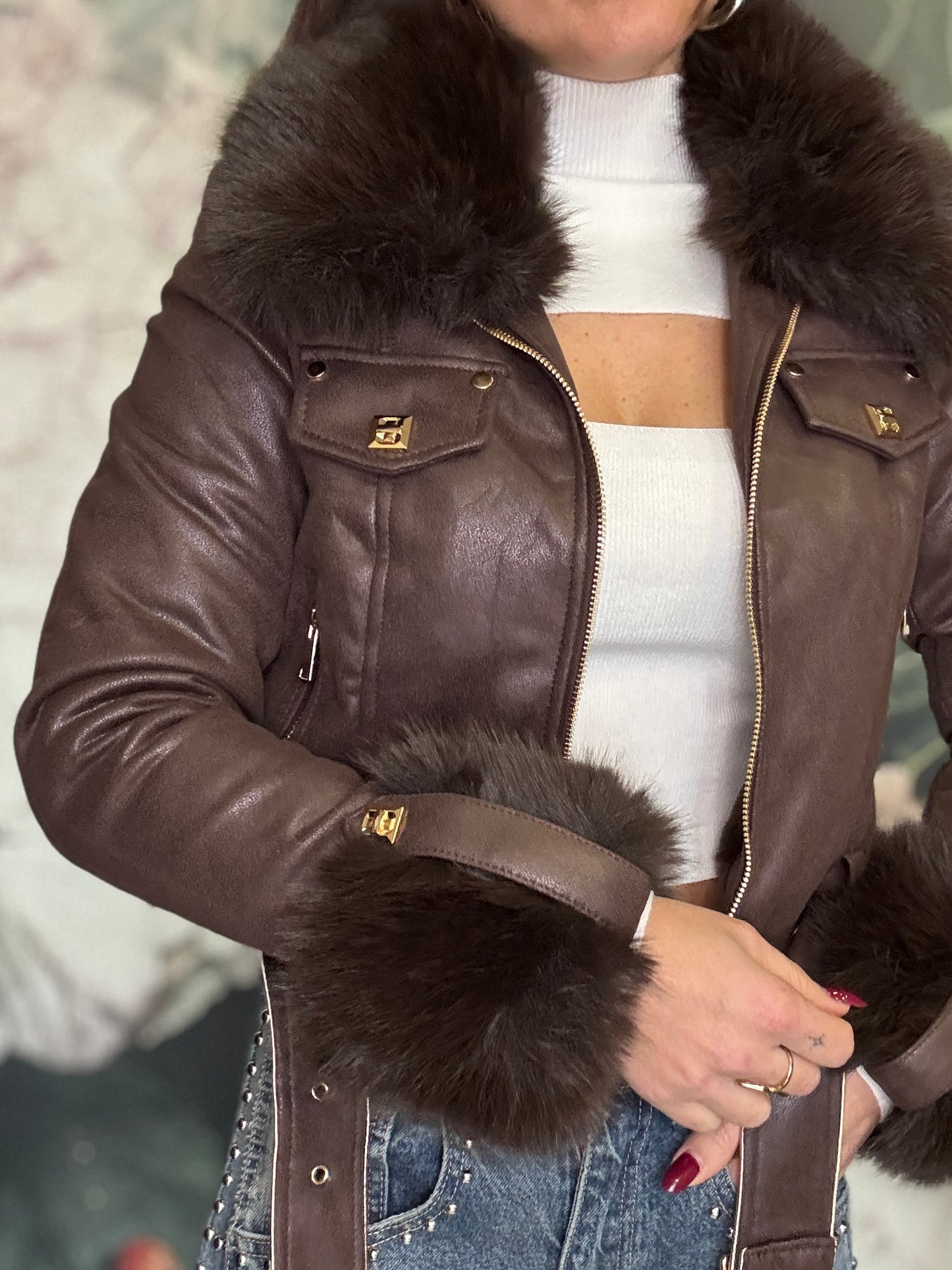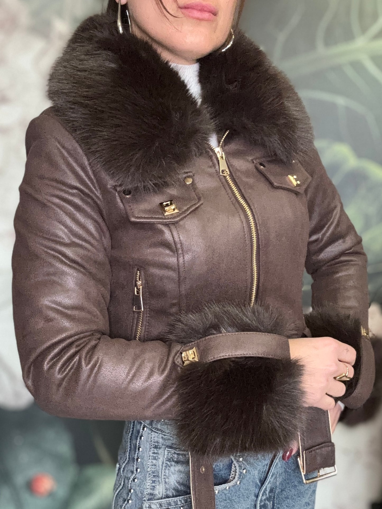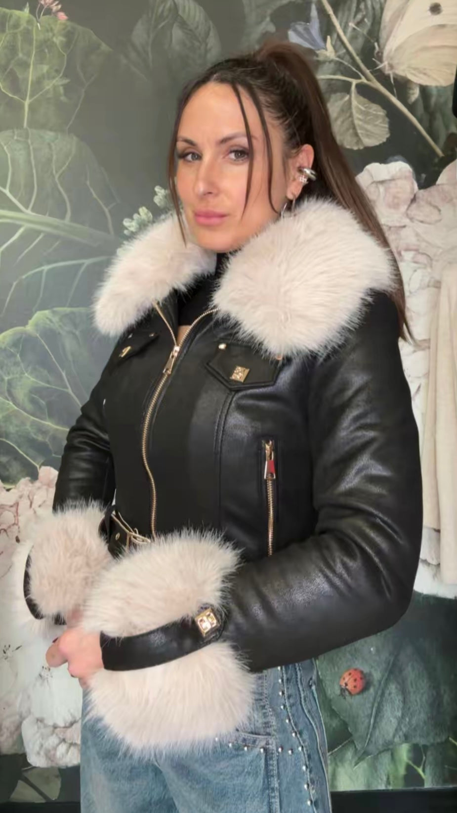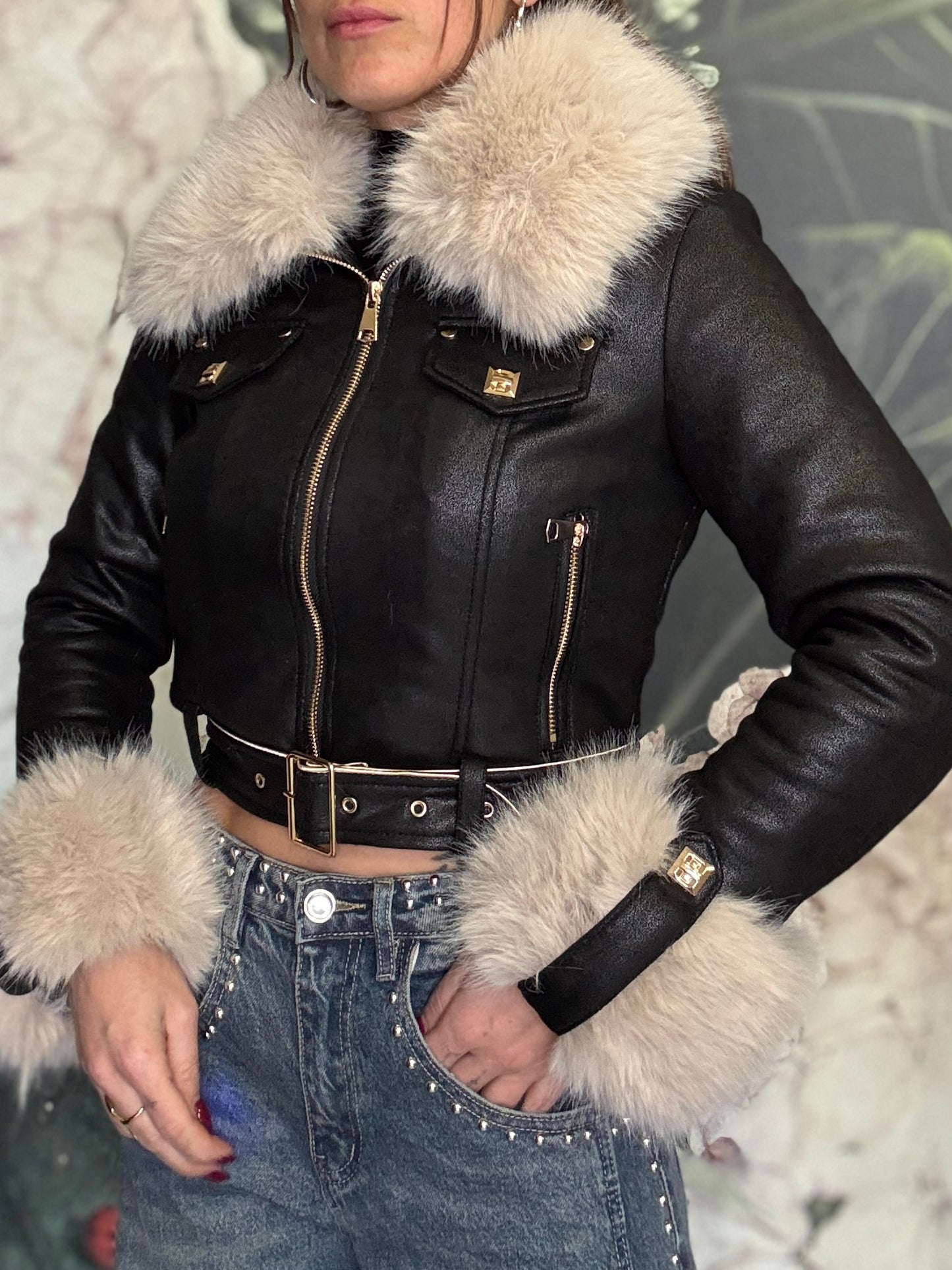 Giacca corta con colletto e polsini in eco-pelliccia removibili, chiusura frontale con zip, tasche applicate con patta è cintura regolabile in vita. imbottito con pelo internamente. Dettaglio in metallo dorado