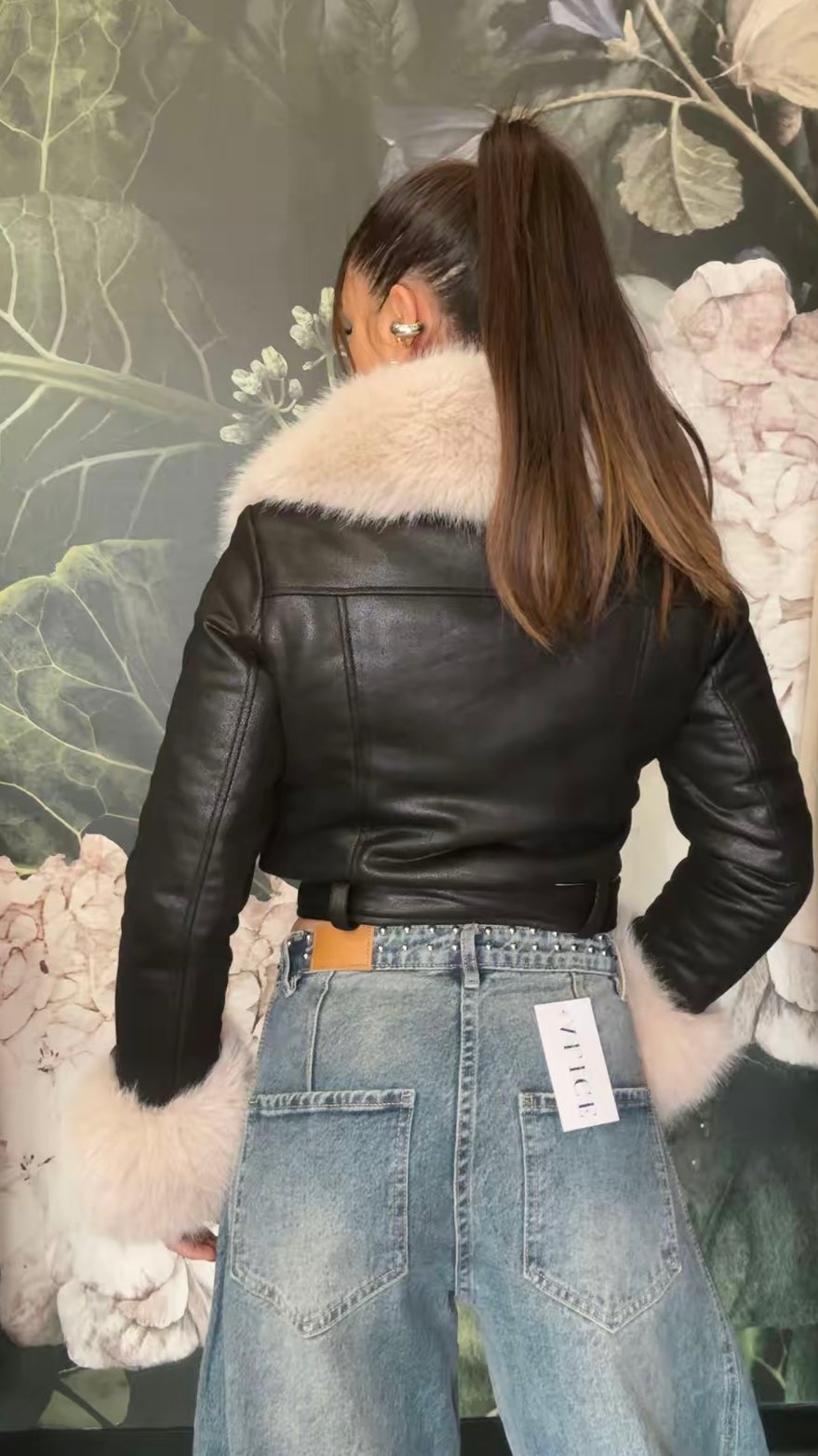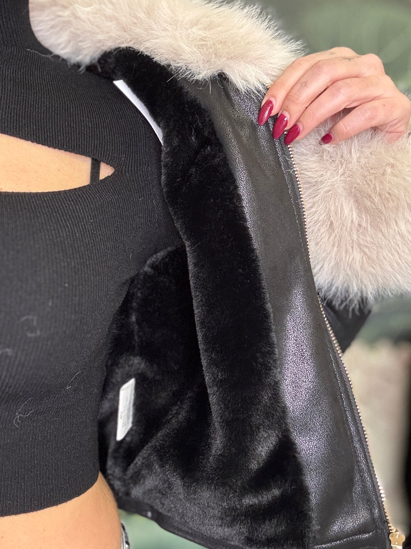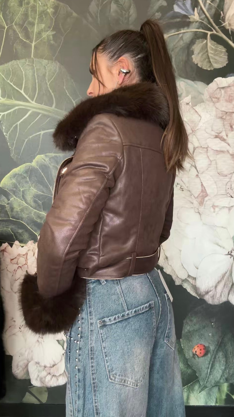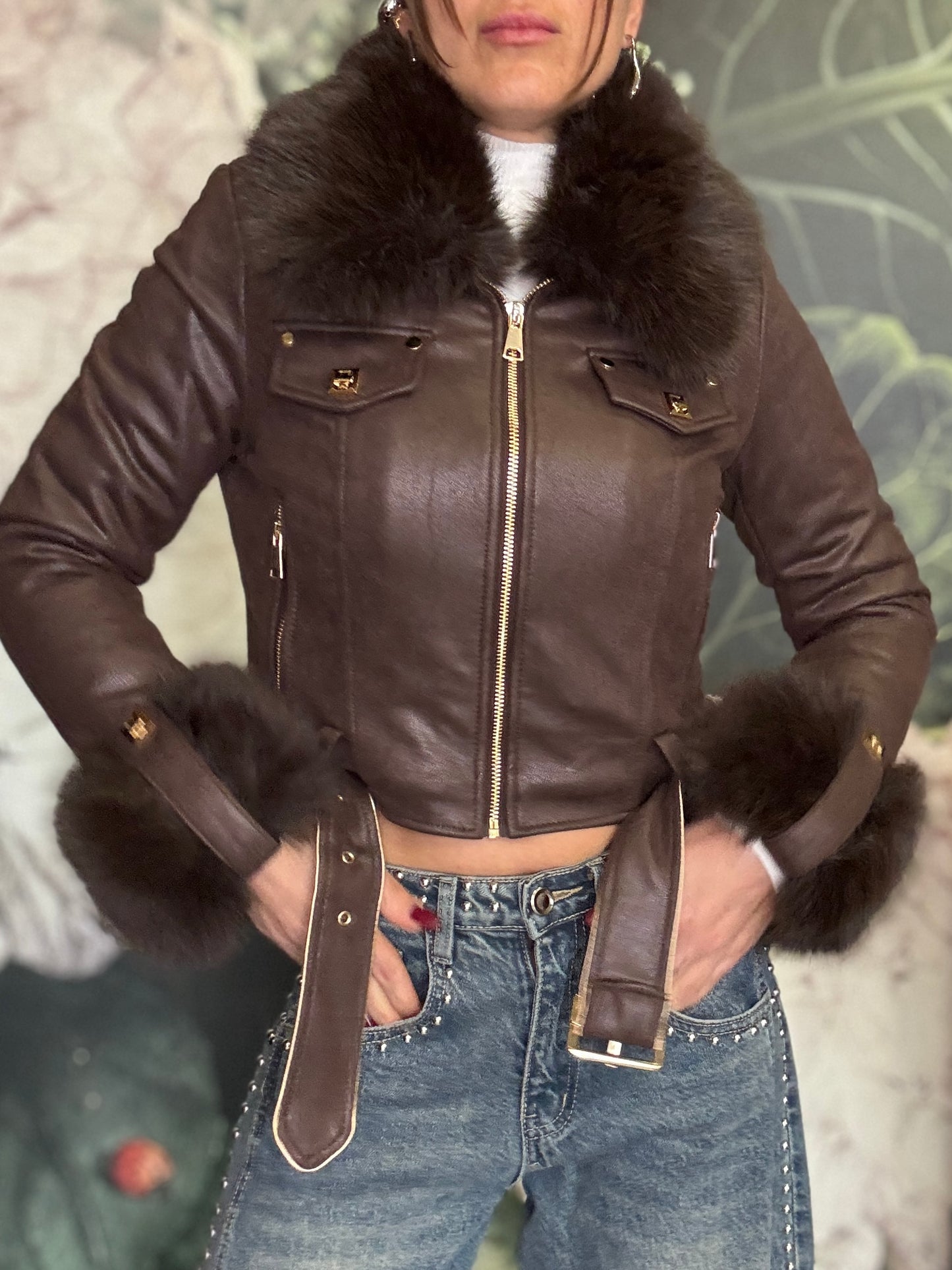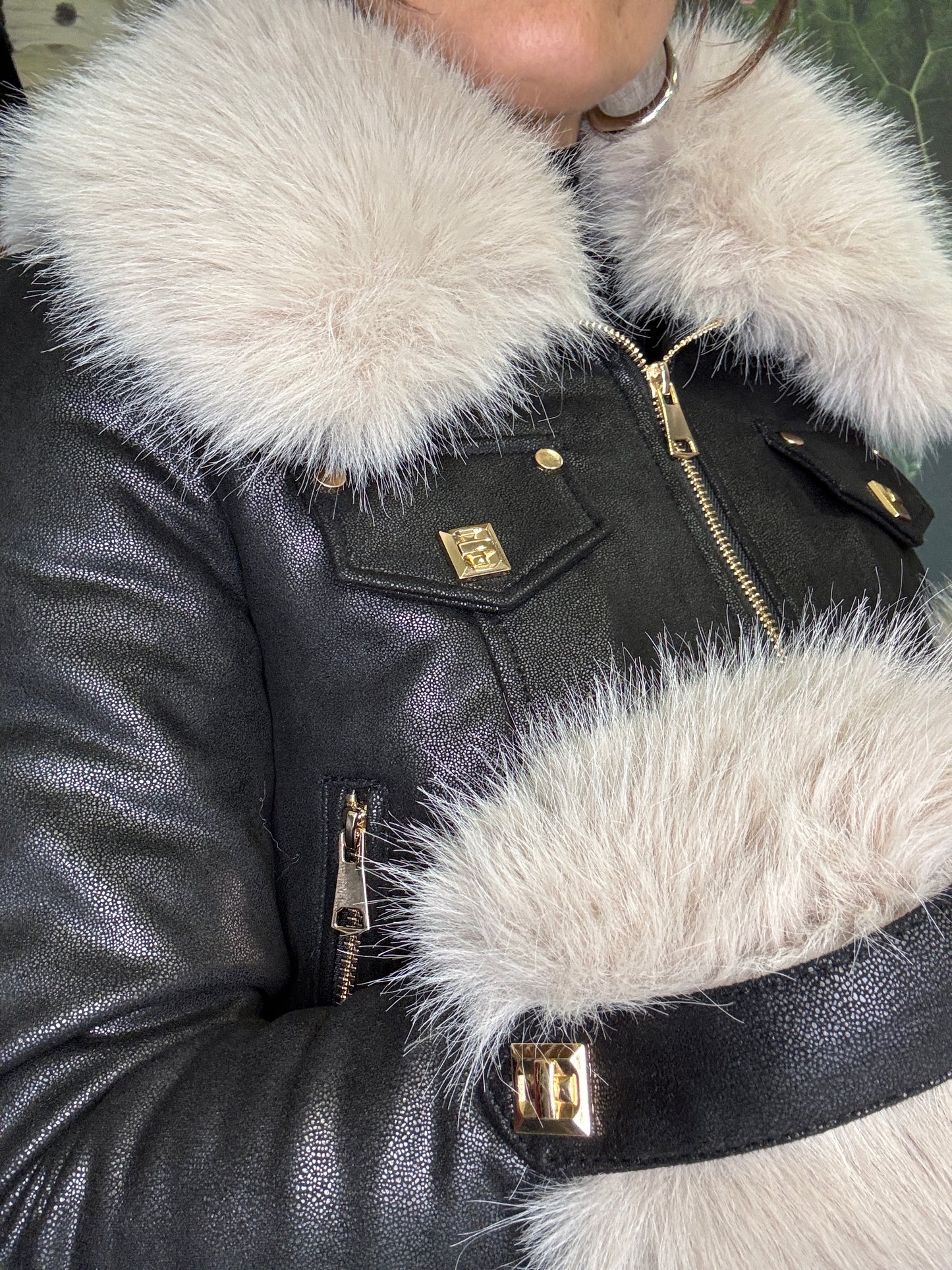 Giacca corta con colletto e polsini in eco-pelliccia removibili, chiusura frontale con zip, tasche applicate con patta è cintura regolabile in vita. imbottito con pelo internamente. Dettaglio in metallo dorado