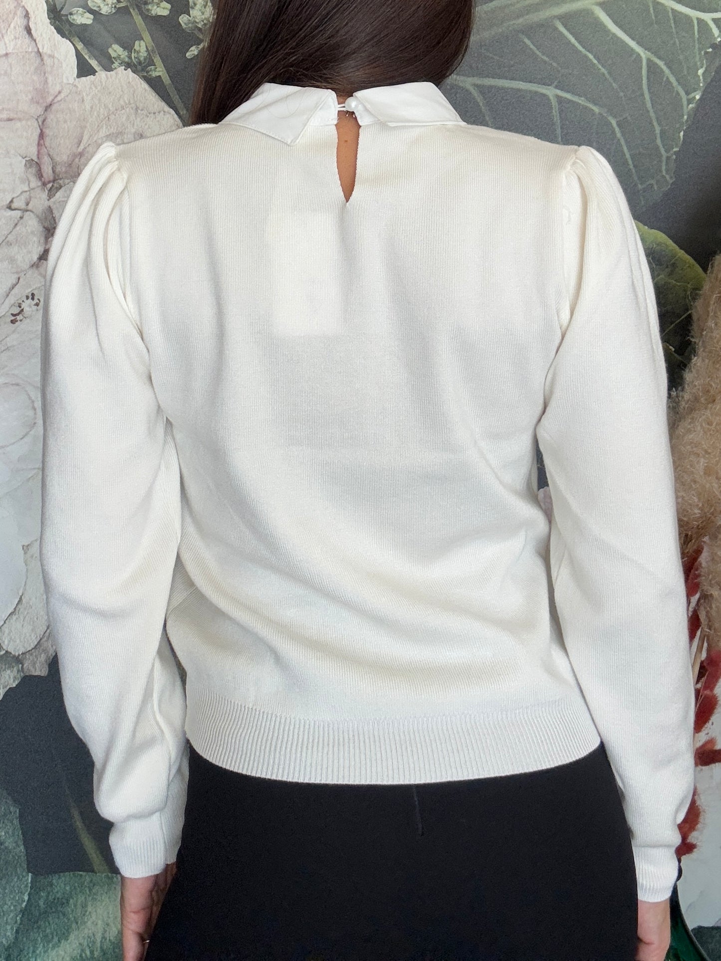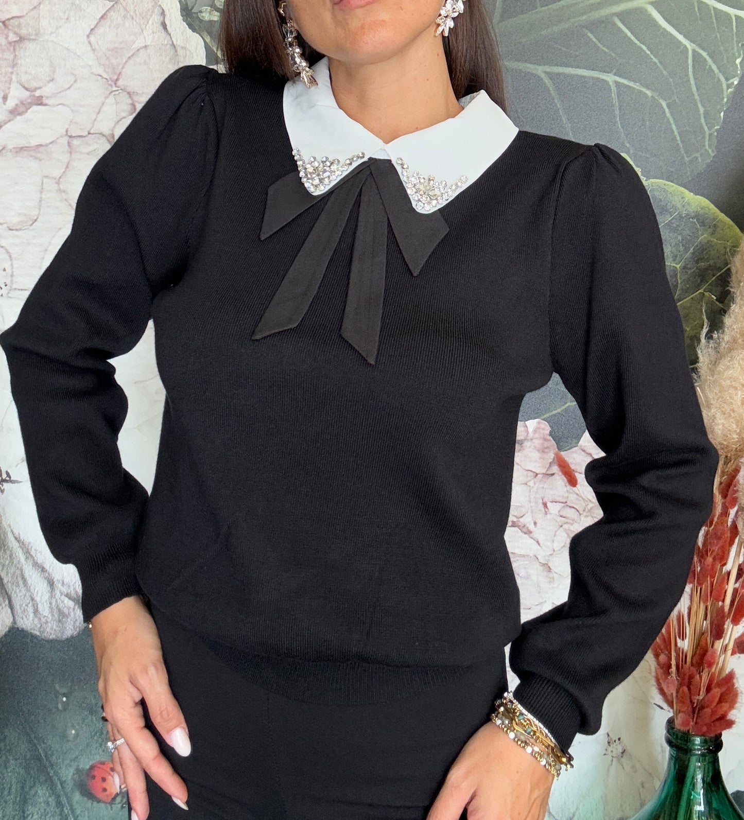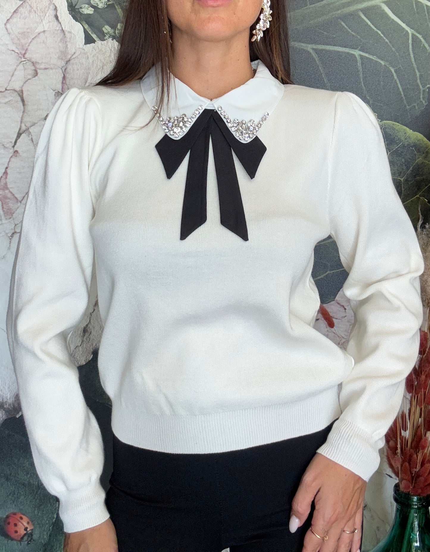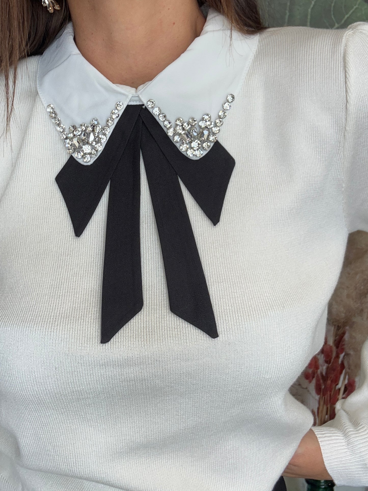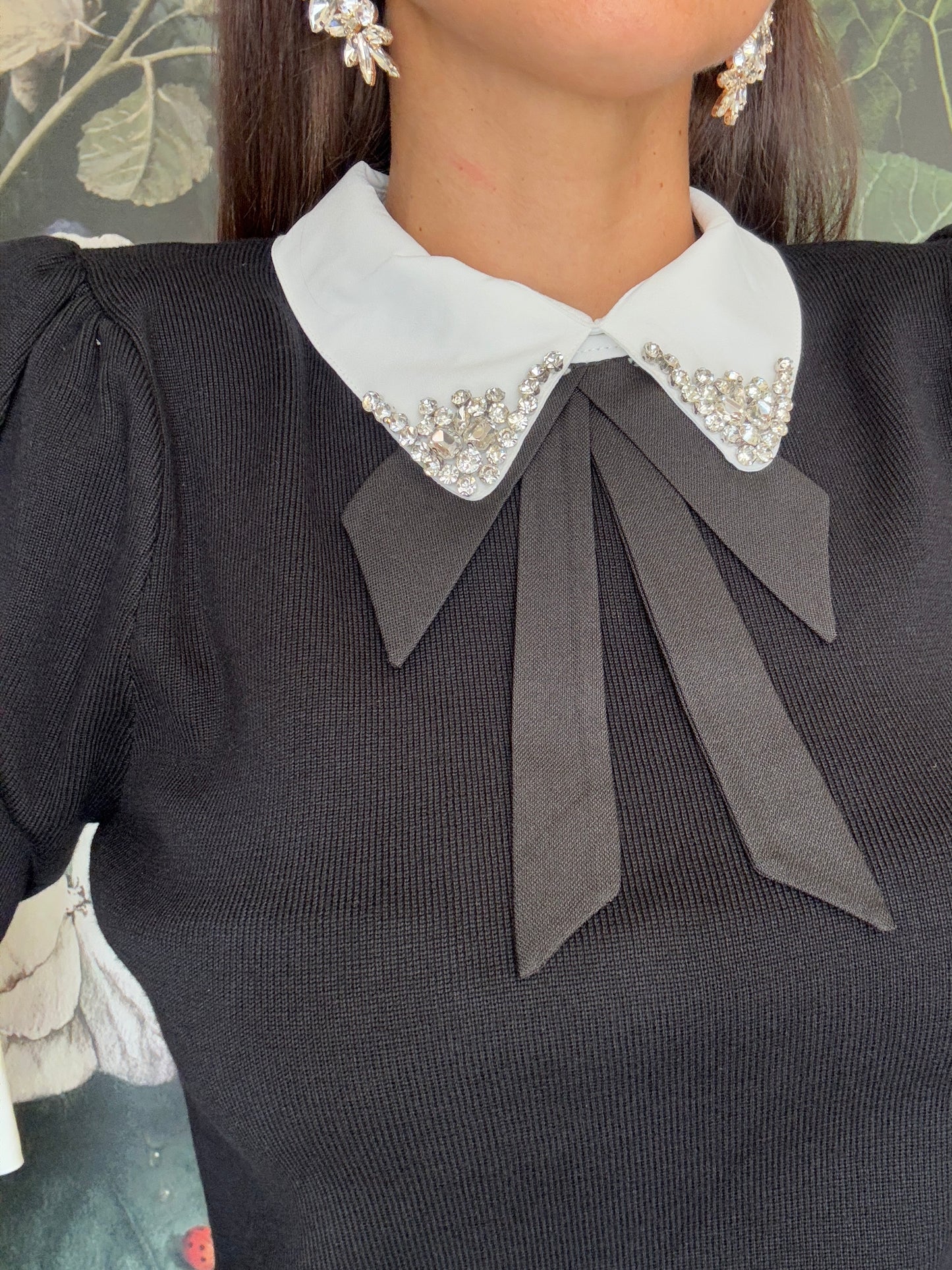Maglioncino in maglia fine con maniche lunghe leggermente a sbuffo sulle spalle, particolare il colletto arricchito con brillantini ricamati che lo rendono luminoso e sofisticato. Il grande nastro nero applicato al centro del colletto don al capo un look Bon Ton .