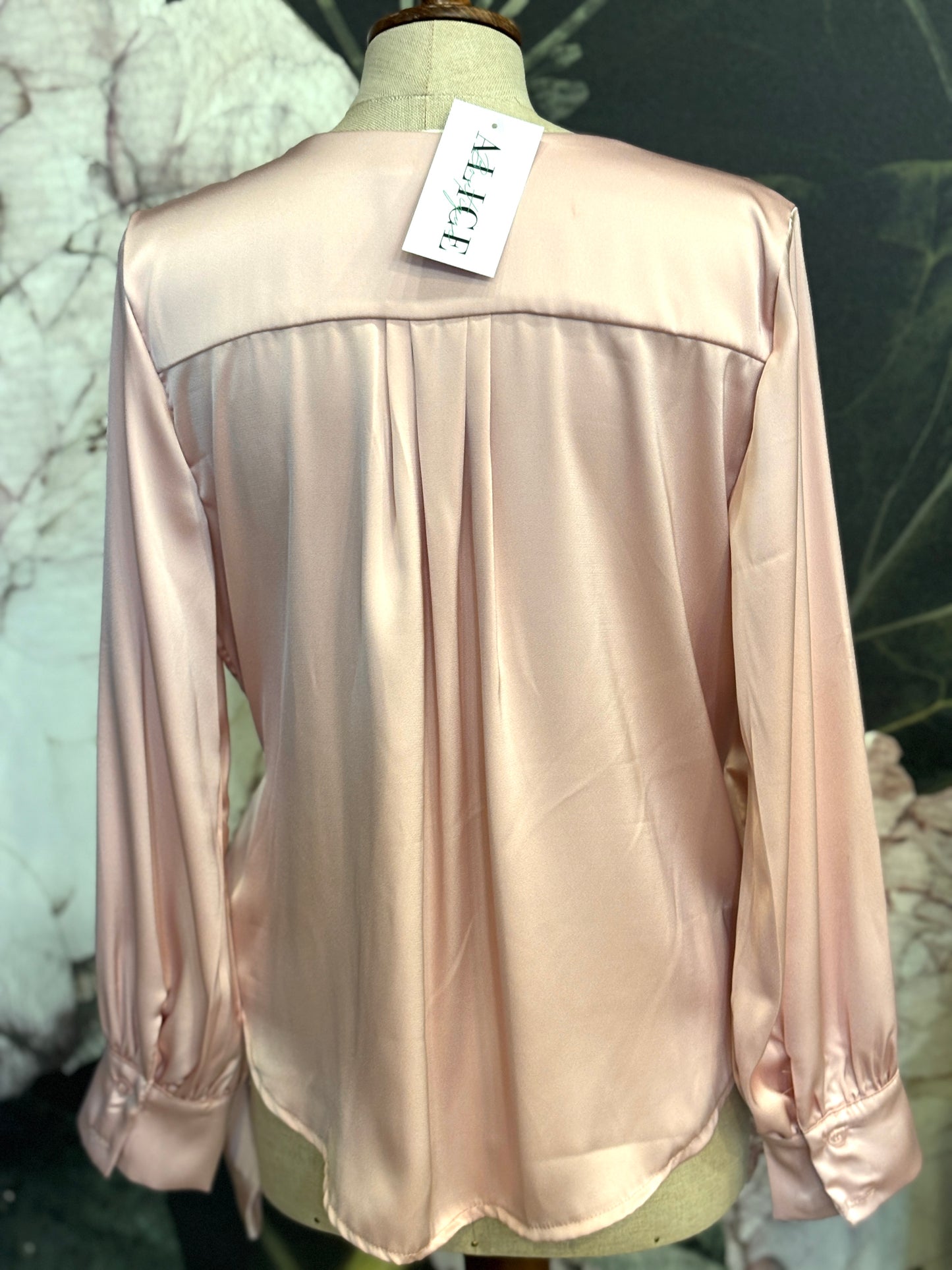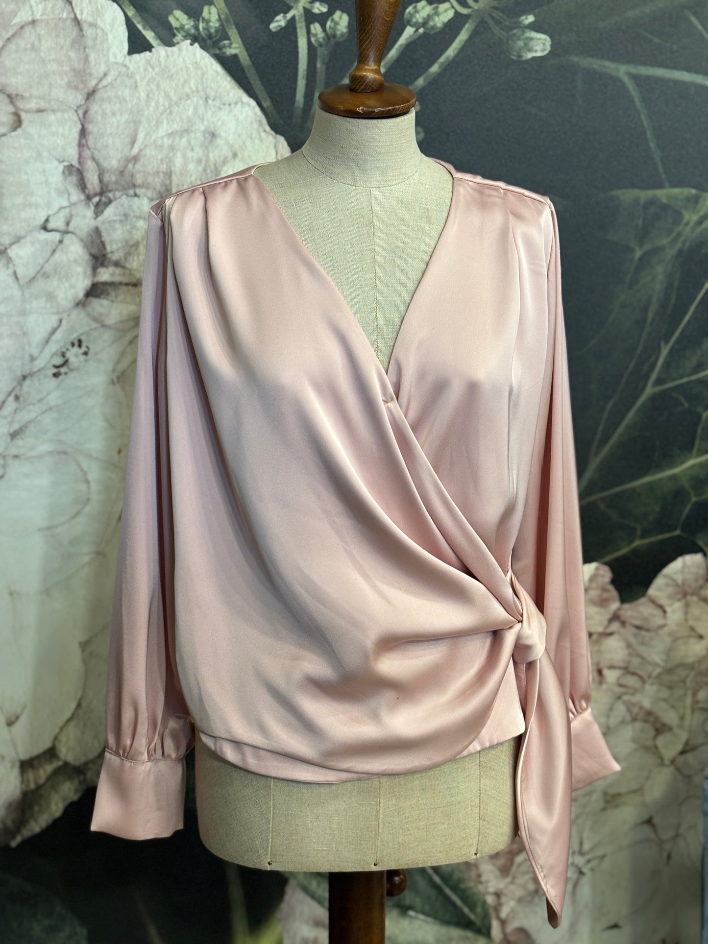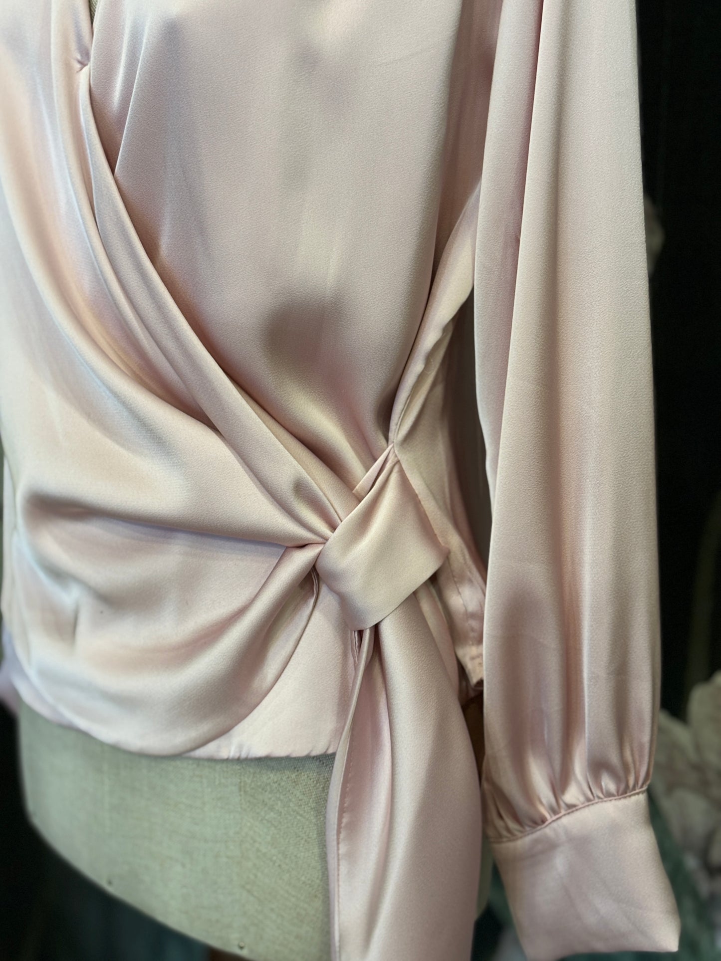 Camicia - Blusa, scollo a V , con nodo laterale fisso. Più corta davanti e più lunga sul retro, manica a palloncino con polsino finale. Ideale per un outfit elegante o casual.