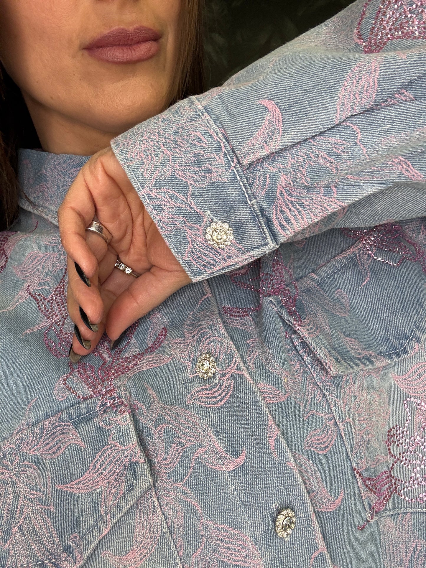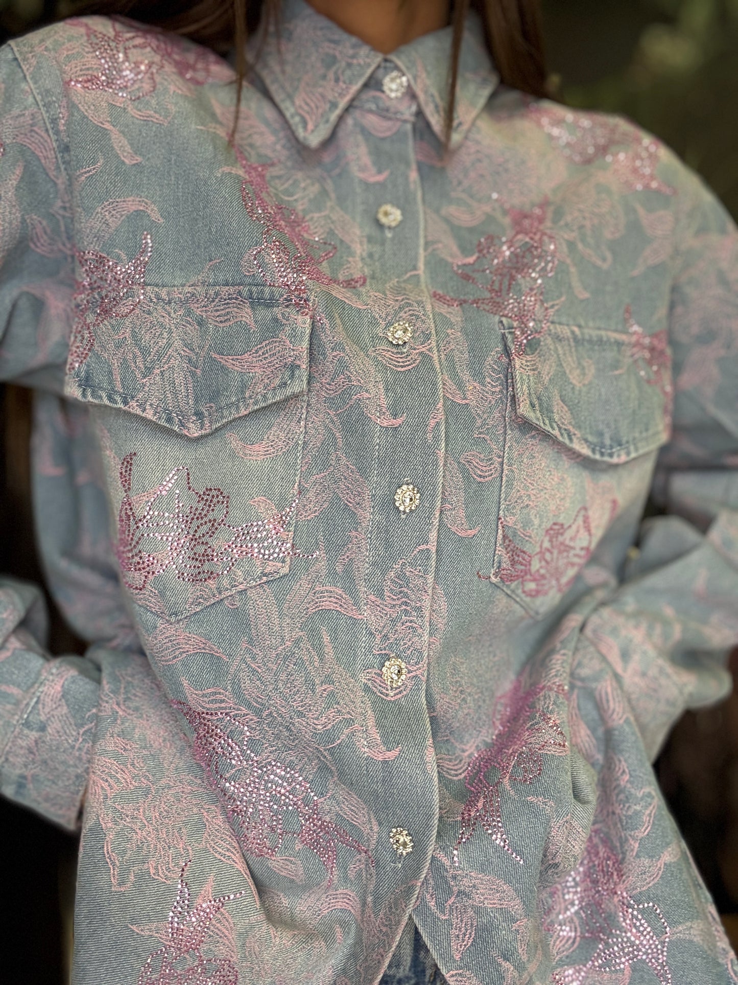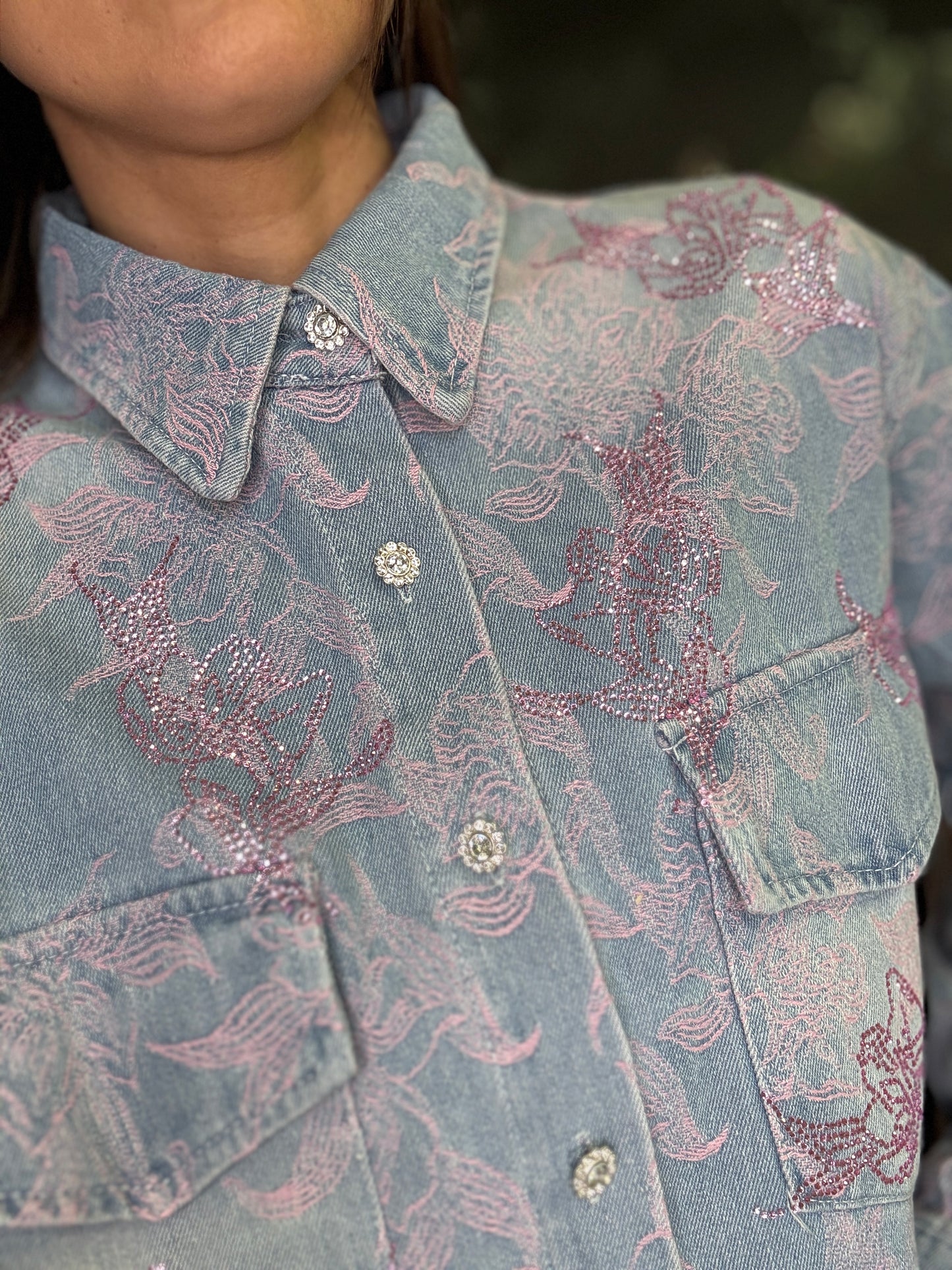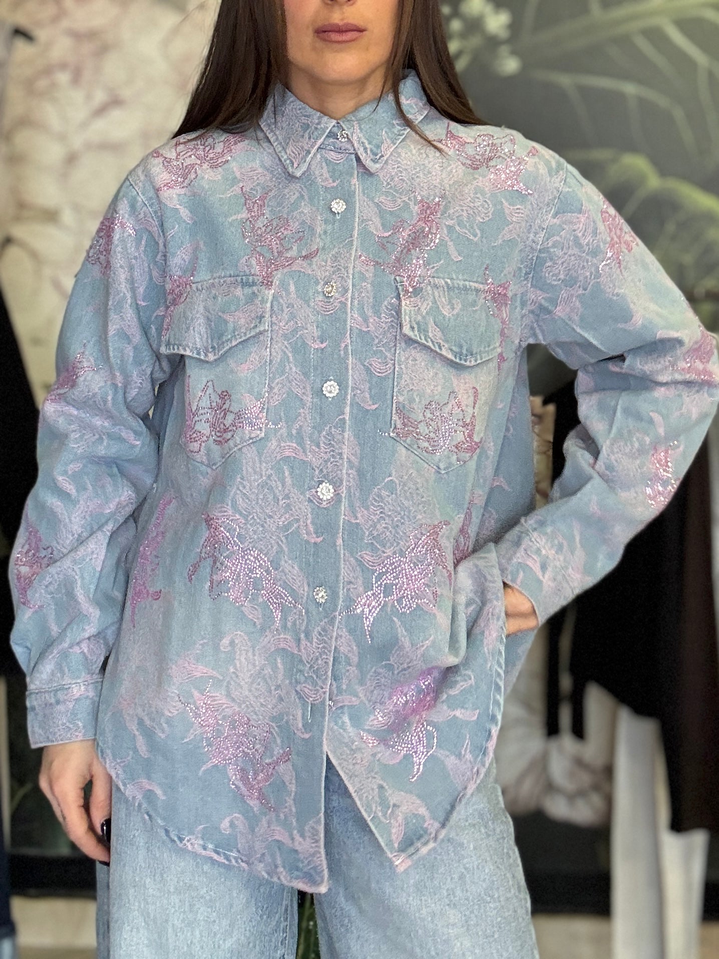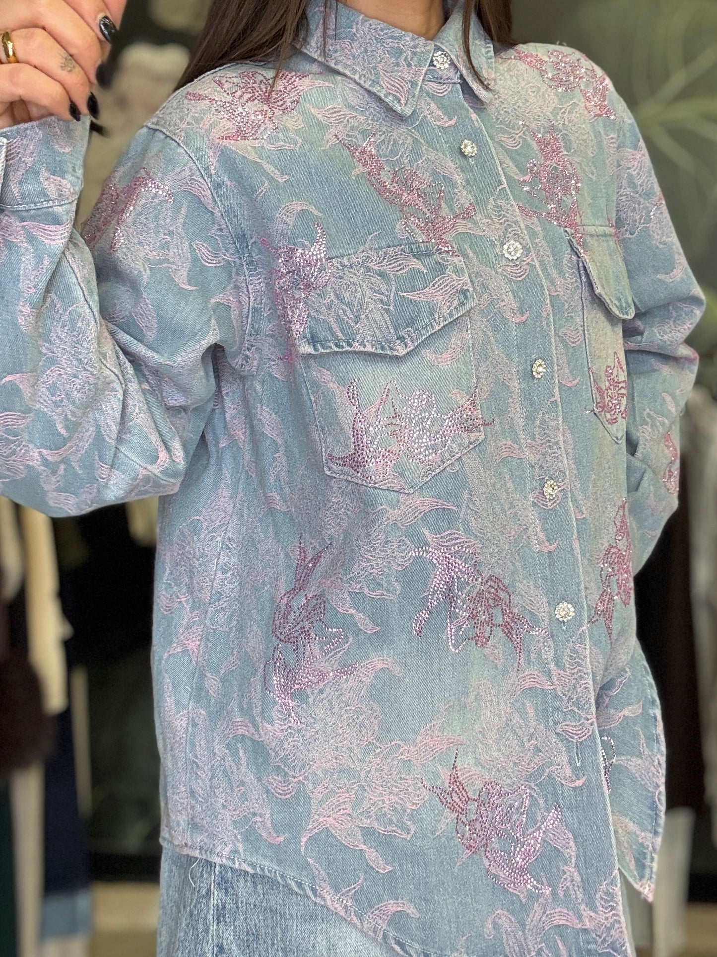 Camicia overshit in tessuto jacquard con motivo floreale in rilievo, caratterizzata da una vestibilità morbida e contemporanea. Il design presenta colletto classico, chiusura frontale con bottoni e due tasche applicate sul petto con patta. La texture ricercata unisce una base color jeans a dettagli floreale rosa, creando un elegante gioco di contrasti. Ideale da indossare sia come camicia che come giacca leggera per completare i look.