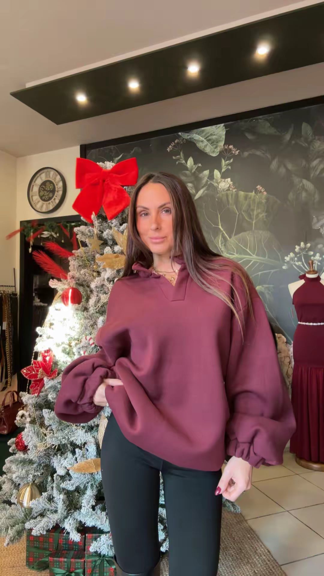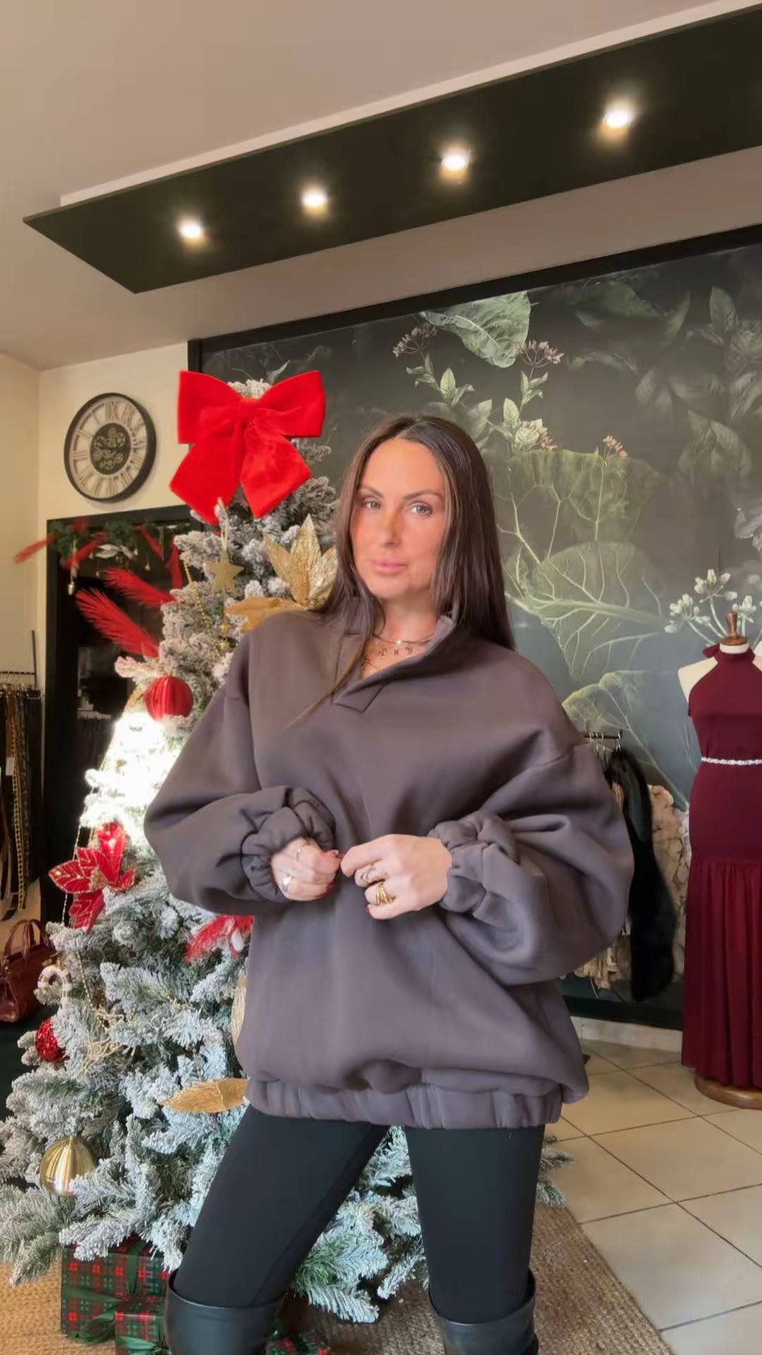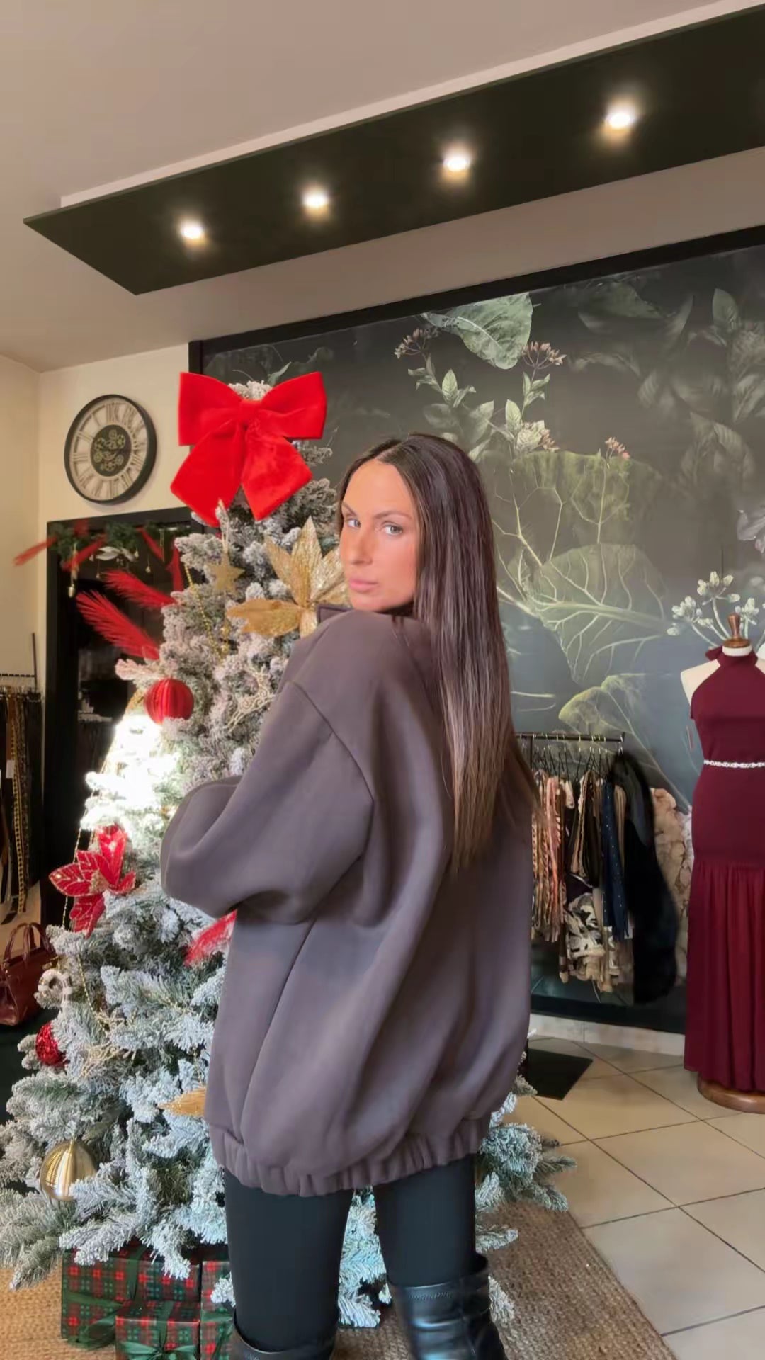 Felpa oversize / abito corto in felpa realizzato in tessuto morbido e confortevole. Collo alto con apertura a V che dona carattere e slancia la figura. Il fondo è rifinito con bordo elasticizzato che crea un effetto leggermente blusato e rende il capo pratico e versatile. Linea pulita, senza stampe, perfetta per chi ama uno stile essenziale ma curato.
