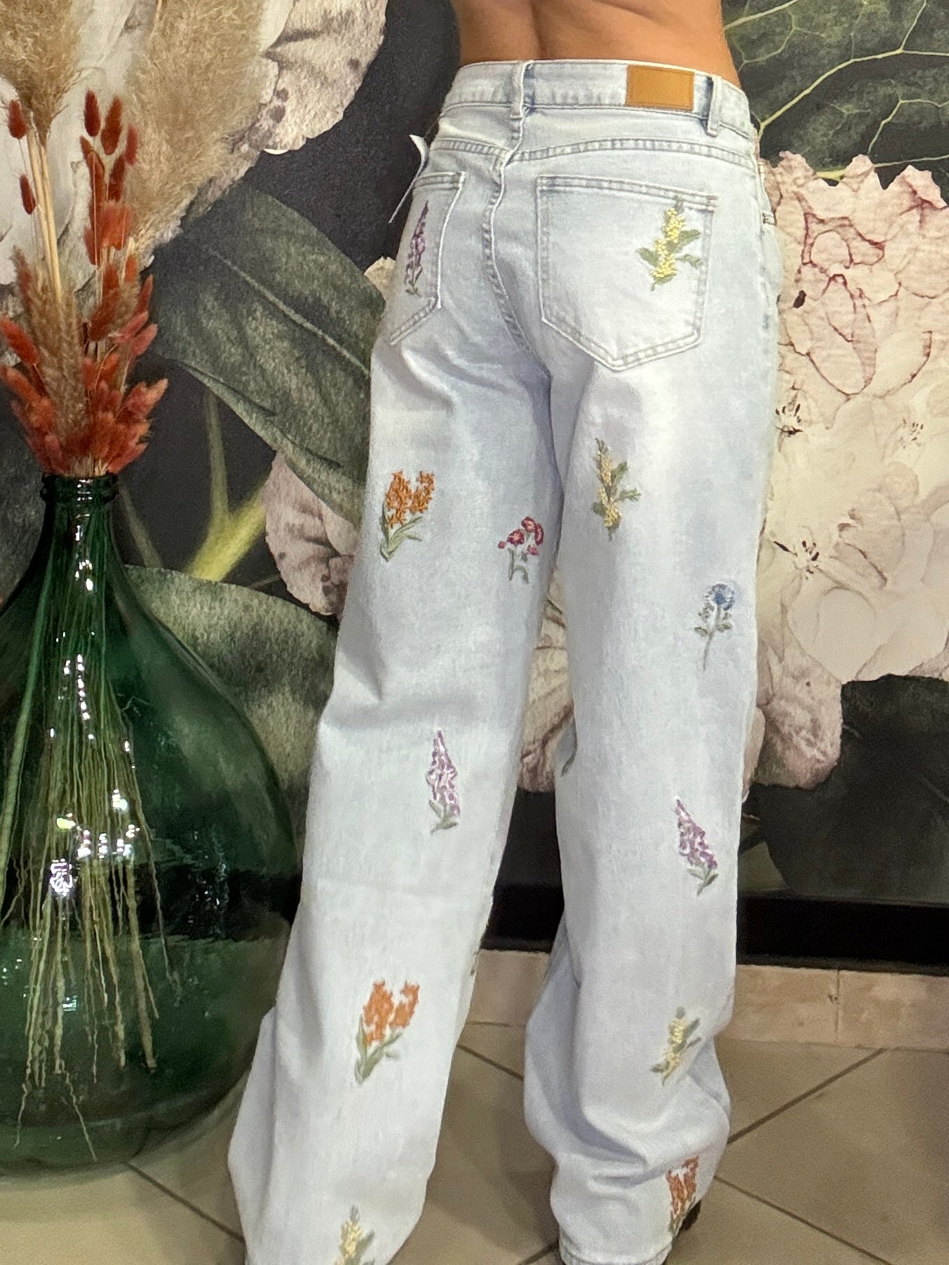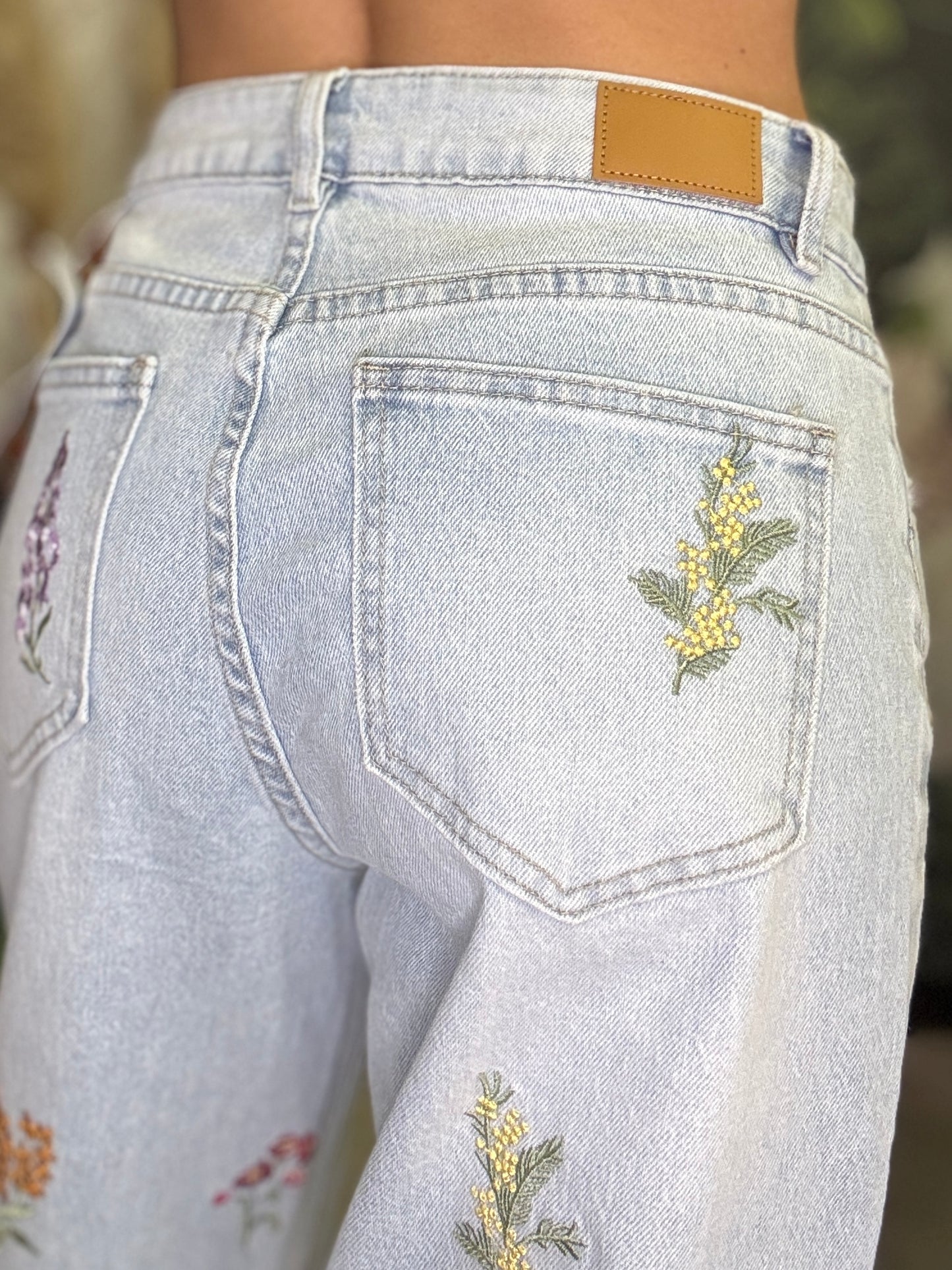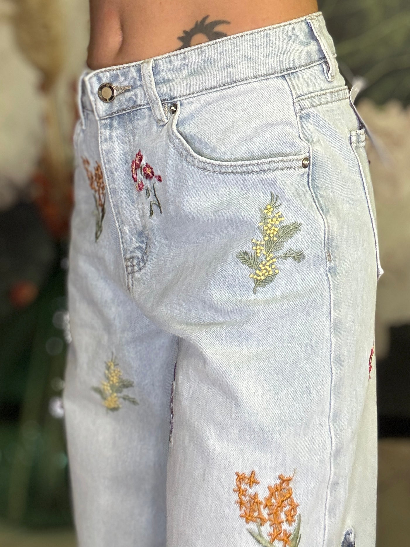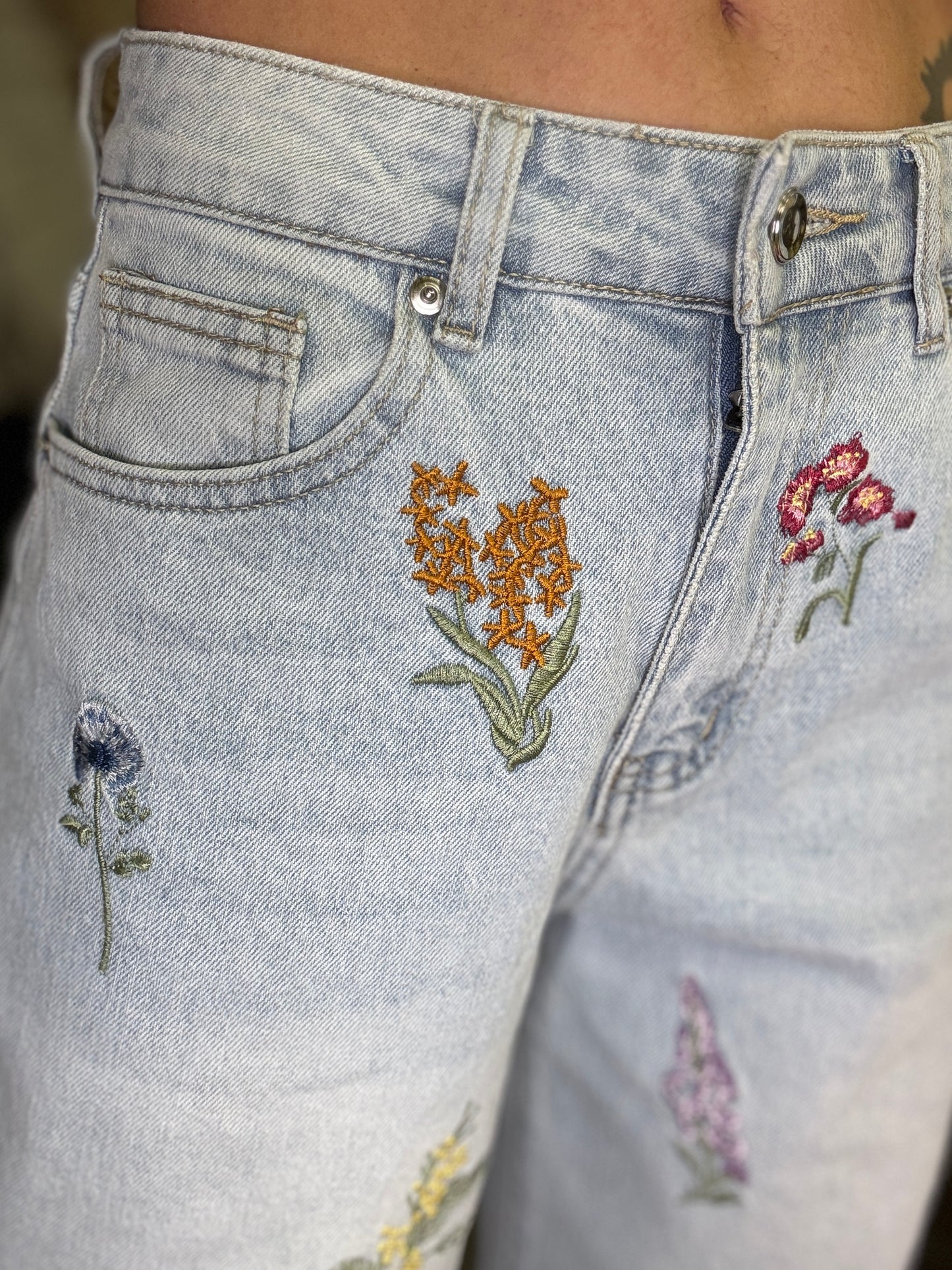Jeans modello 5 tasche in denim chiaro effetto washed, gamba dritta, vita alta, ricami colorati lungo tutta la gamba sia frontali che sul retro della gamba, chiusura con bottoni e zip, modello 5 tasche.