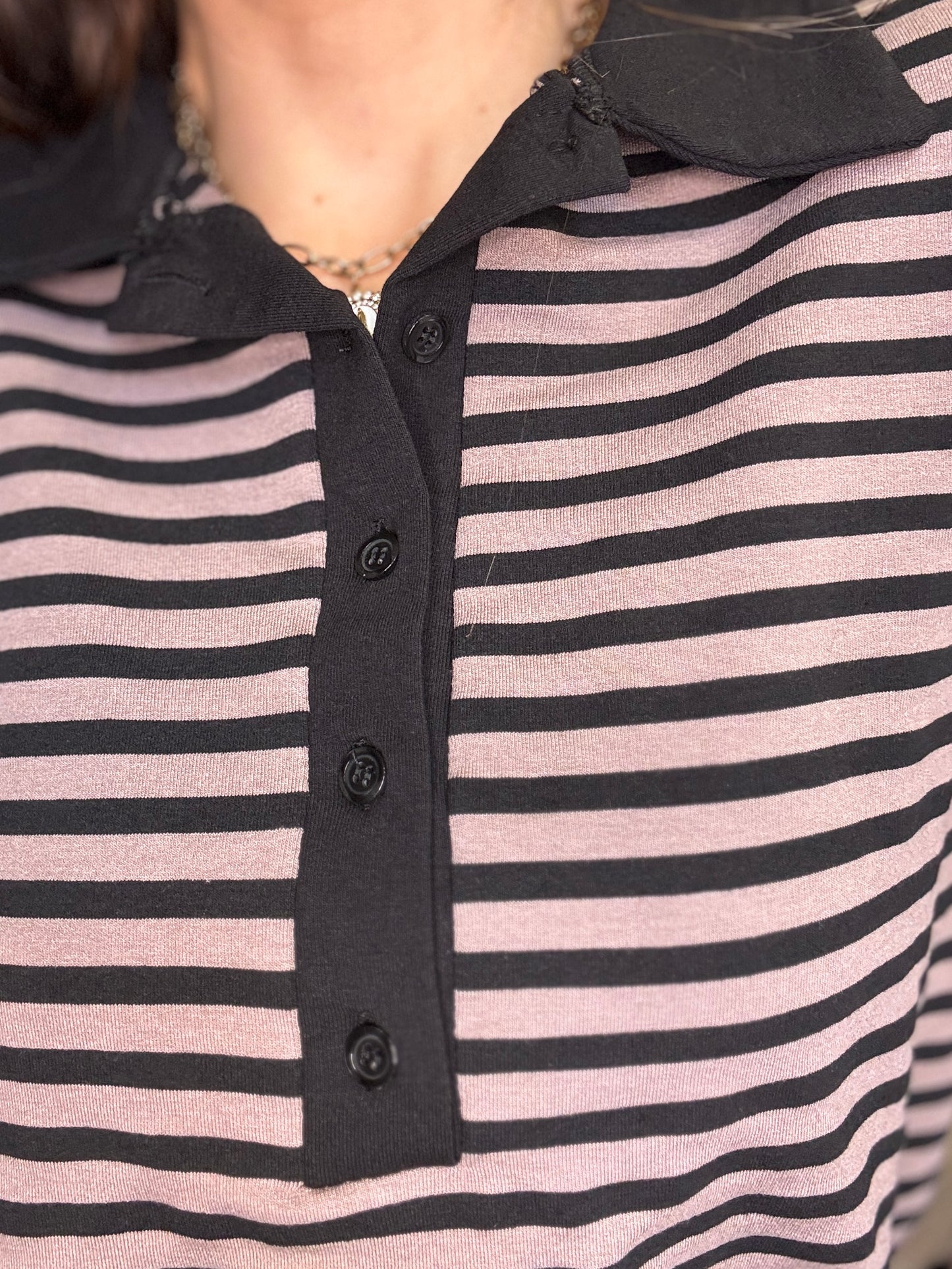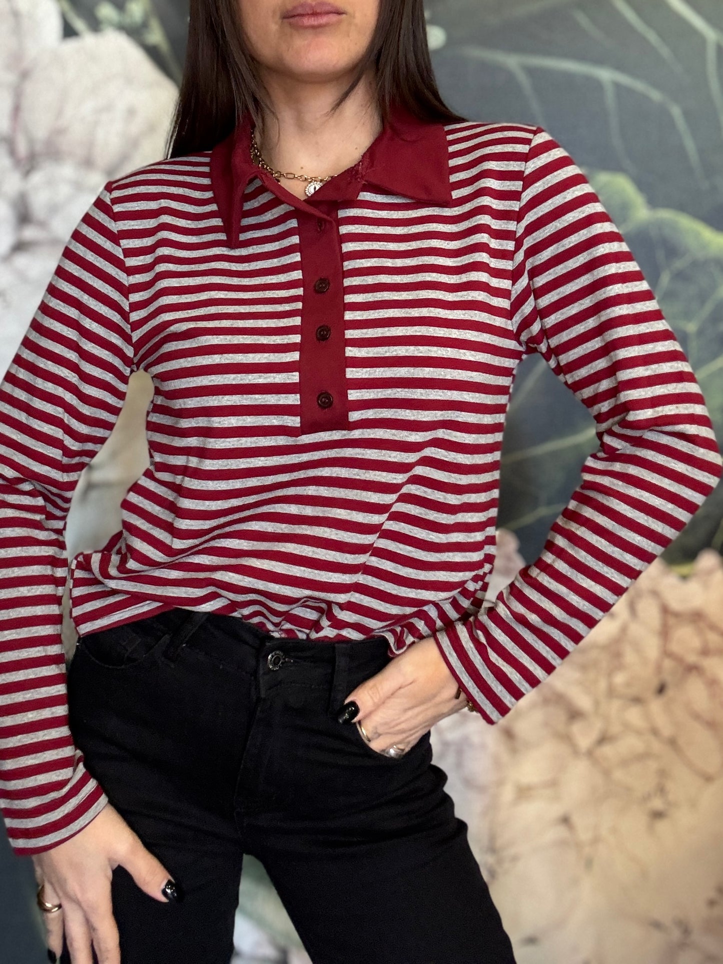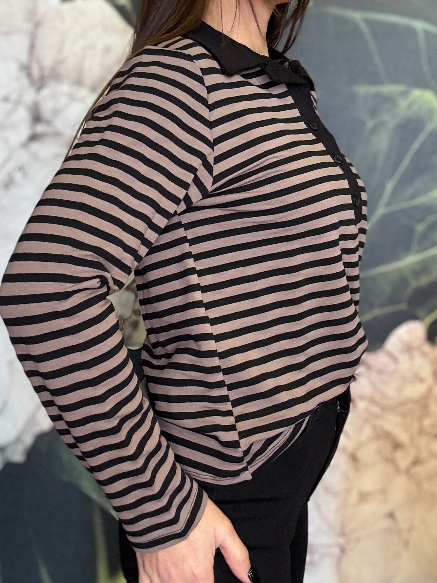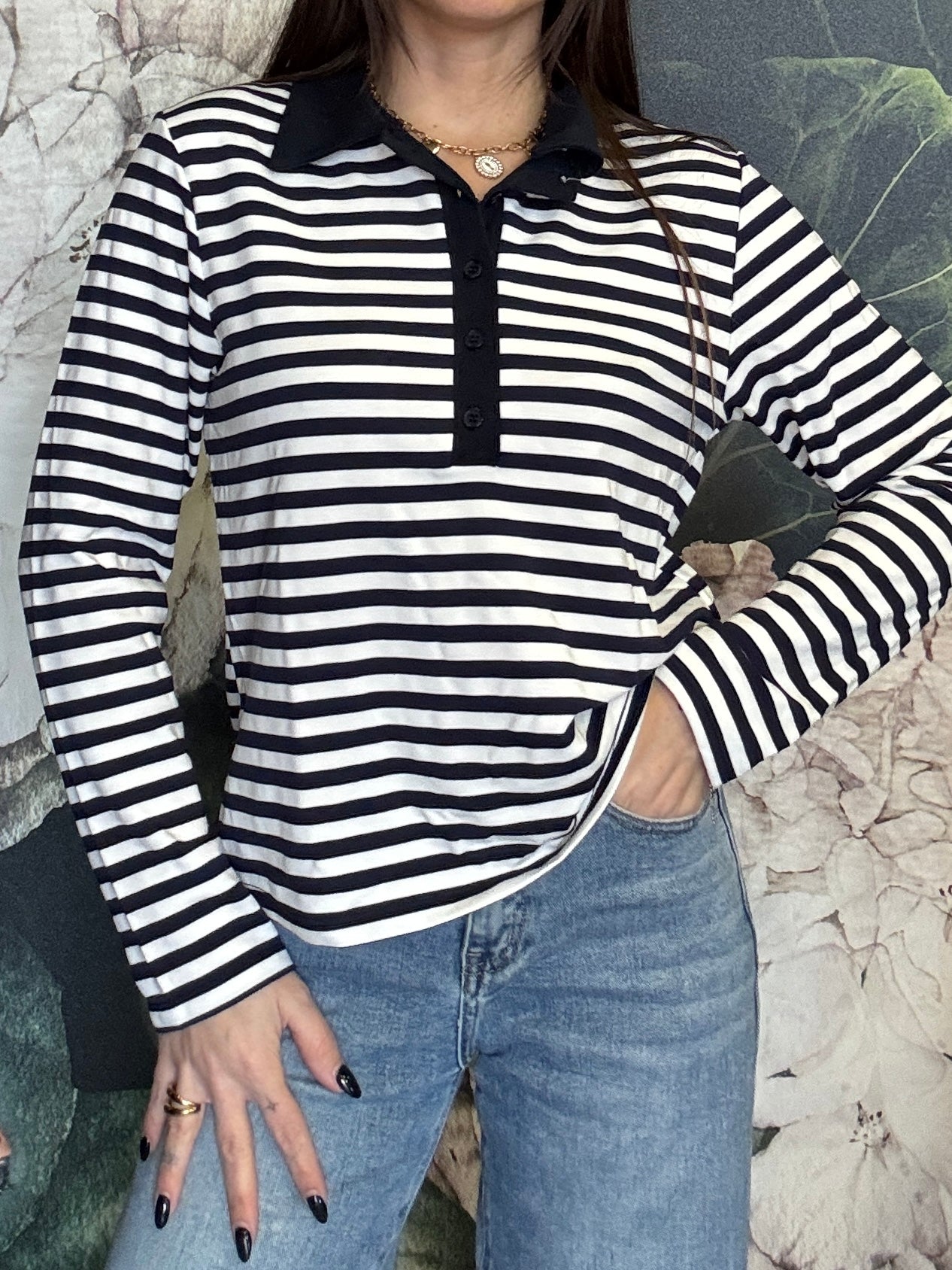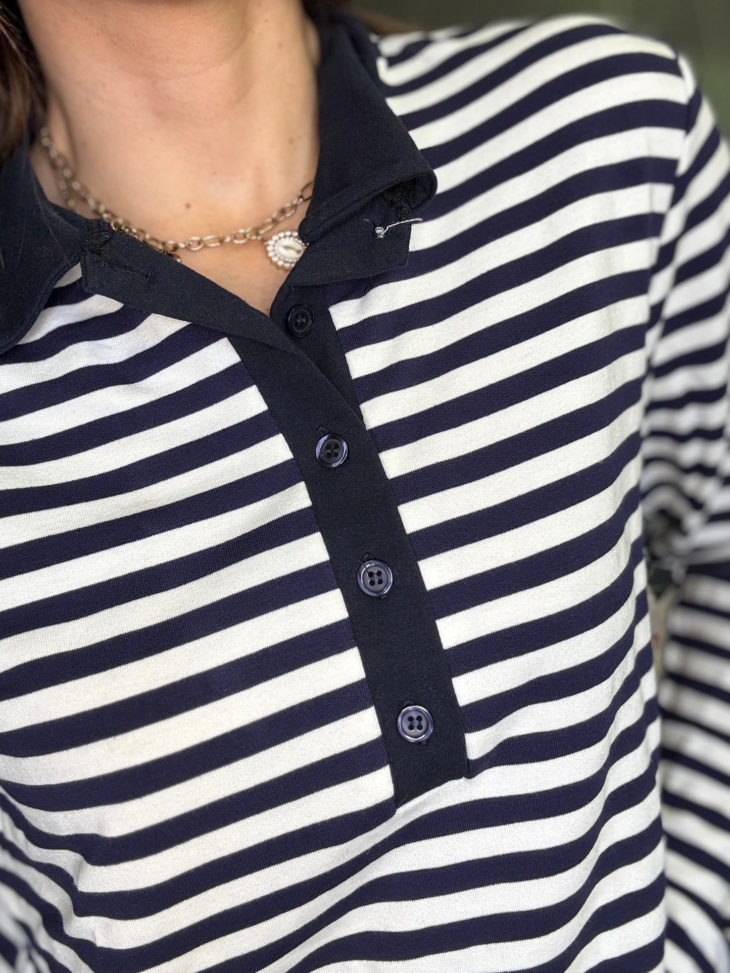 Maglia polo a righe con colletto in contrasto. Stile casual chic, caratterizzata da un motivo a righe orizzontali. Il design è valorizzato dall’abbottonatura frontale con bottoni tono su tono che aggiungono un dettaglio ricercato e femminile. La vestibilità è morbida e confortevole, ideale per l’uso quotidiano. Piacevole per la mezza stagione.