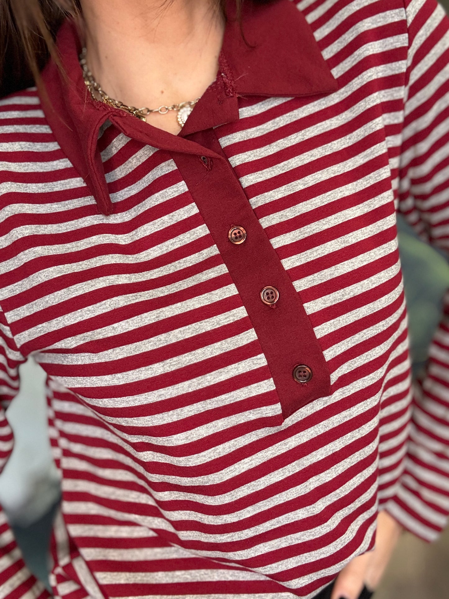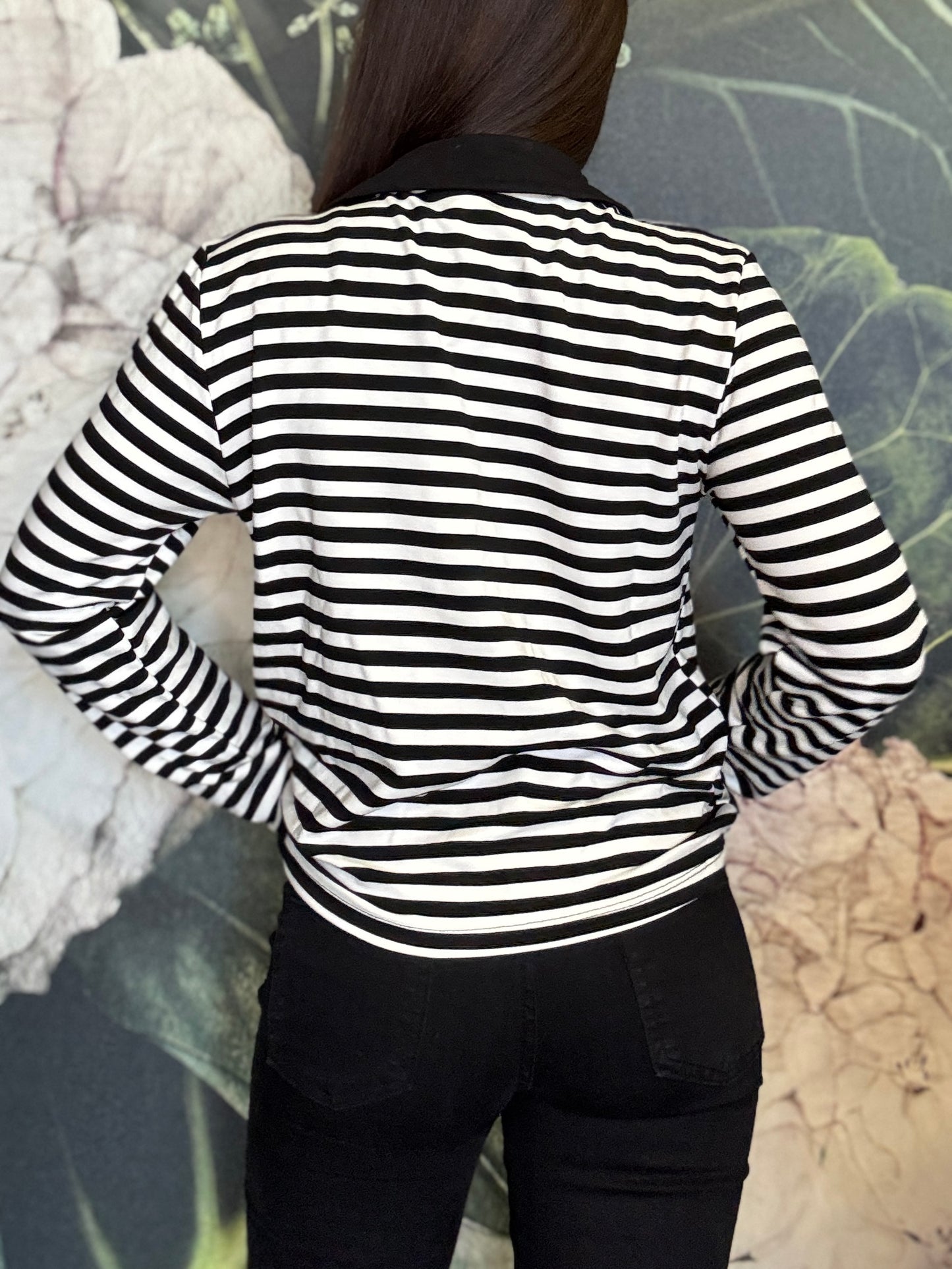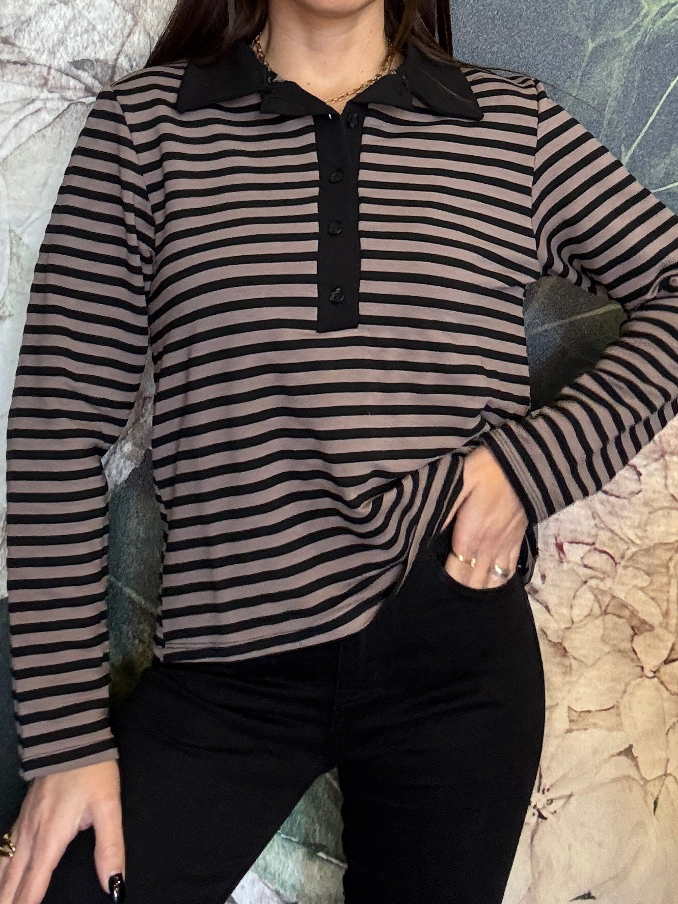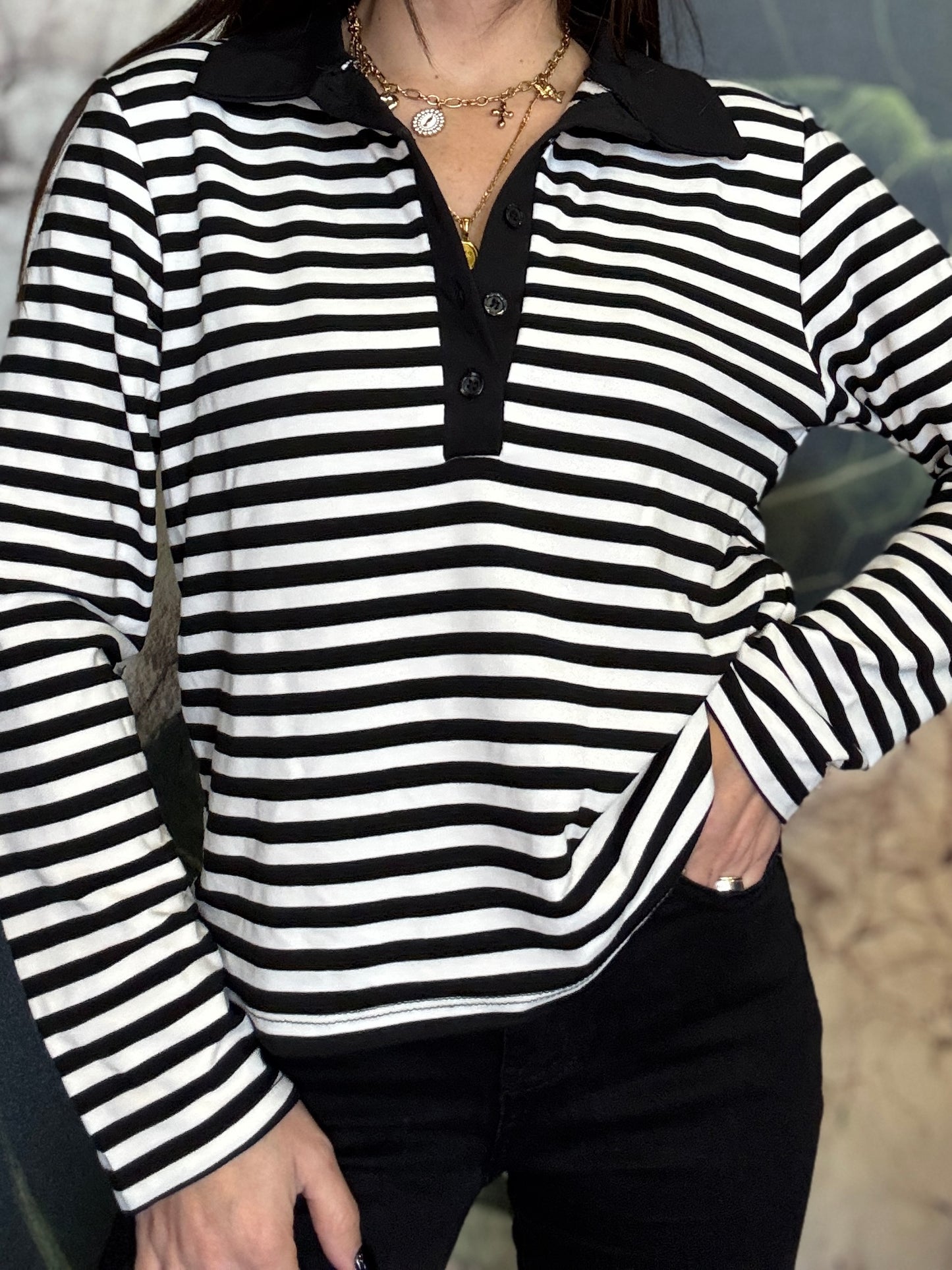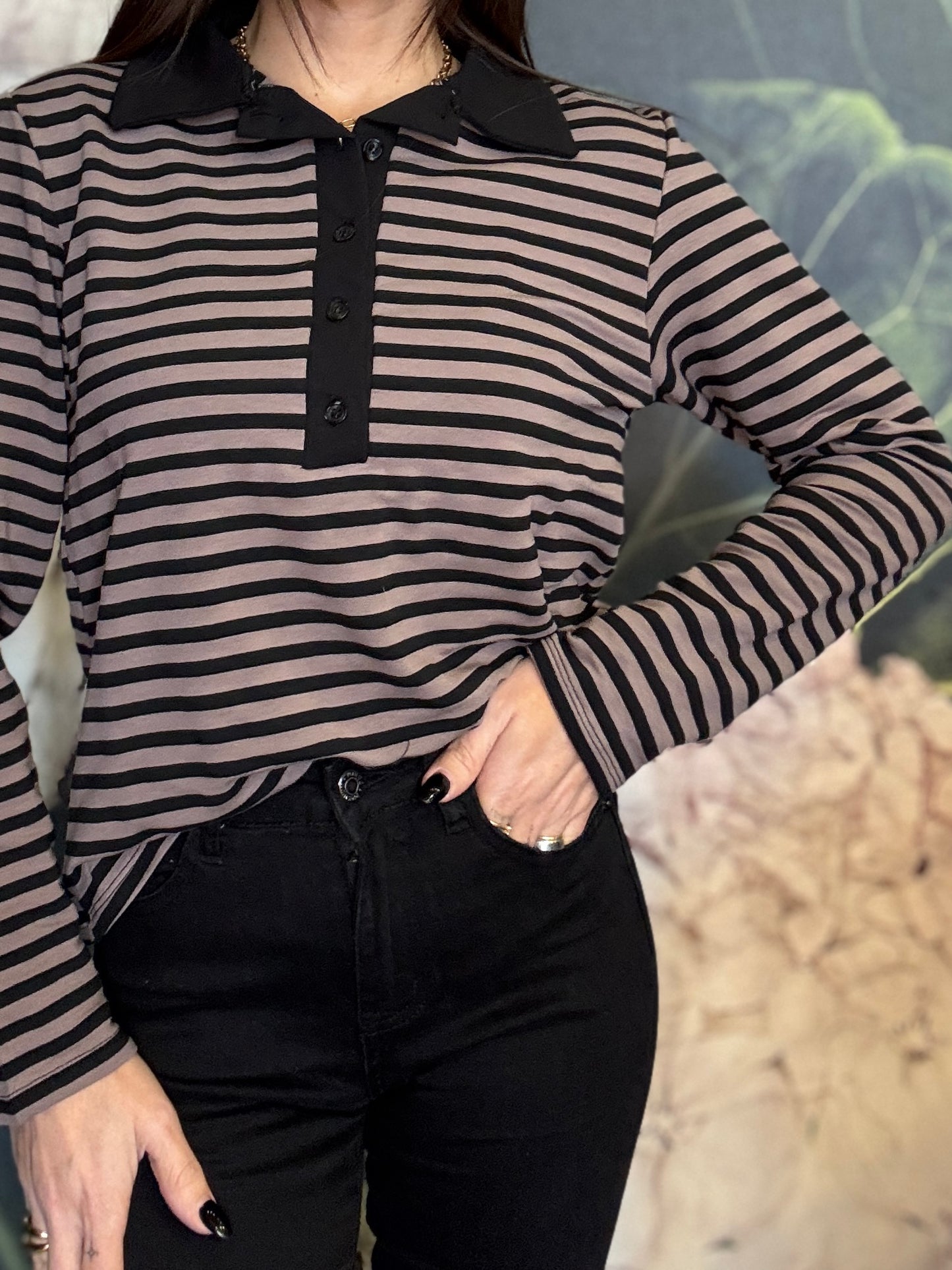 Maglia polo a righe con colletto in contrasto. Stile casual chic, caratterizzata da un motivo a righe orizzontali. Il design è valorizzato dall’abbottonatura frontale con bottoni tono su tono che aggiungono un dettaglio ricercato e femminile. La vestibilità è morbida e confortevole, ideale per l’uso quotidiano. Piacevole per la mezza stagione.