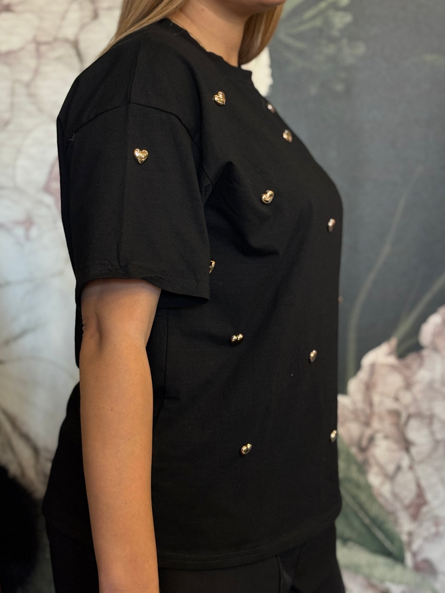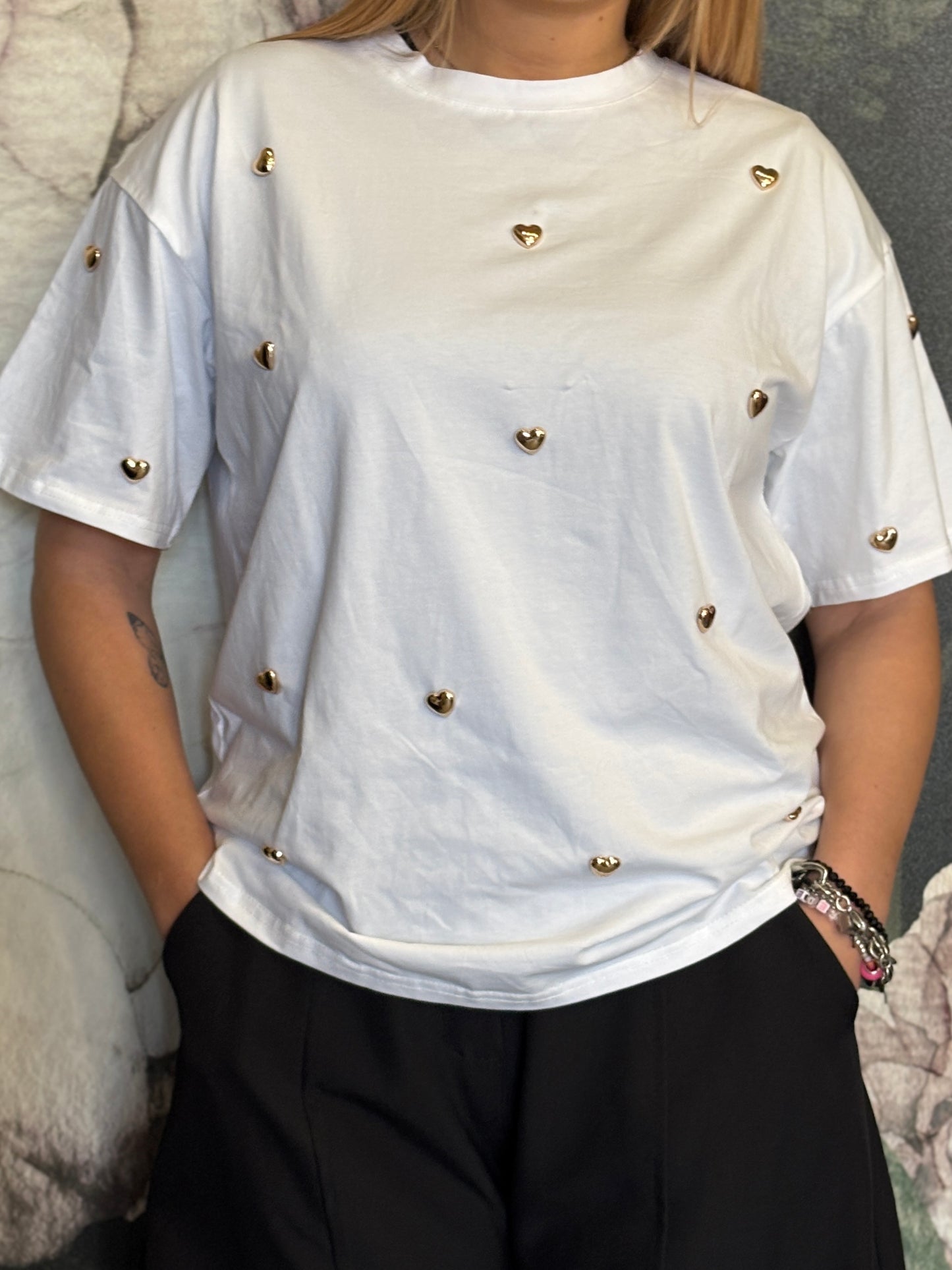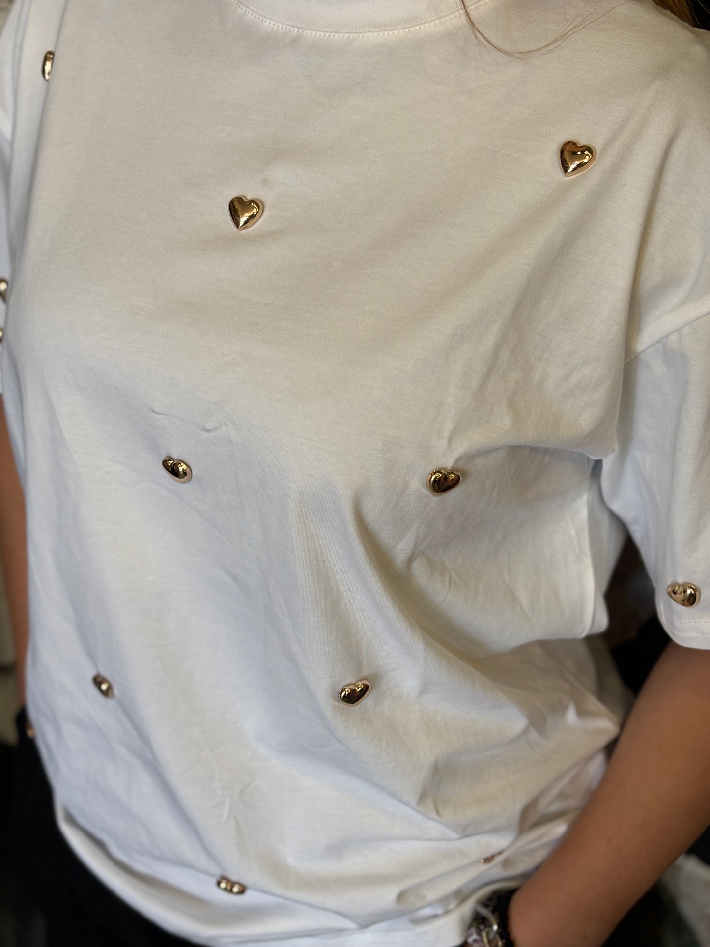 Maxi T-shirt a girocollo caratterizzata da cuori applicati su tutta la parte frontale e sulle maniche.