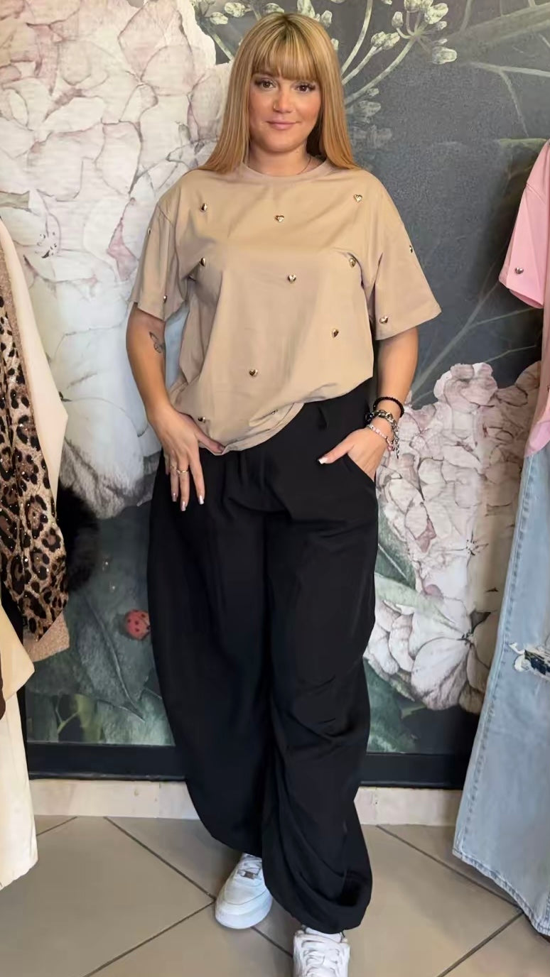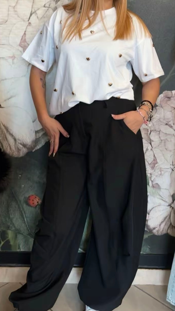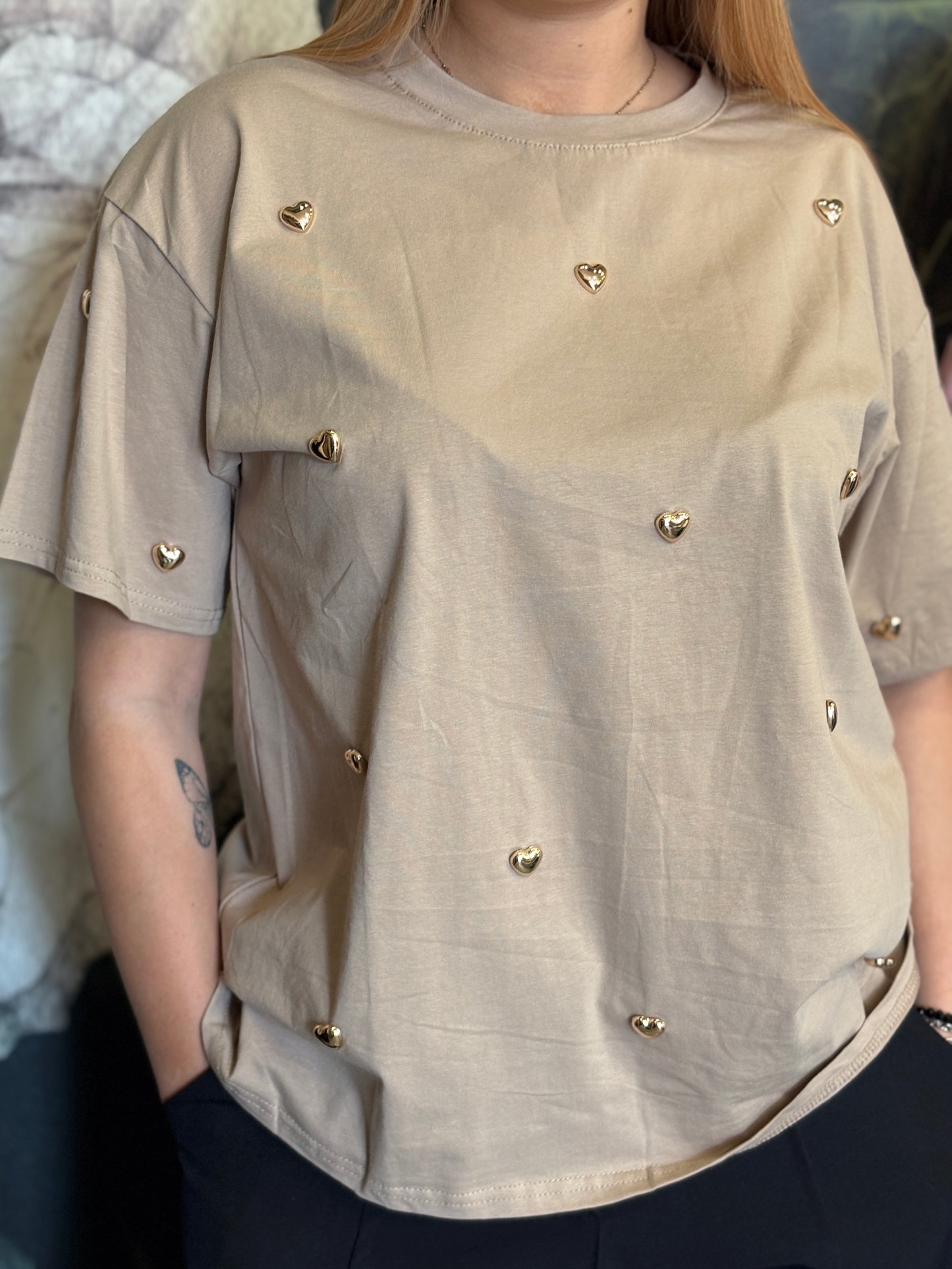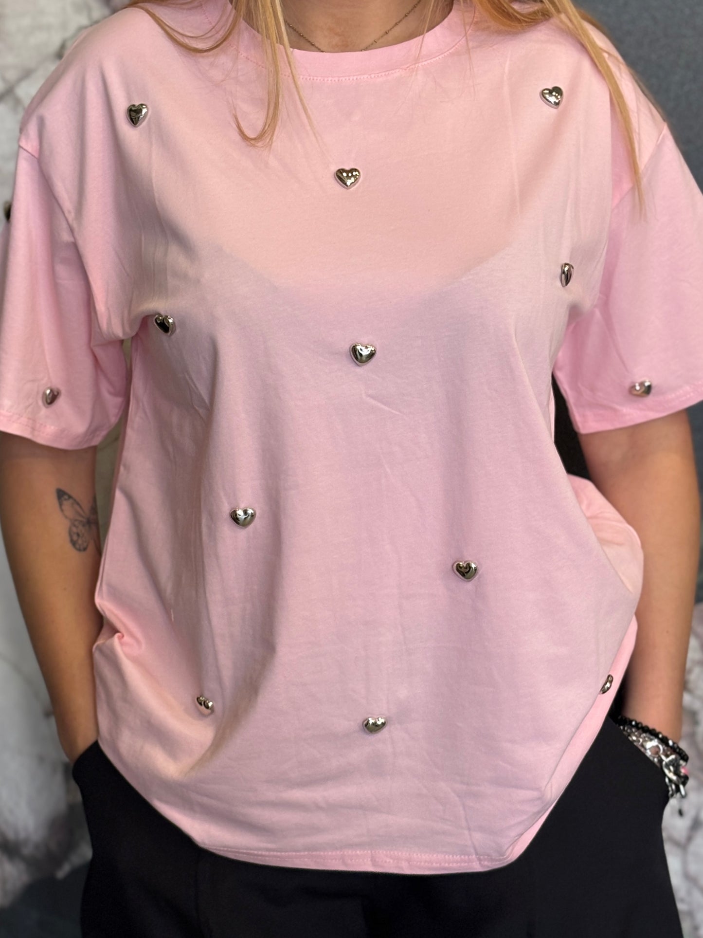 Maxi T-shirt a girocollo caratterizzata da cuori applicati su tutta la parte frontale e sulle maniche.