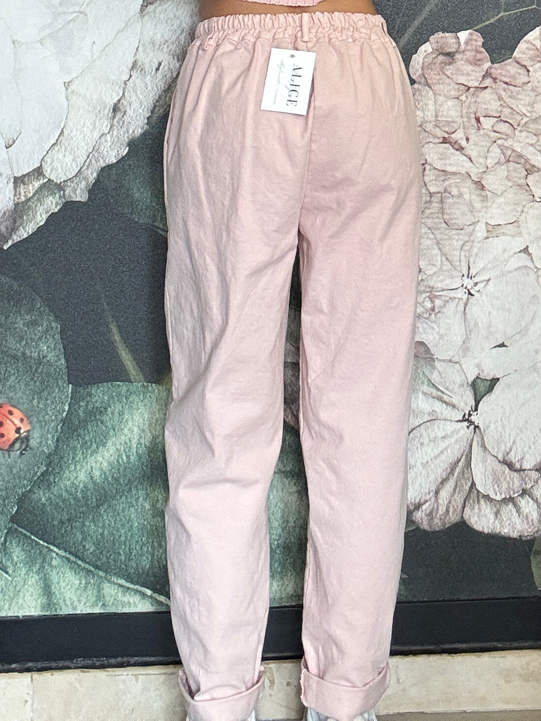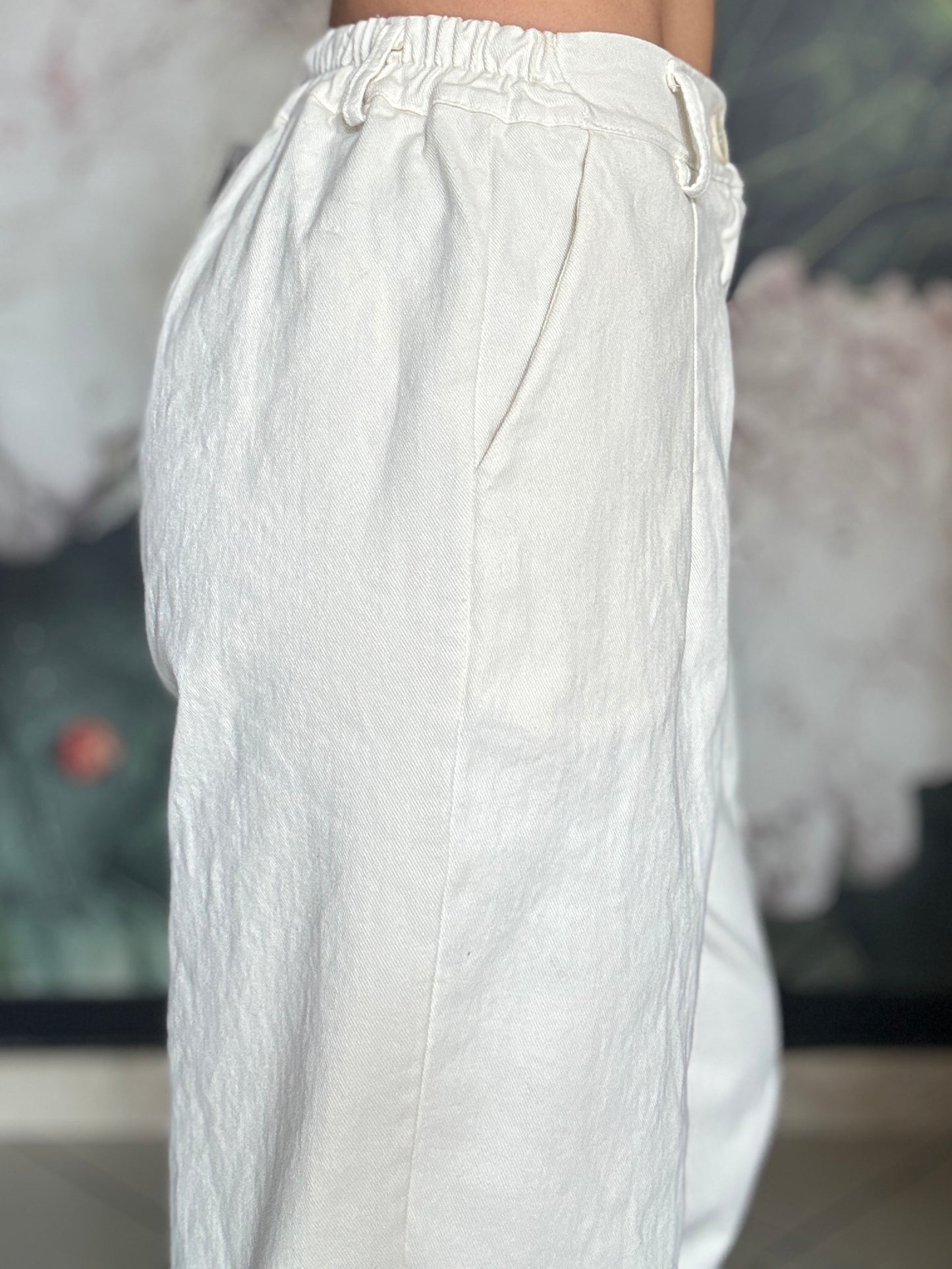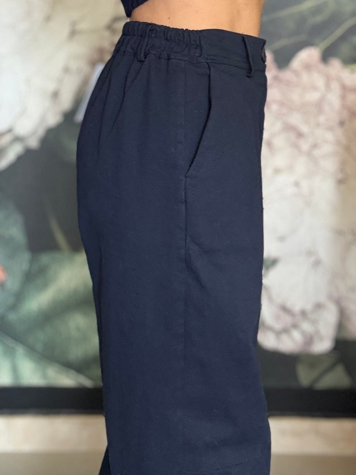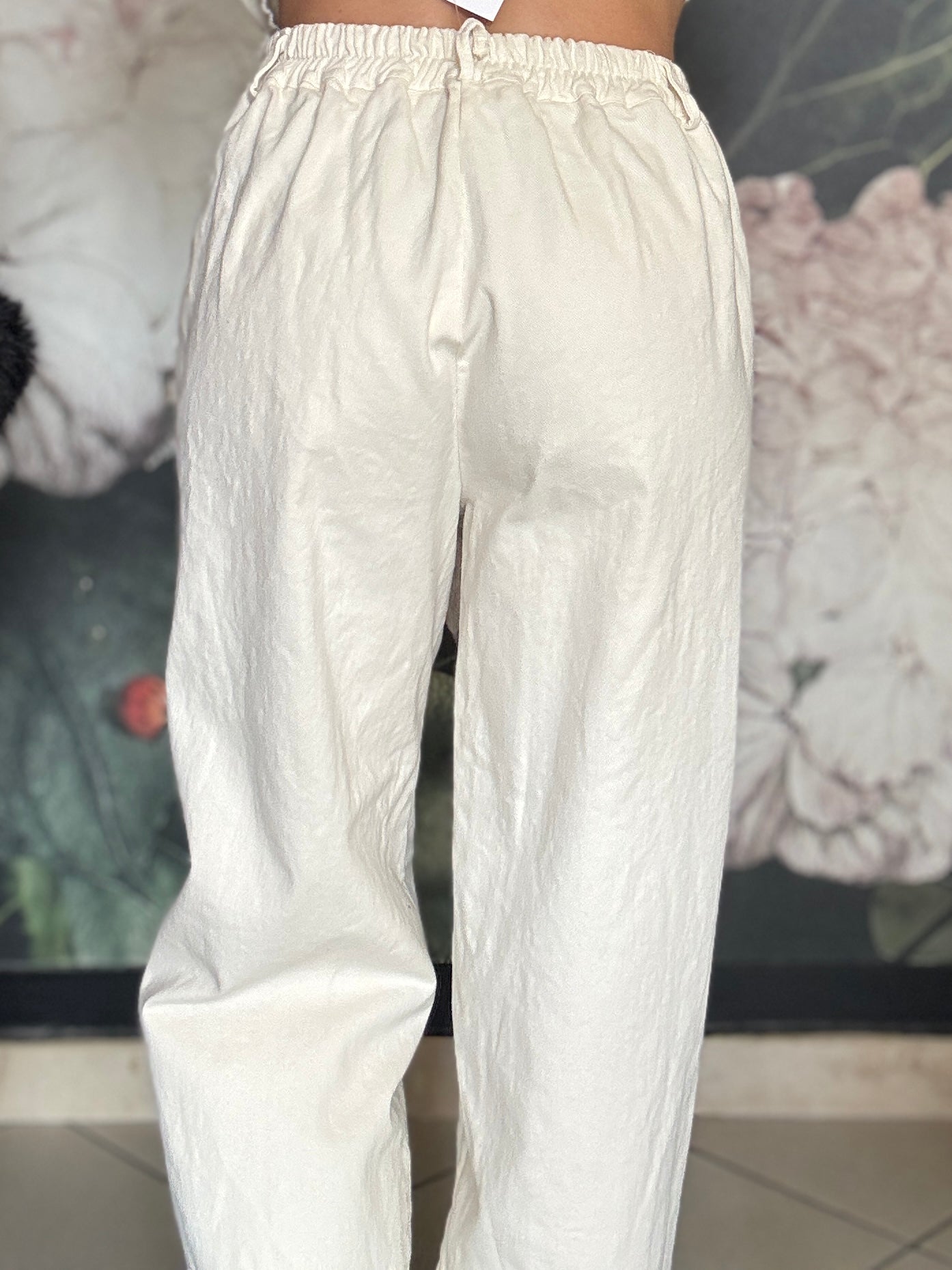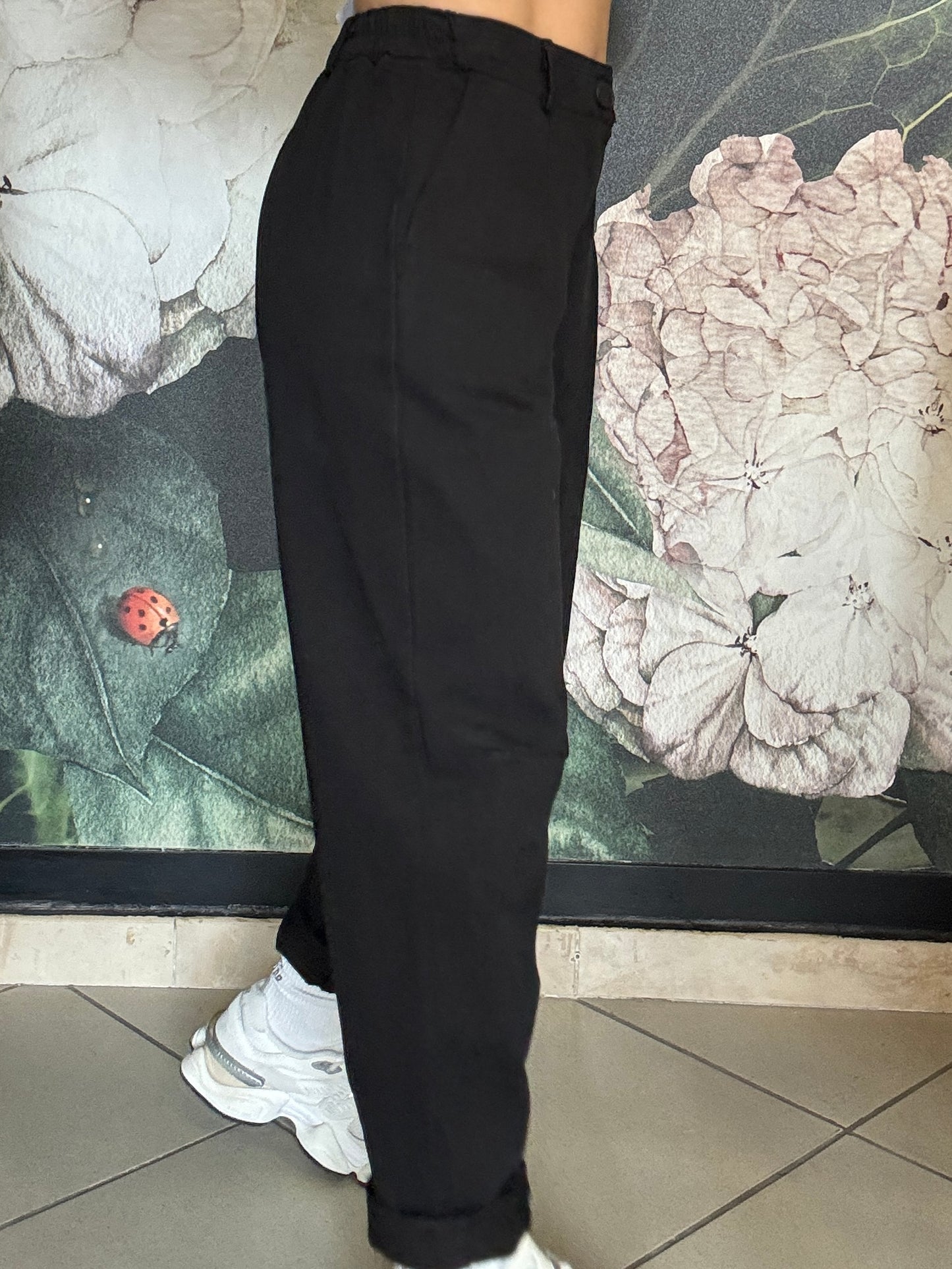 Pantalone dal taglio morbido con vita regolare , passanti e chiusura frontale con zip, mentre il retro con elastico garantisce una vestibilità comoda e adattabile. Taglio mom fit , con una gamba dritta e leggermente affusolata sul fondo.