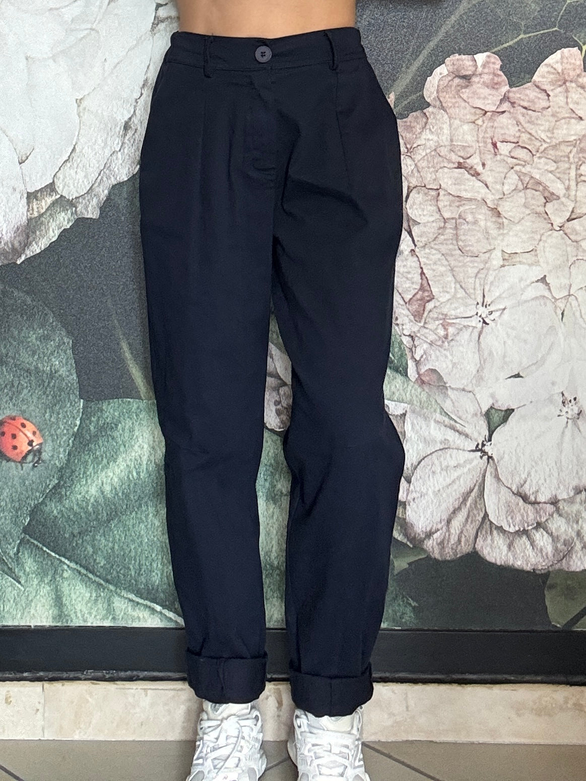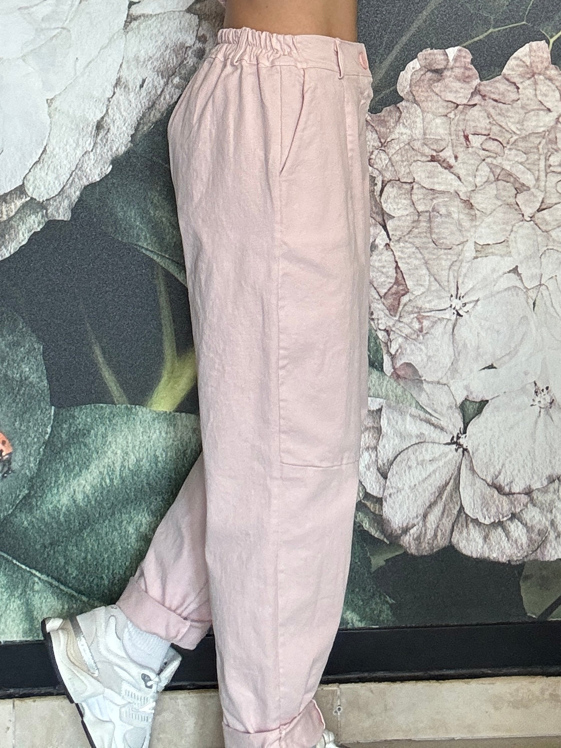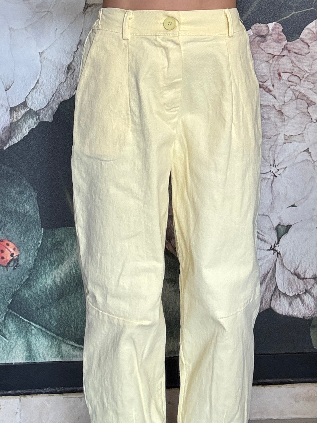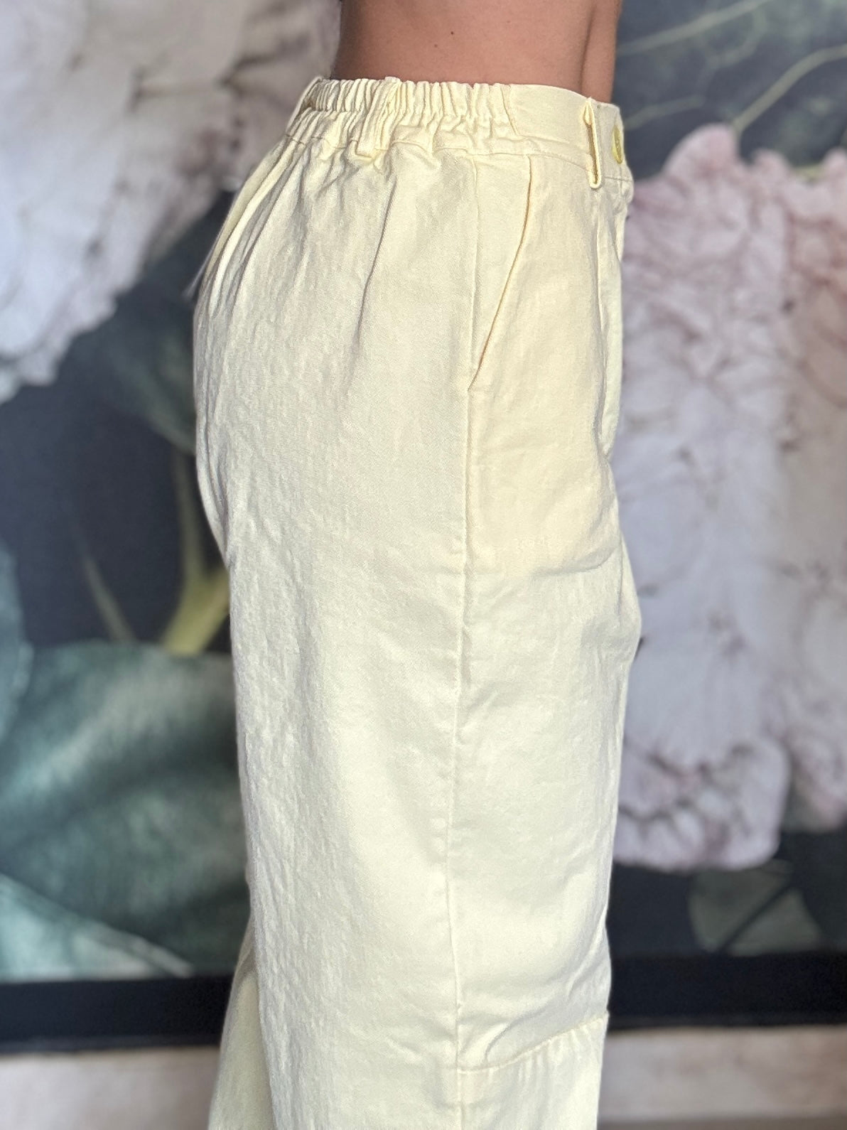 Pantalone dal taglio morbido con vita regolare , passanti e chiusura frontale con zip, mentre il retro con elastico garantisce una vestibilità comoda e adattabile. Taglio mom fit , con una gamba dritta e leggermente affusolata sul fondo.