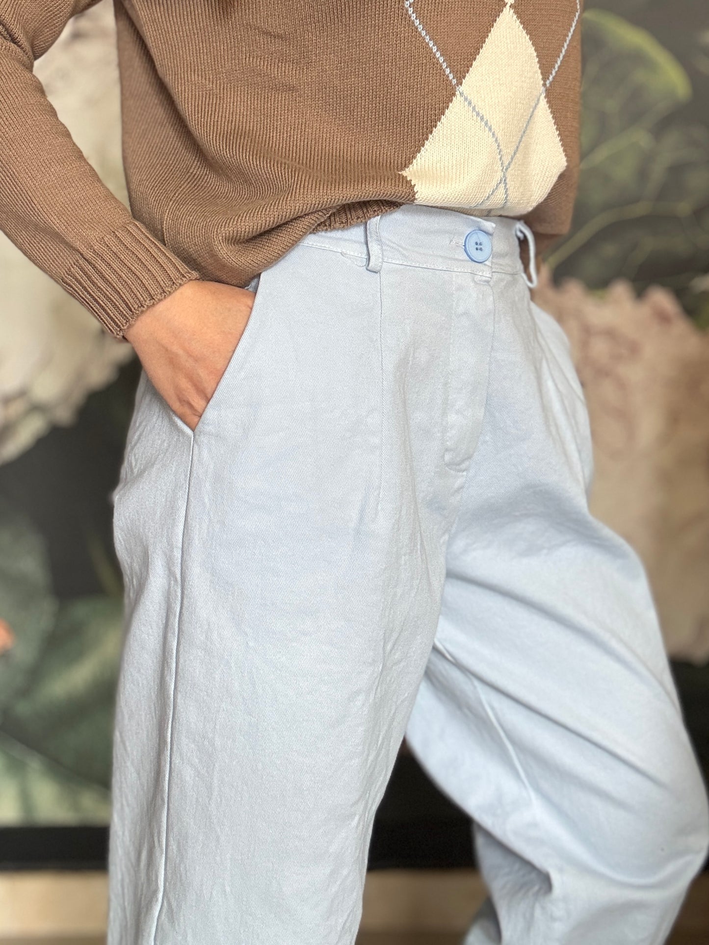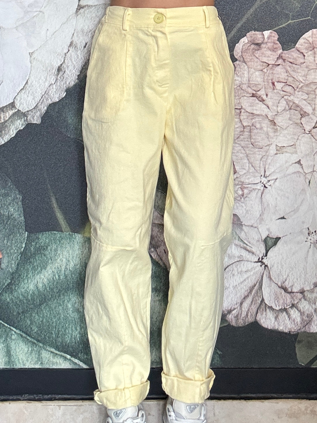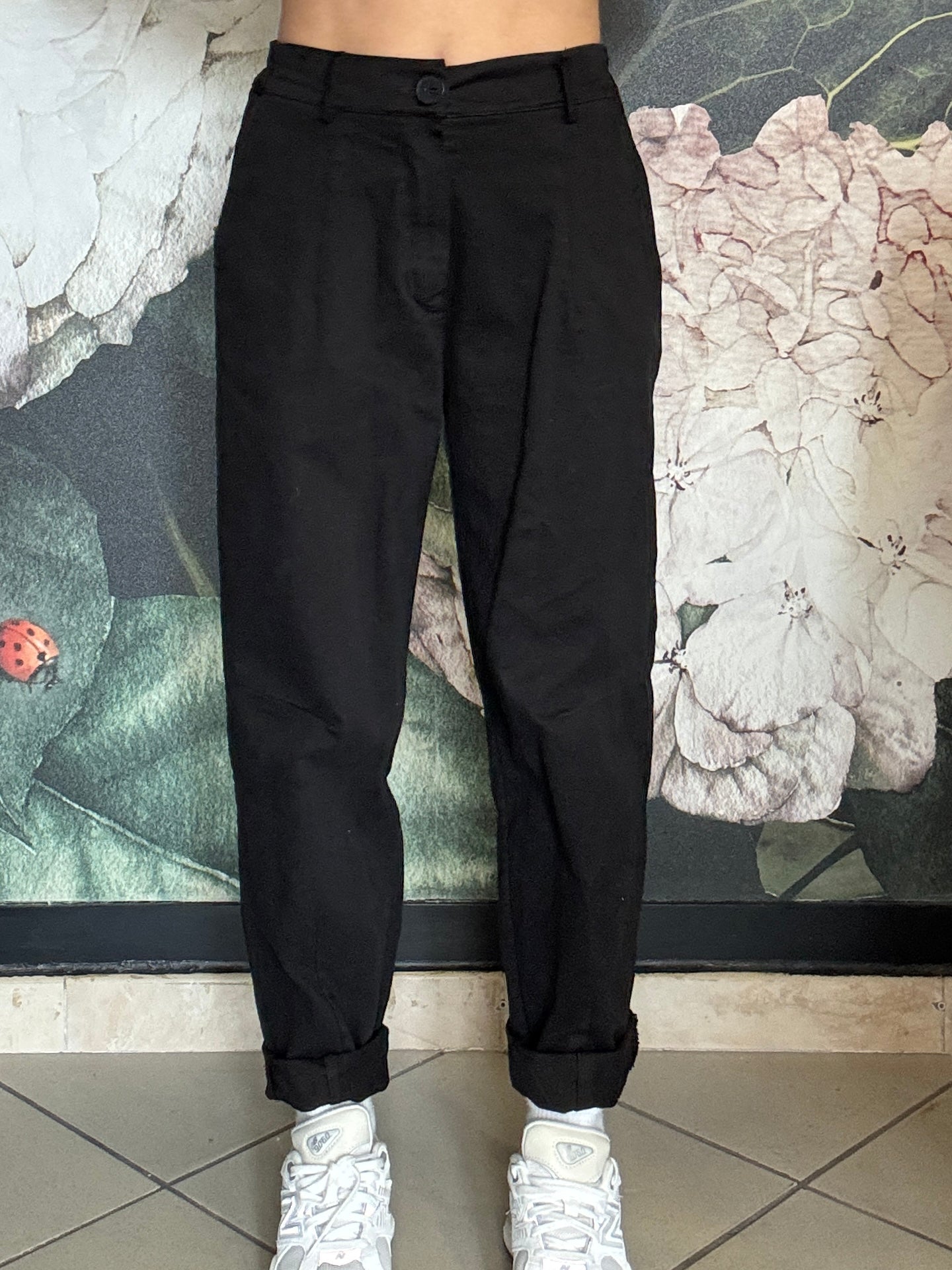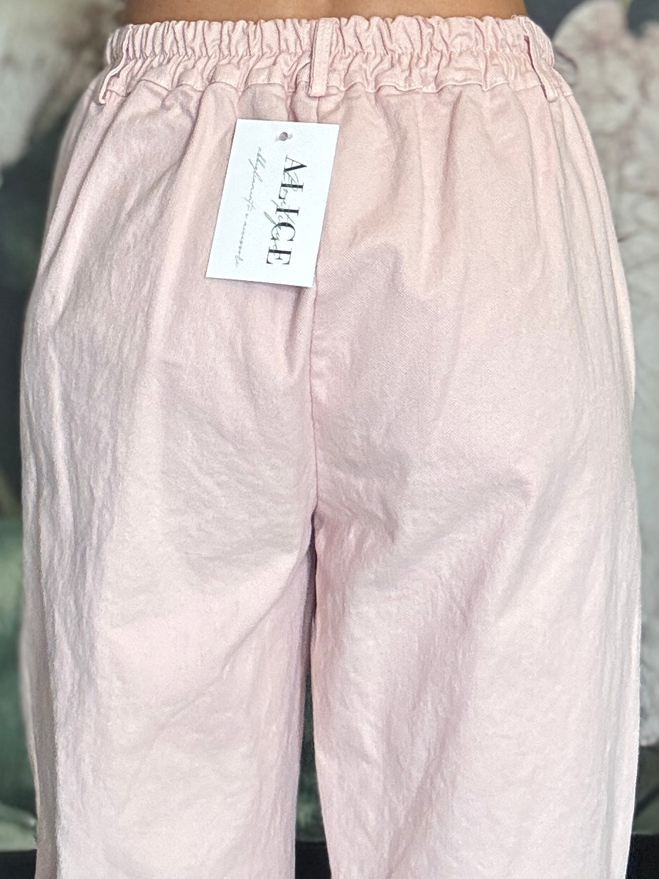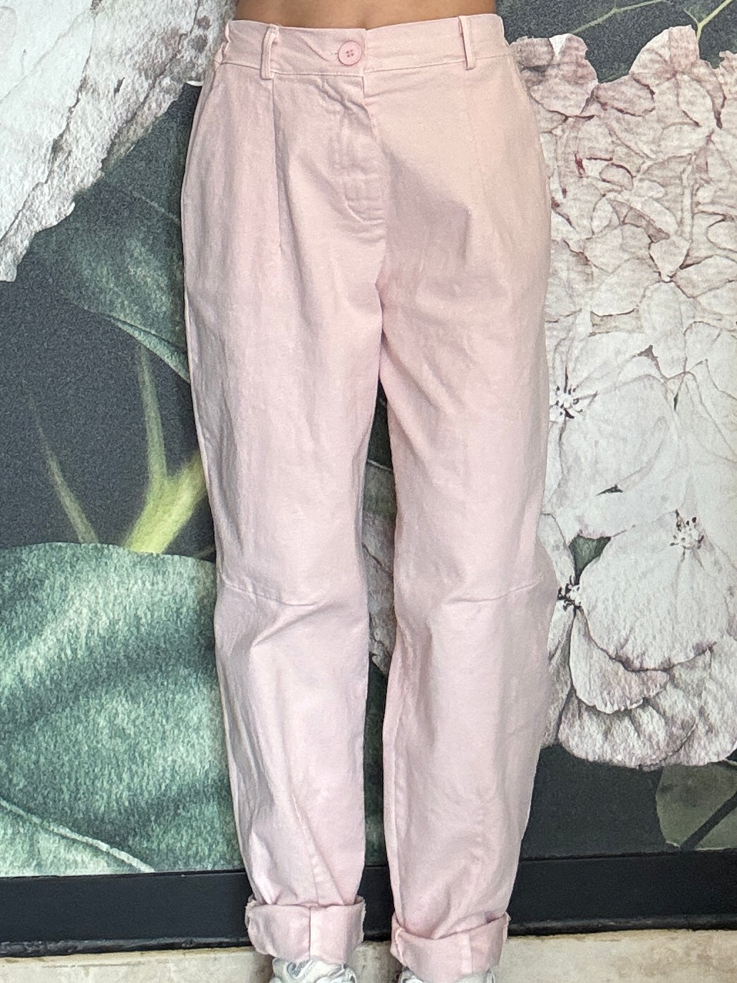 Pantalone dal taglio morbido con vita regolare , passanti e chiusura frontale con zip, mentre il retro con elastico garantisce una vestibilità comoda e adattabile. Taglio mom fit , con una gamba dritta e leggermente affusolata sul fondo.