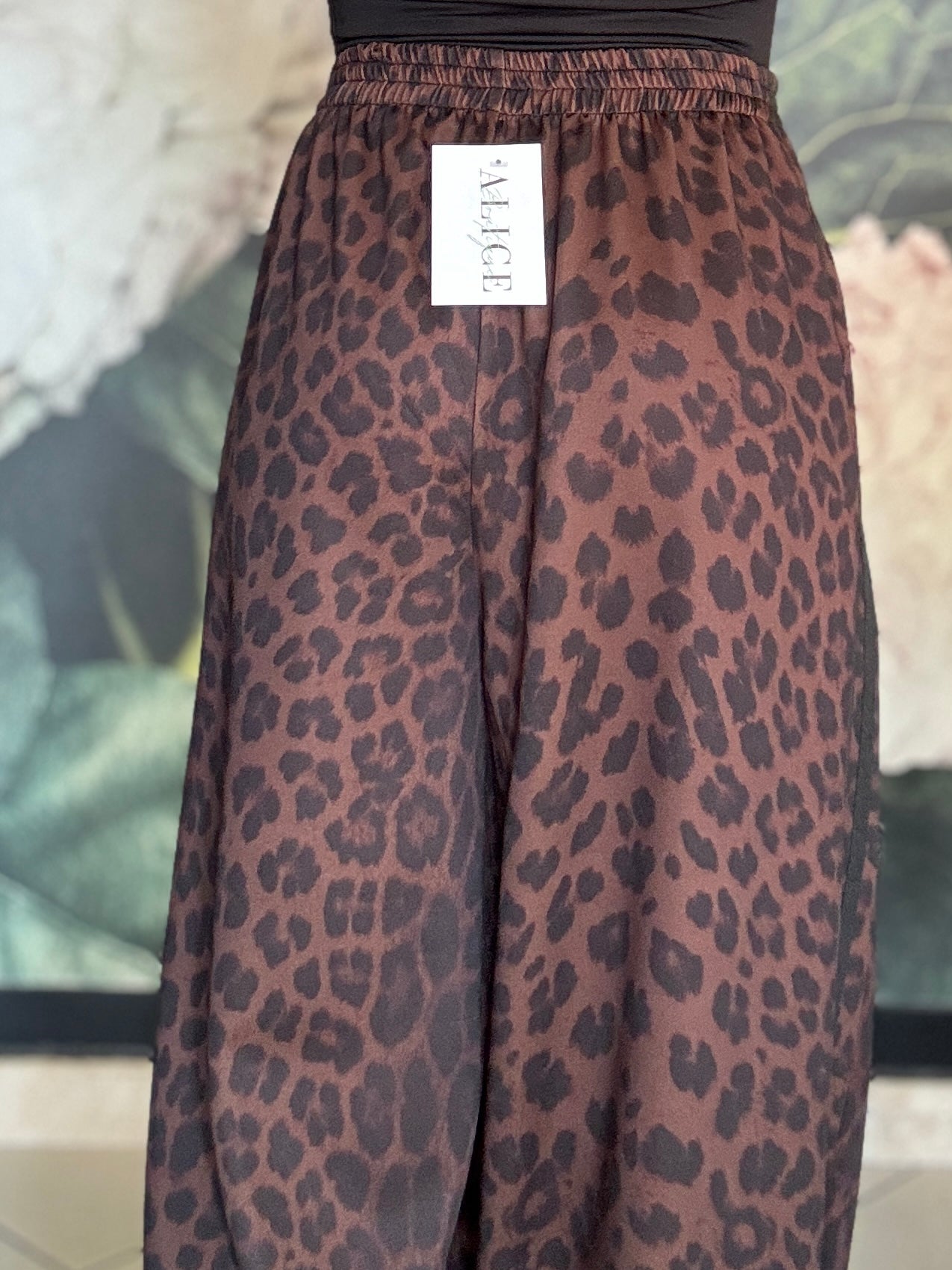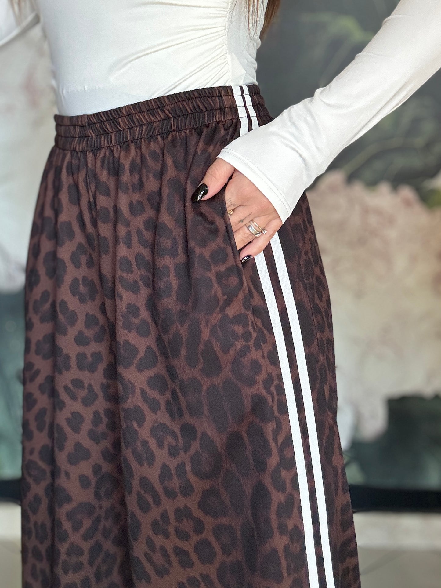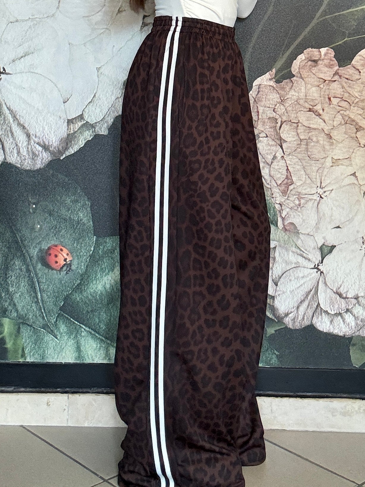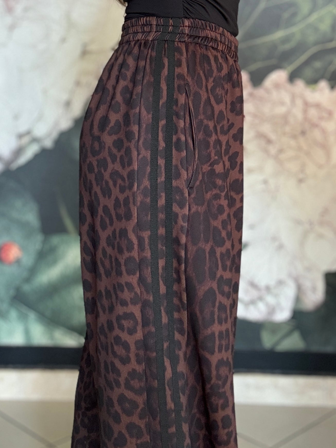 Pantalone dal carattere sportivo, a stampa animalier con bande colorate , elastico in vita e gamba decisamente ampia.