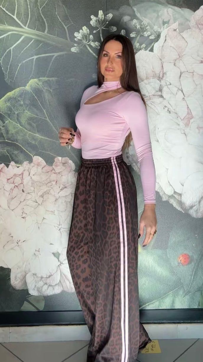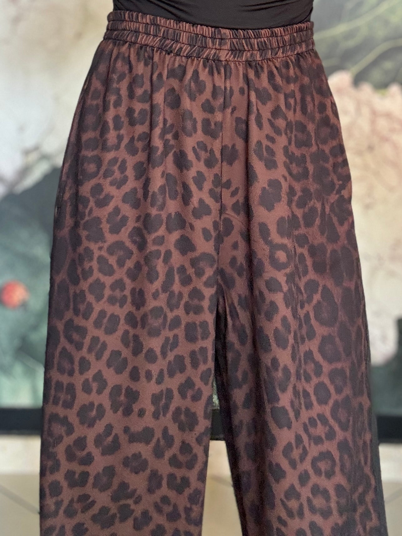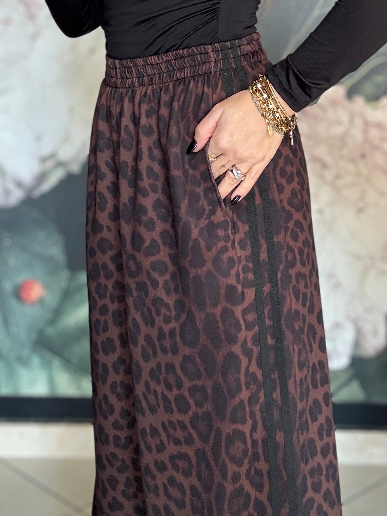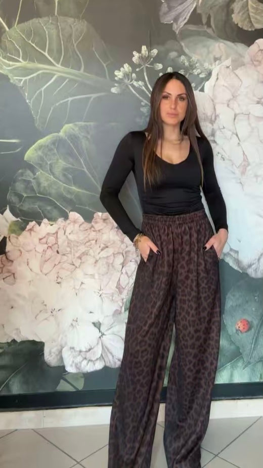 Pantalone dal carattere sportivo, a stampa animalier con bande colorate , elastico in vita e gamba decisamente ampia.