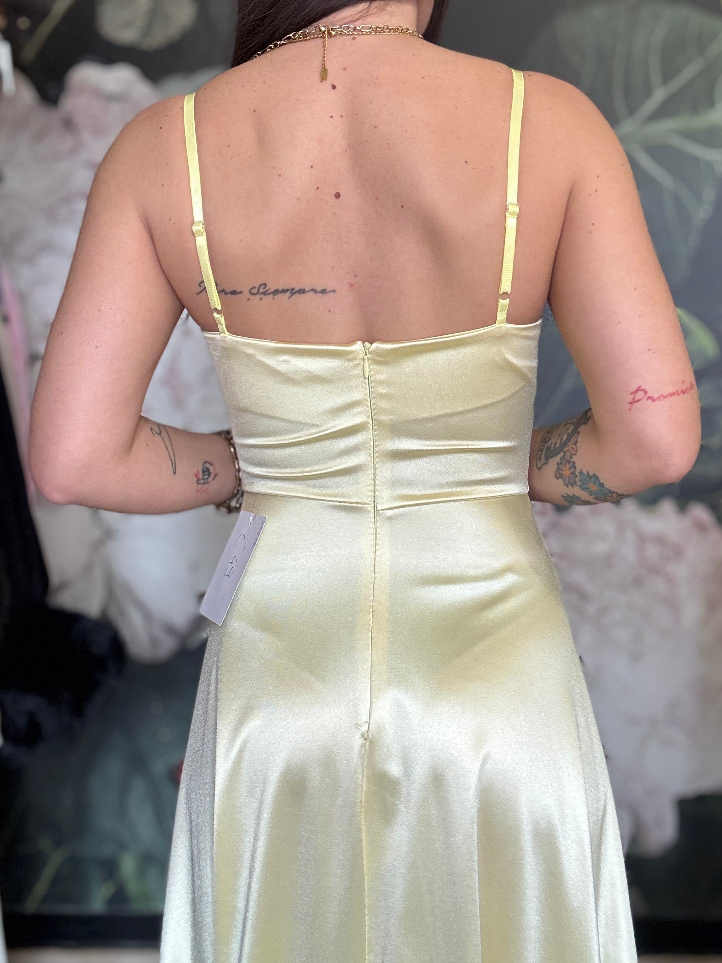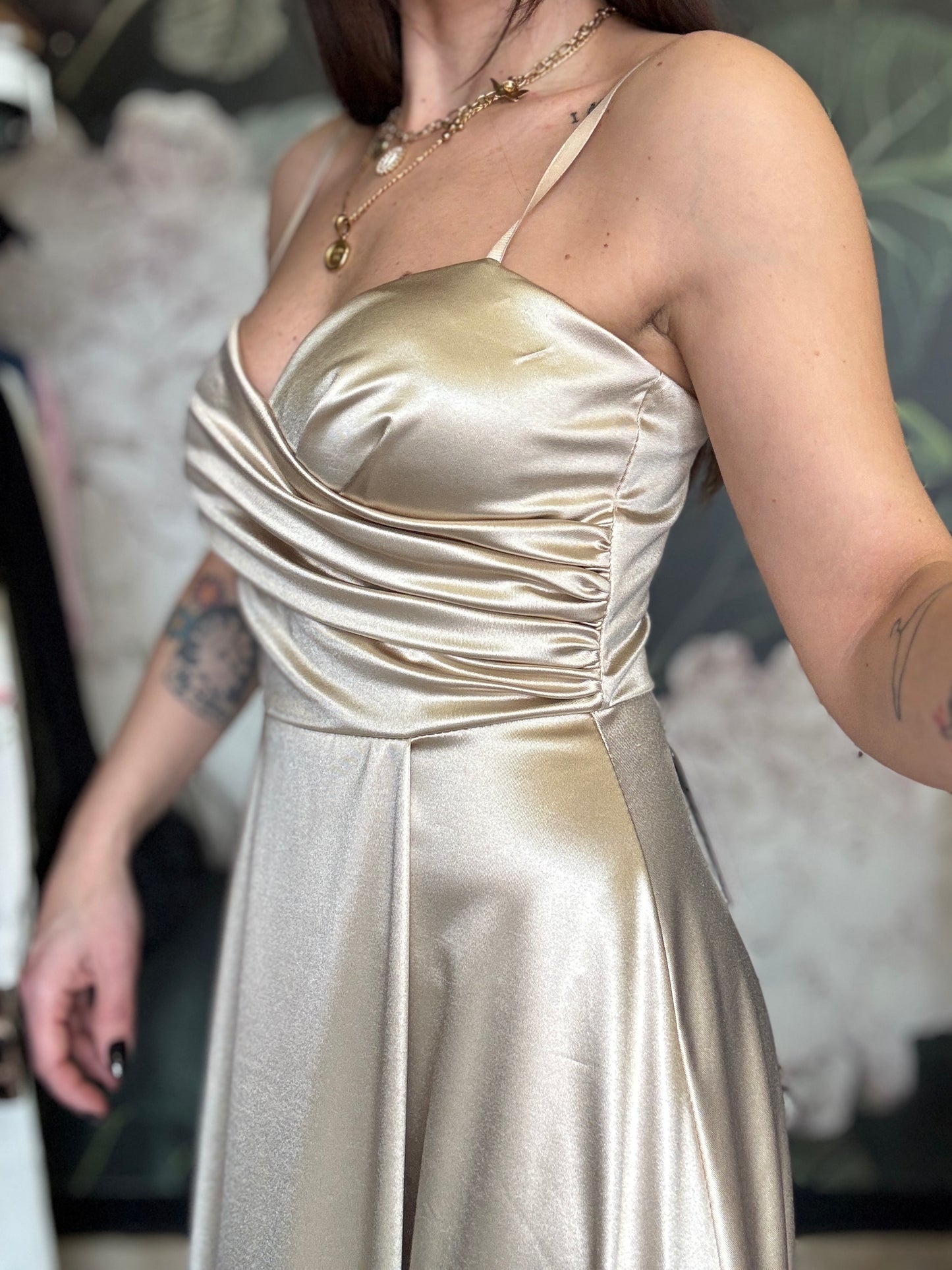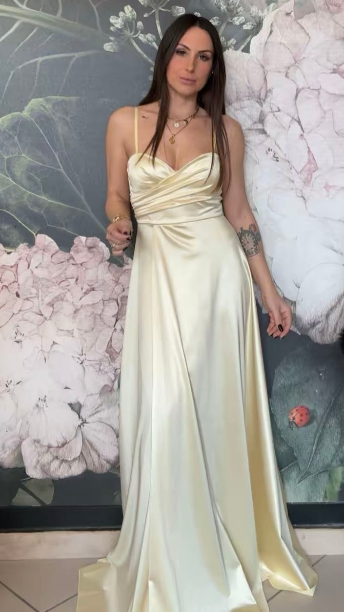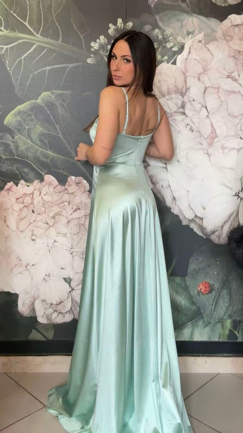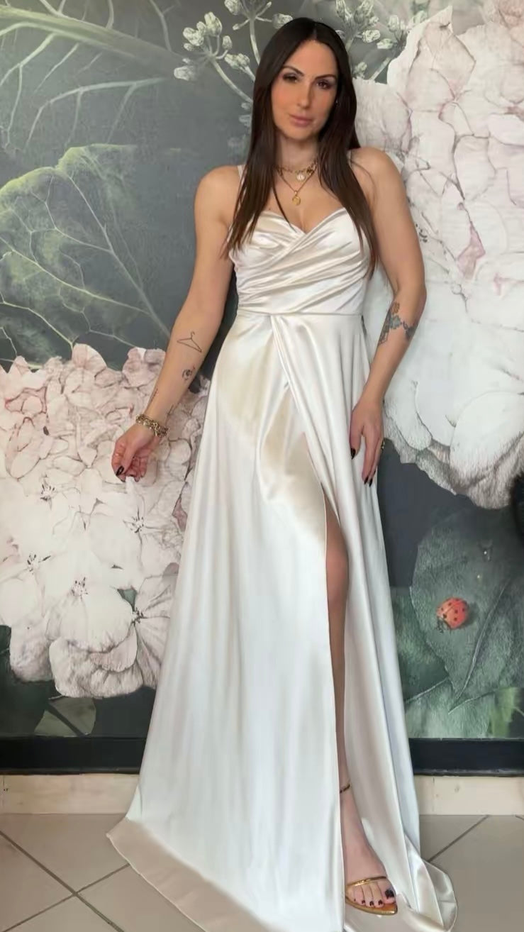 Abito lungo in tessuto lucido con scollo a cuore, coppa preformata e spalline regolabili. Chiusura a zip sul retro e apertura frontale a portafoglio.