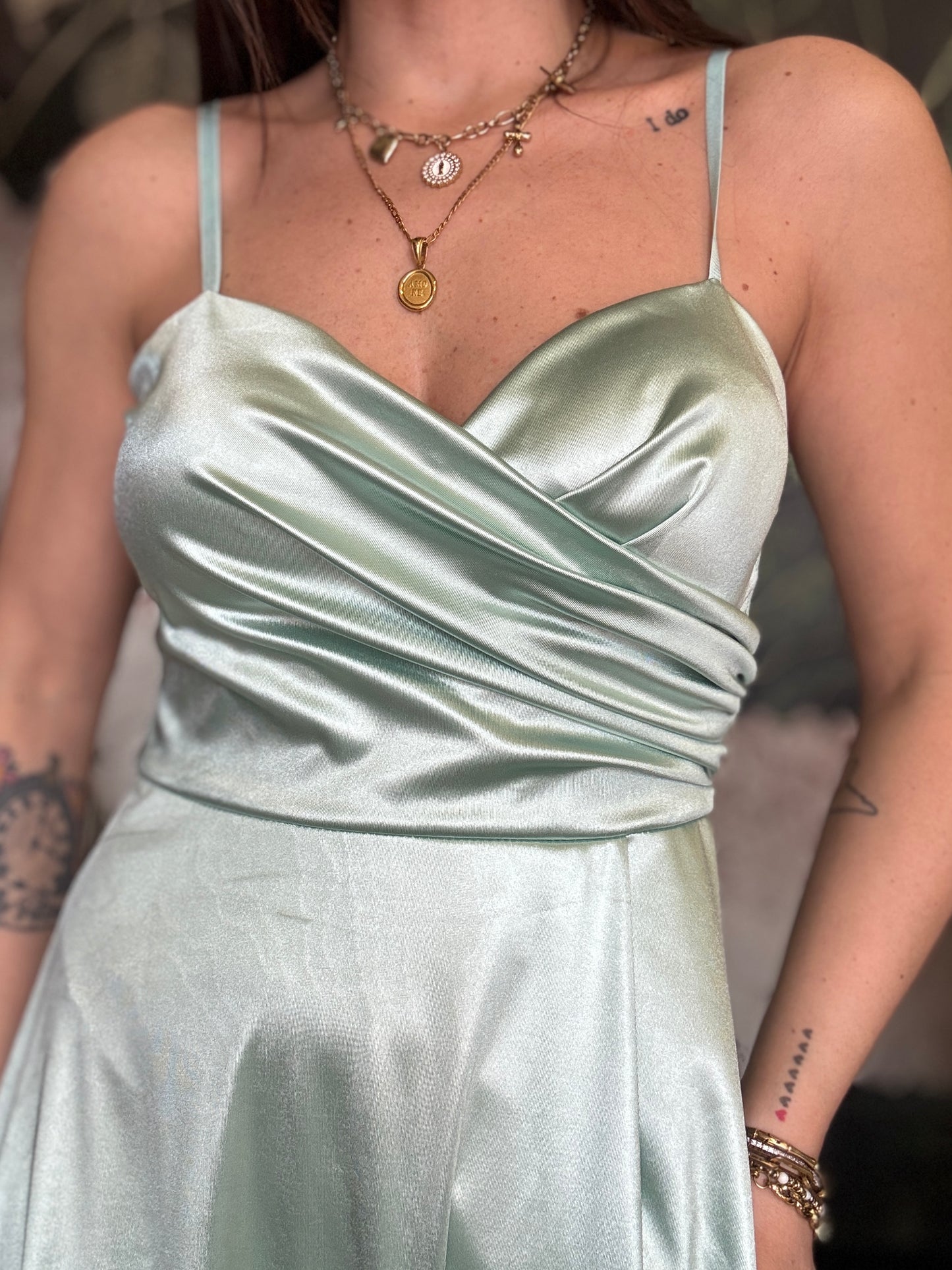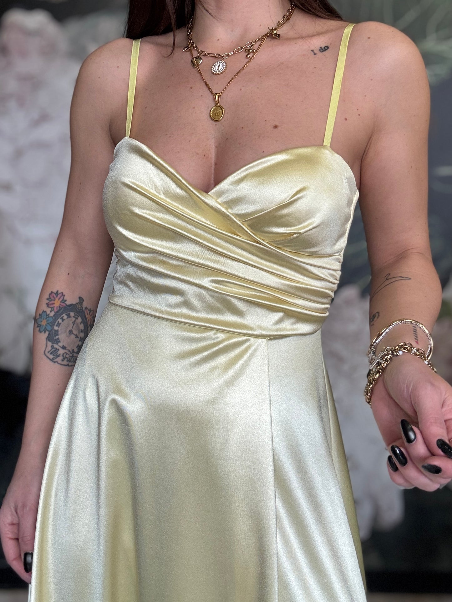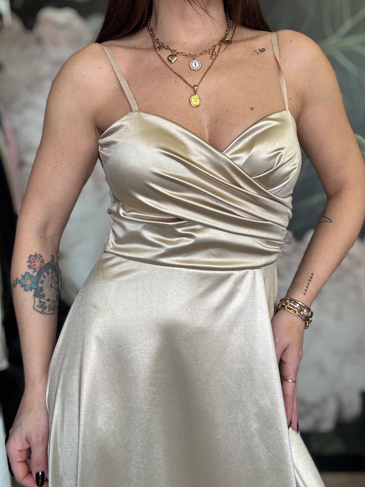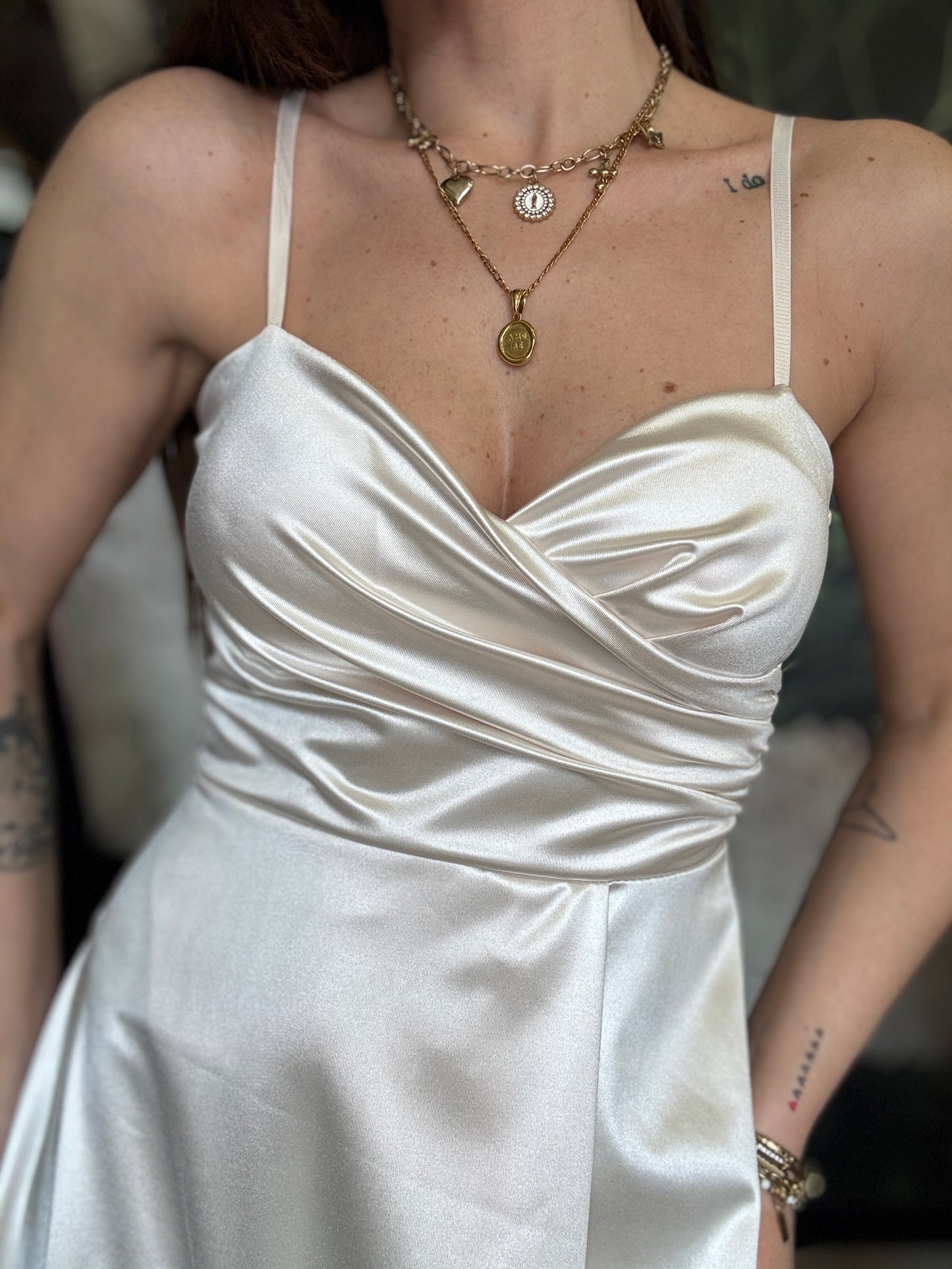 Abito lungo in tessuto lucido con scollo a cuore, coppa preformata e spalline regolabili. Chiusura a zip sul retro e apertura frontale a portafoglio.