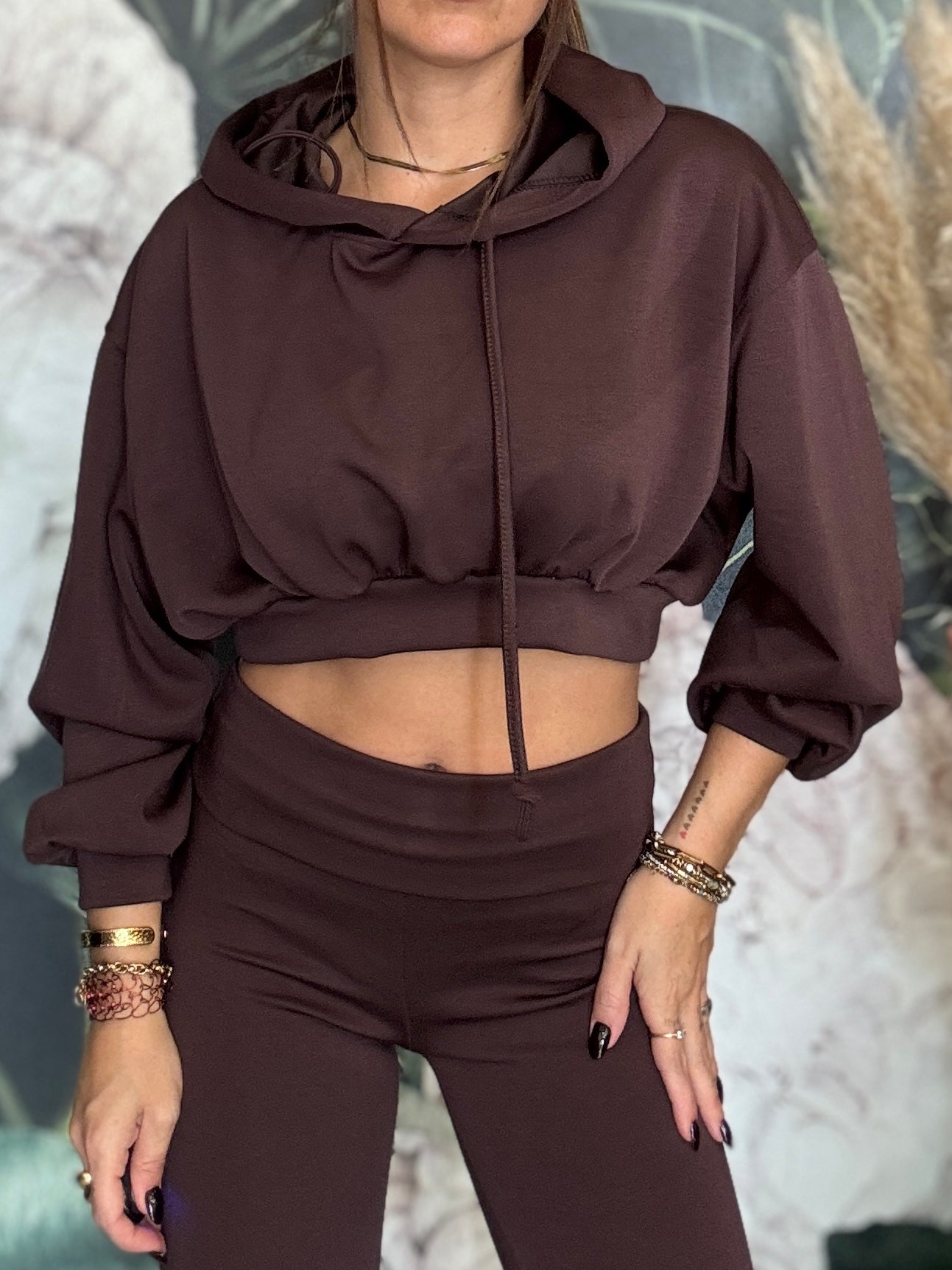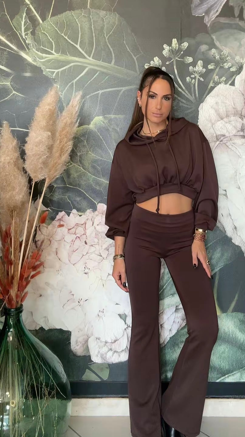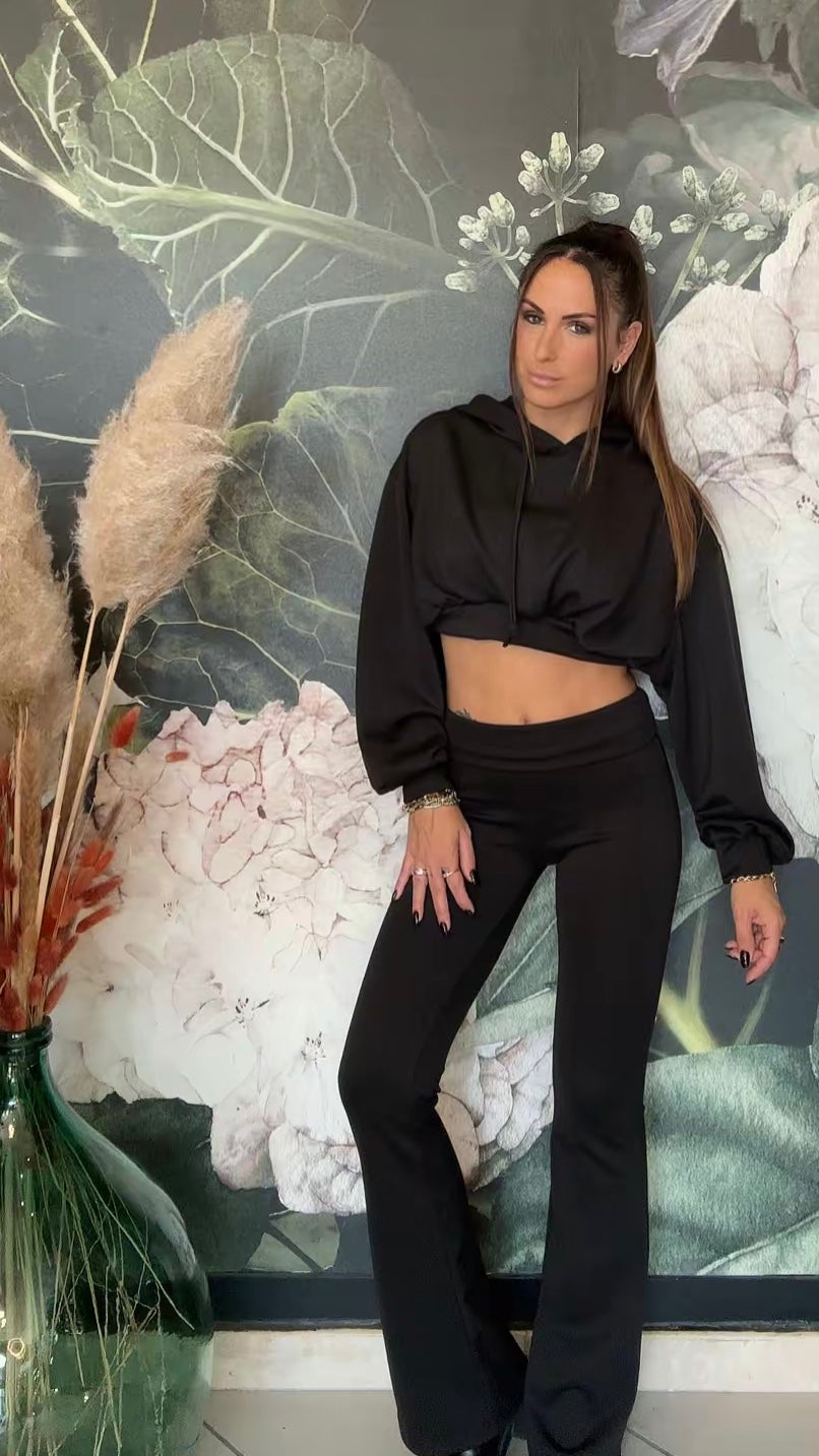 Coordinato stretch ,composto da felpa morbida crop con cappuccio e manica a sbuffo ampia all’altezza del polsino, pantalone a zampa con risvolto in vita.