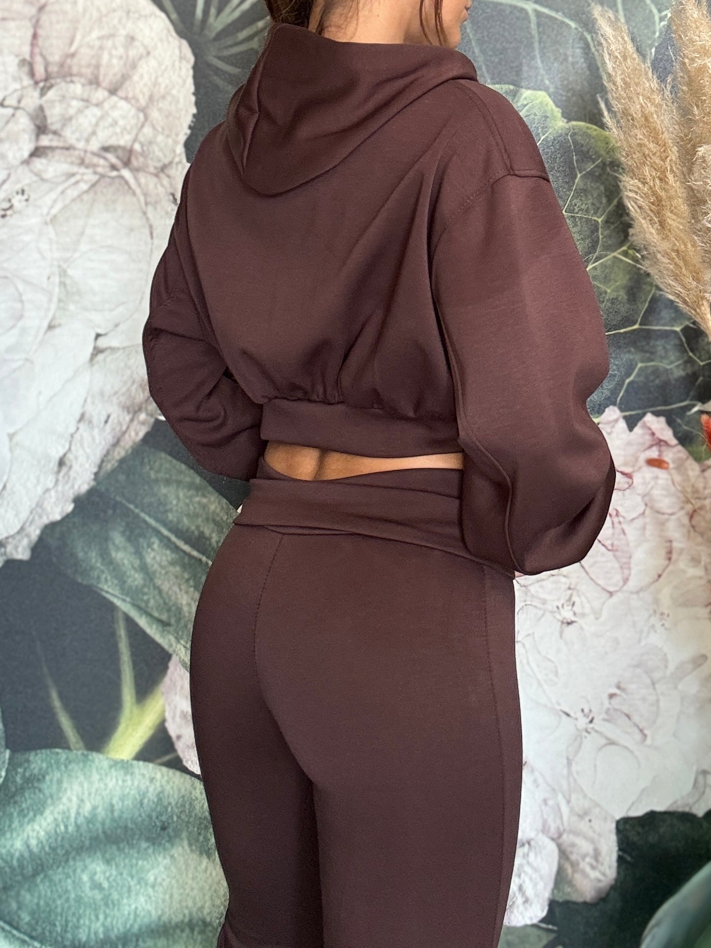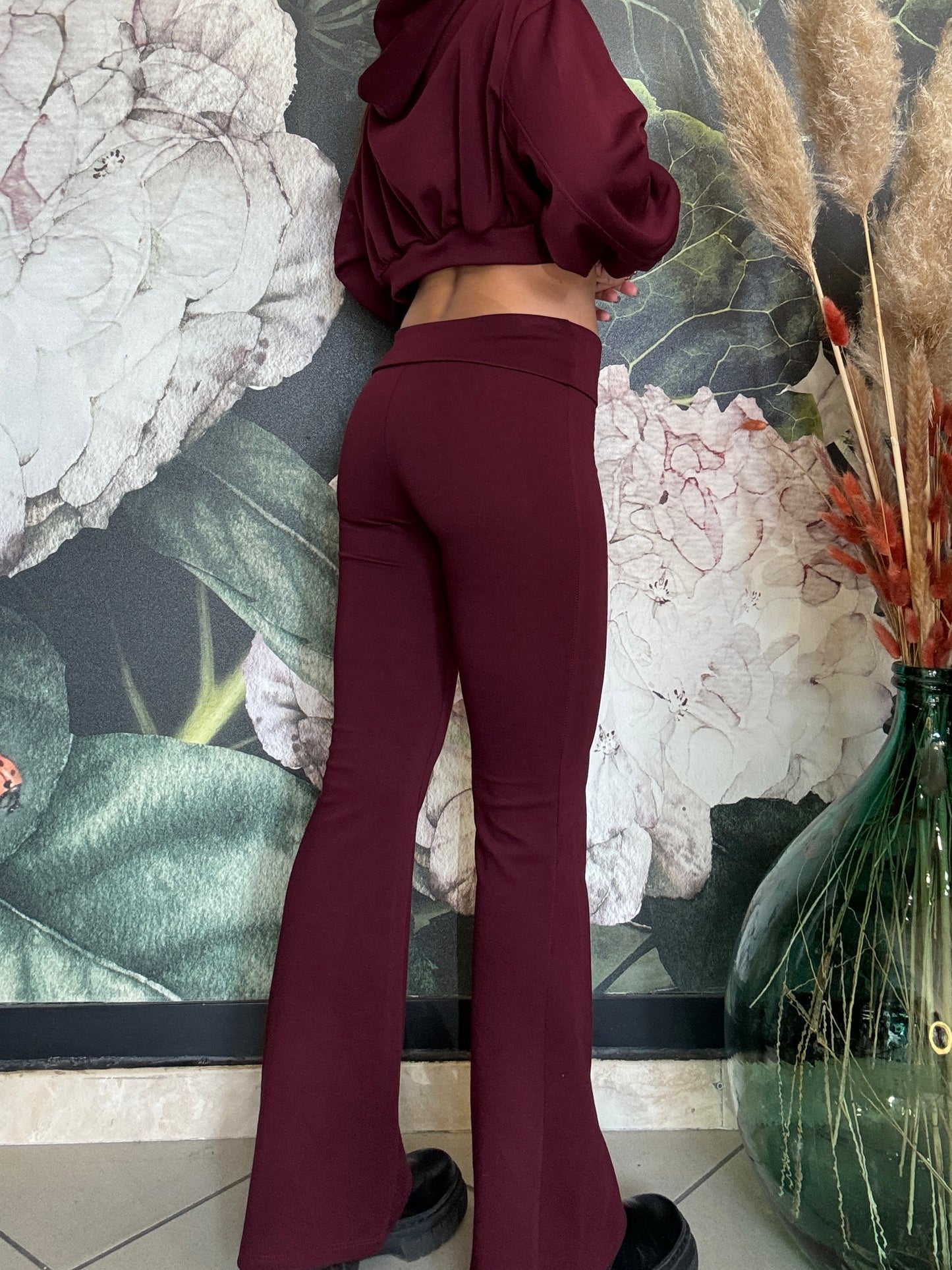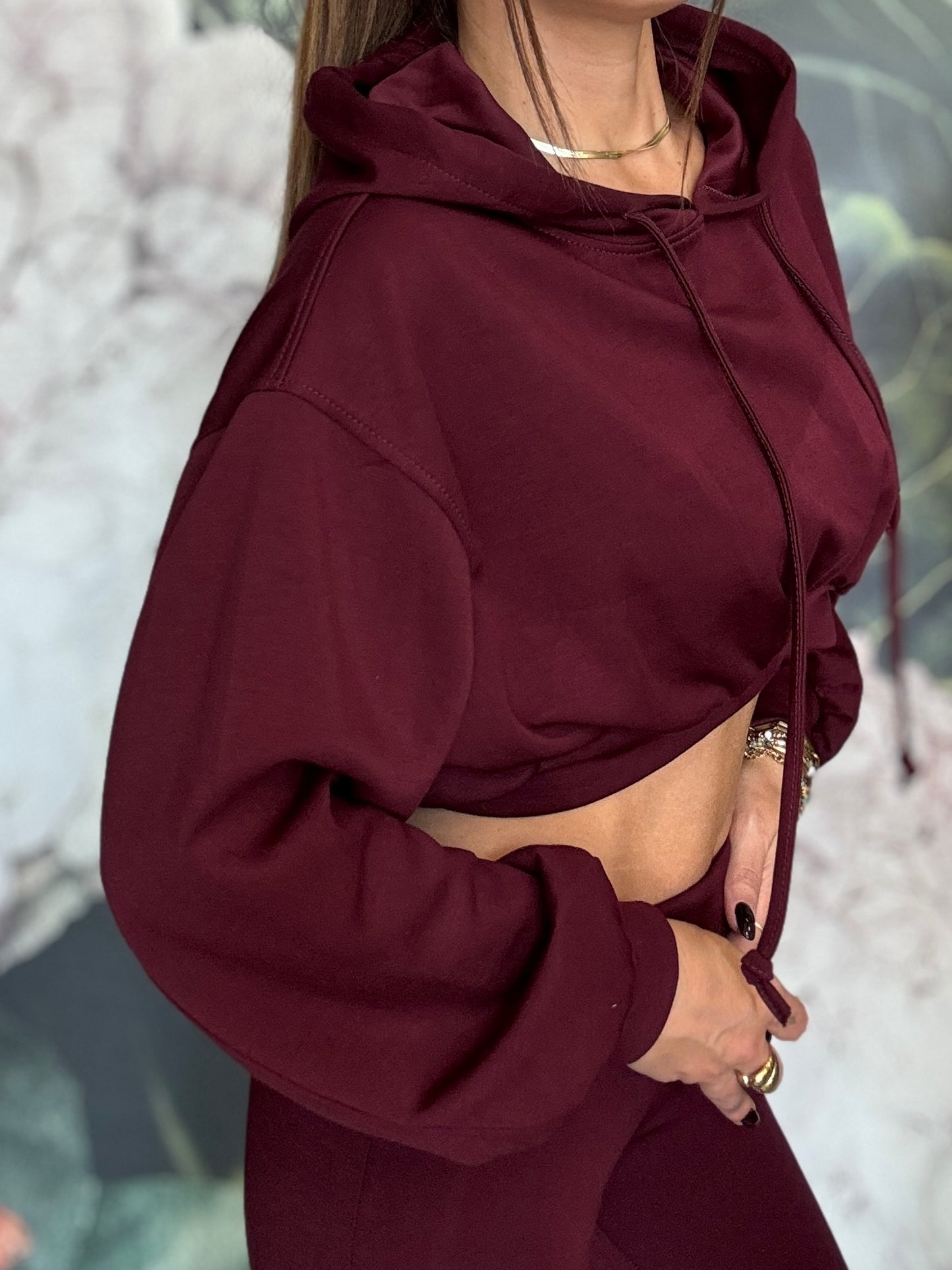 Coordinato stretch ,composto da felpa morbida crop con cappuccio e manica a sbuffo ampia all’altezza del polsino, pantalone a zampa con risvolto in vita.
