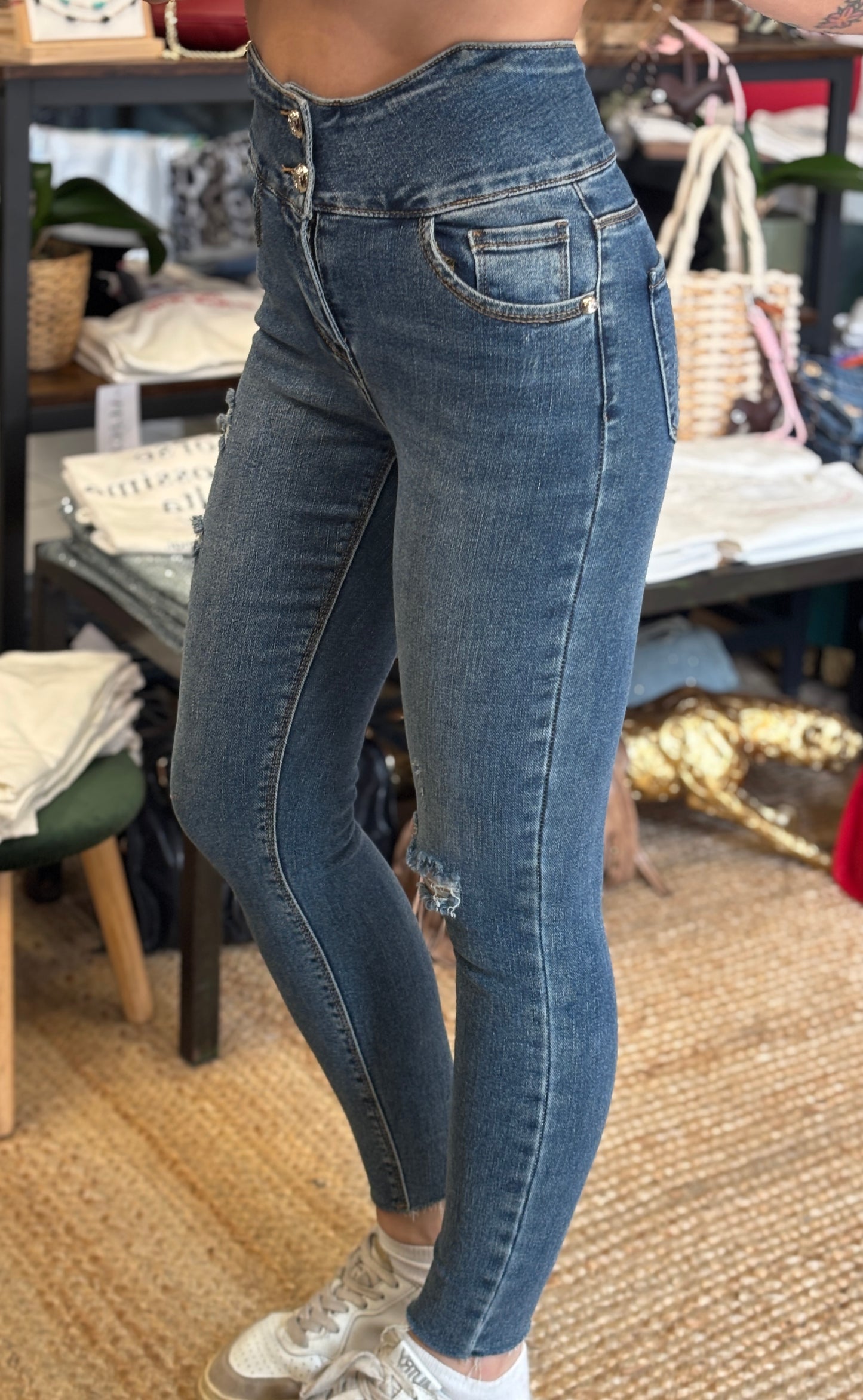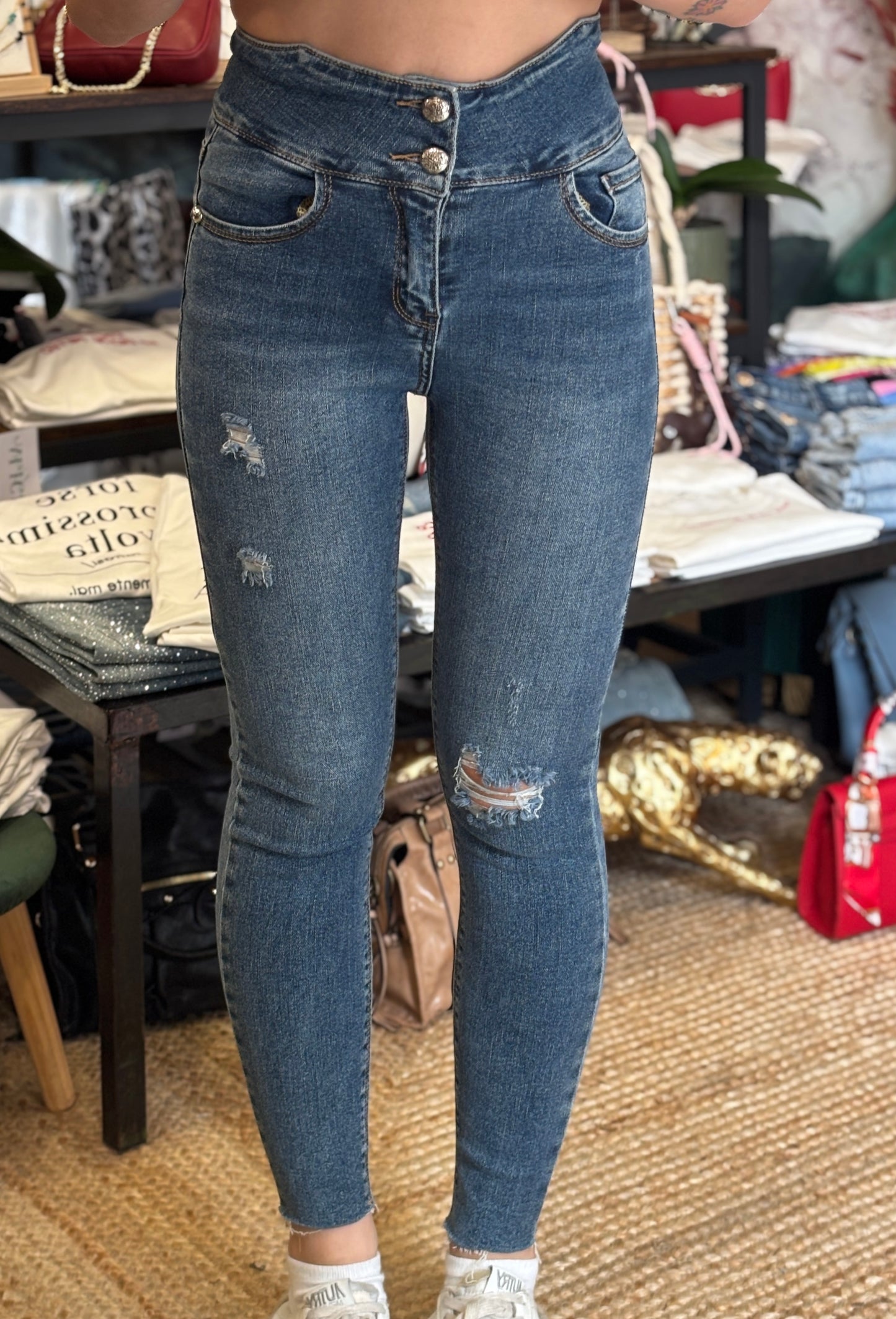 Jeans skinny elasticizzati a vita alta, chiusura con bottoni colore argento e zip, tasche laterali e sul retro, vestibilità aderente.