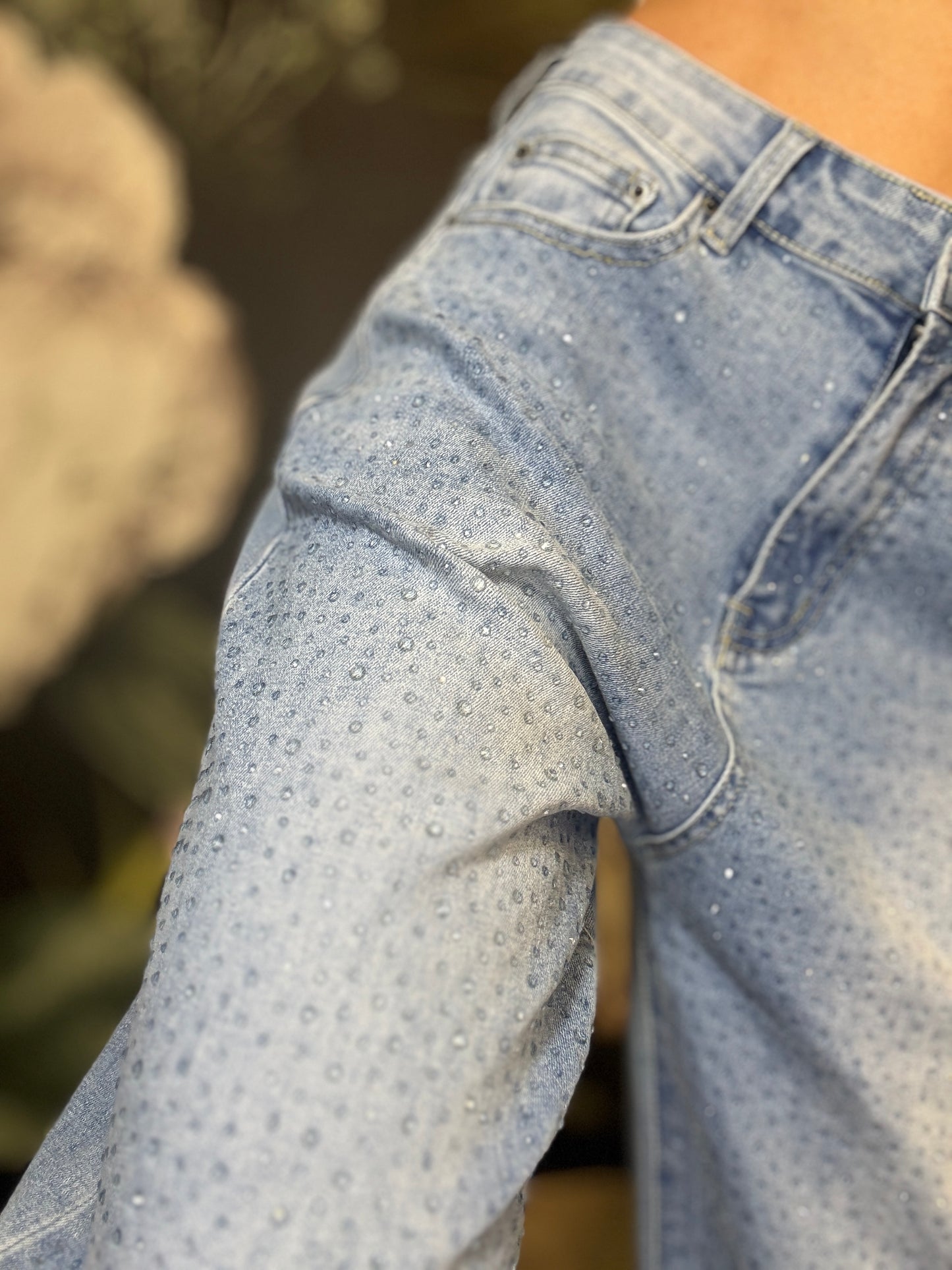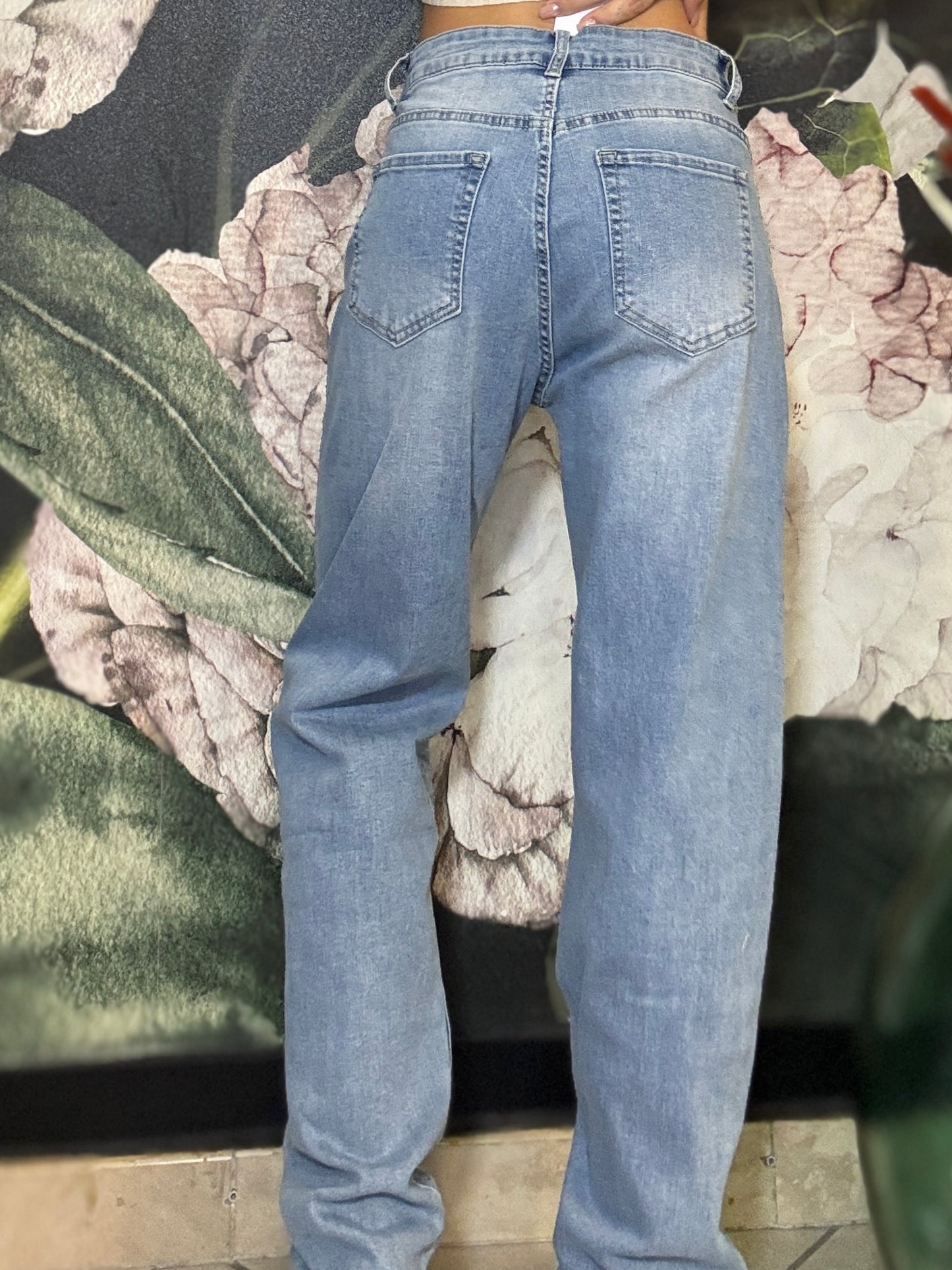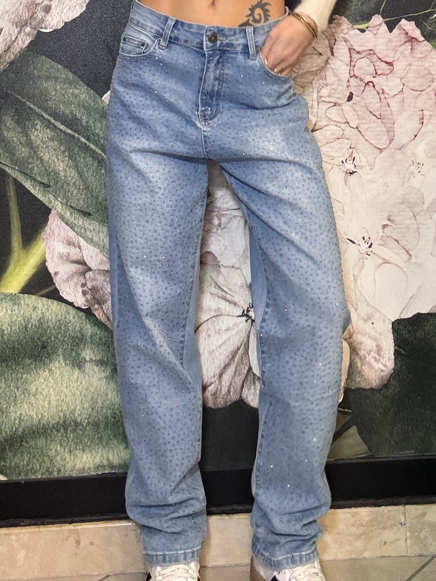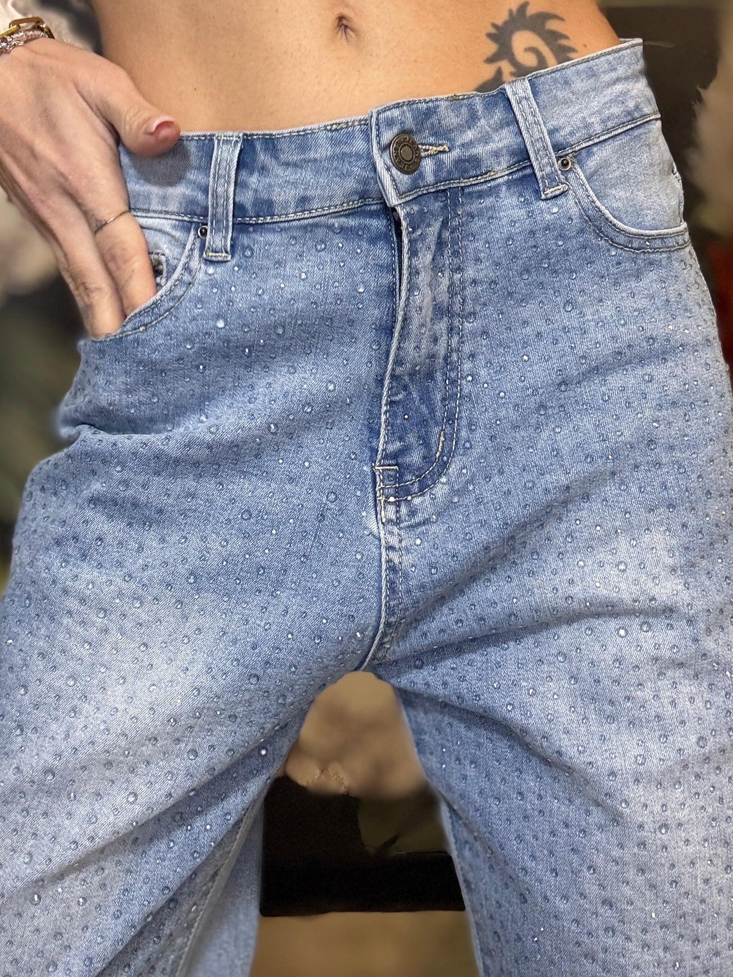 Jeans mom fit con strass a goccia, vita regolare, taglio 5 tasche, chiusura con bottone e zip.