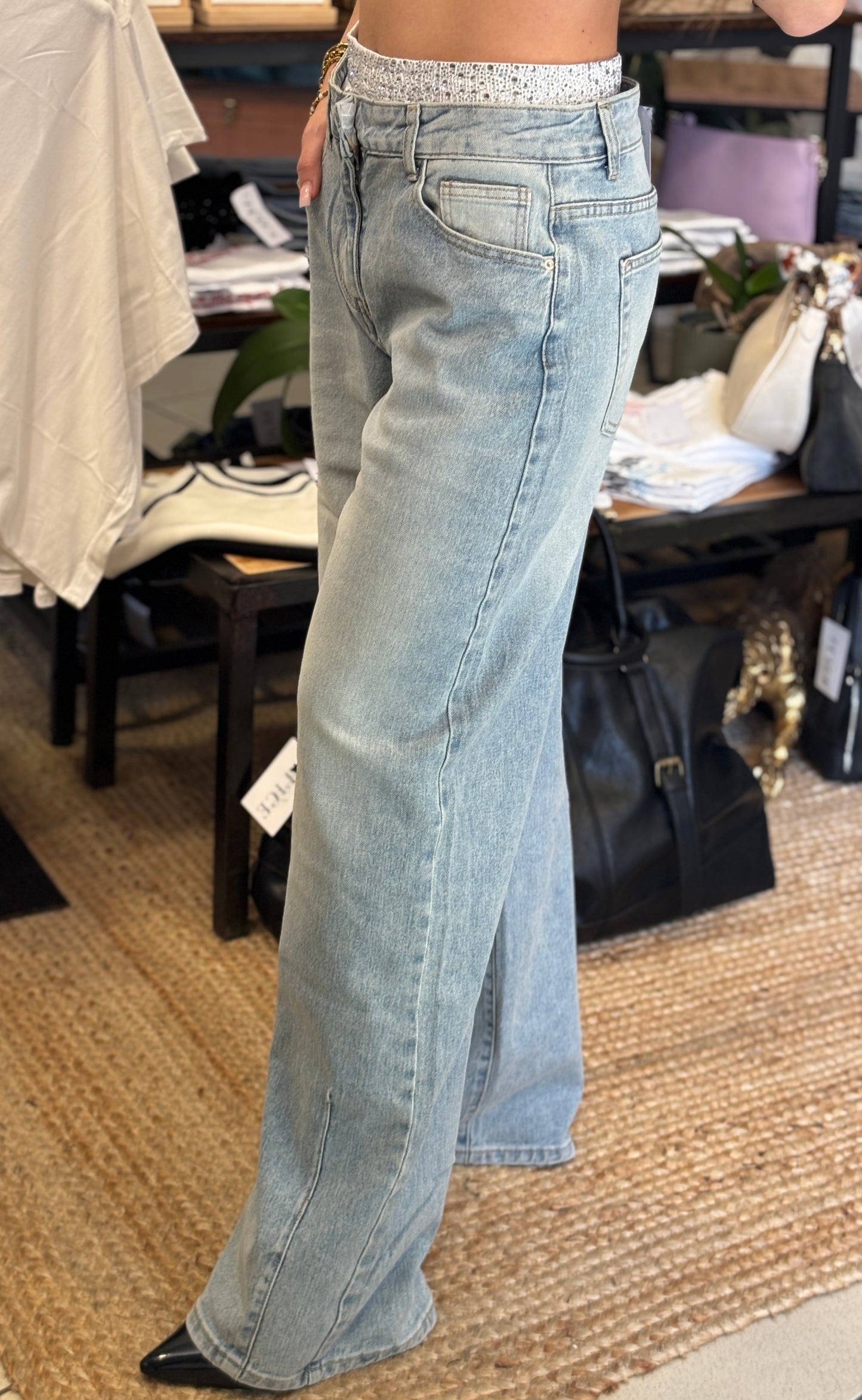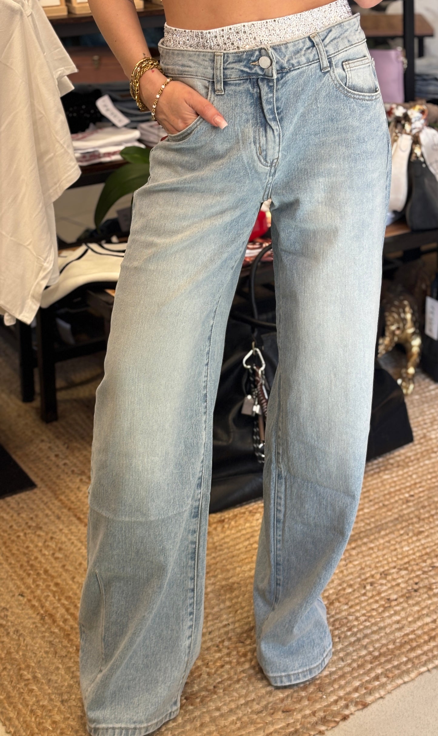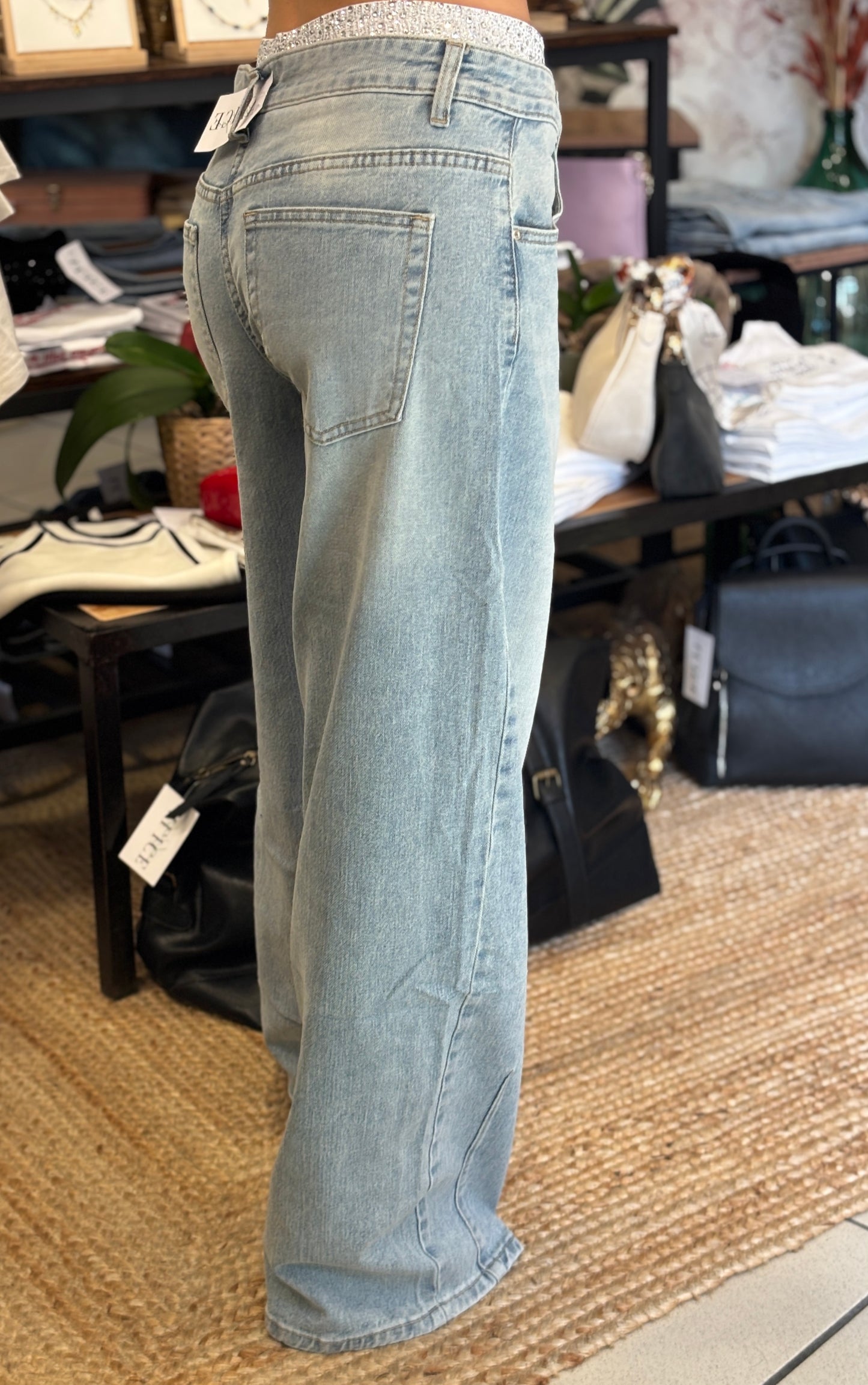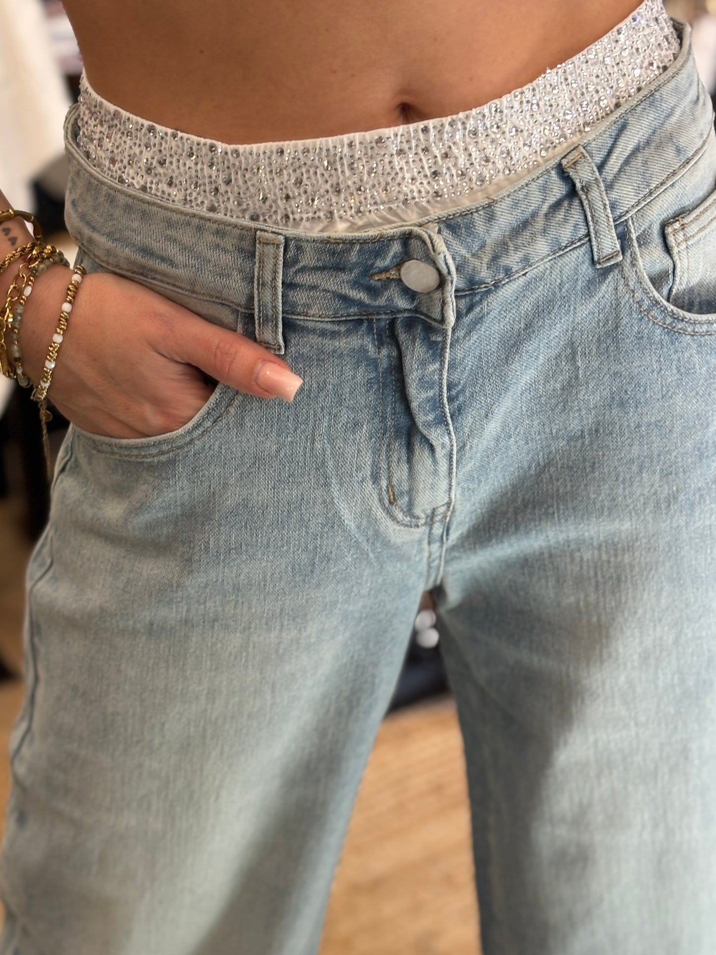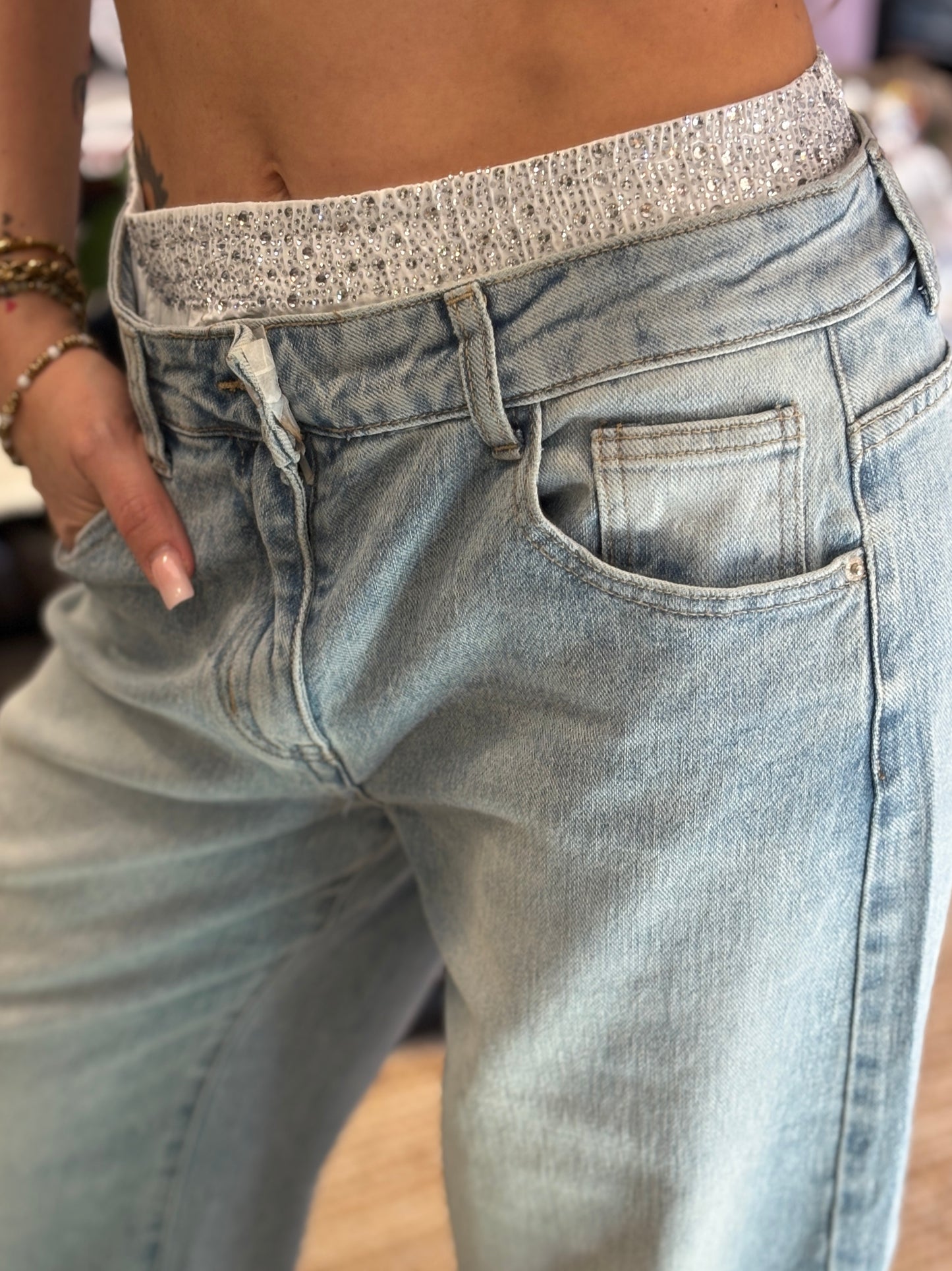 Jeans Wind leg con finto slip e strass applicati su tutto L’elastico.