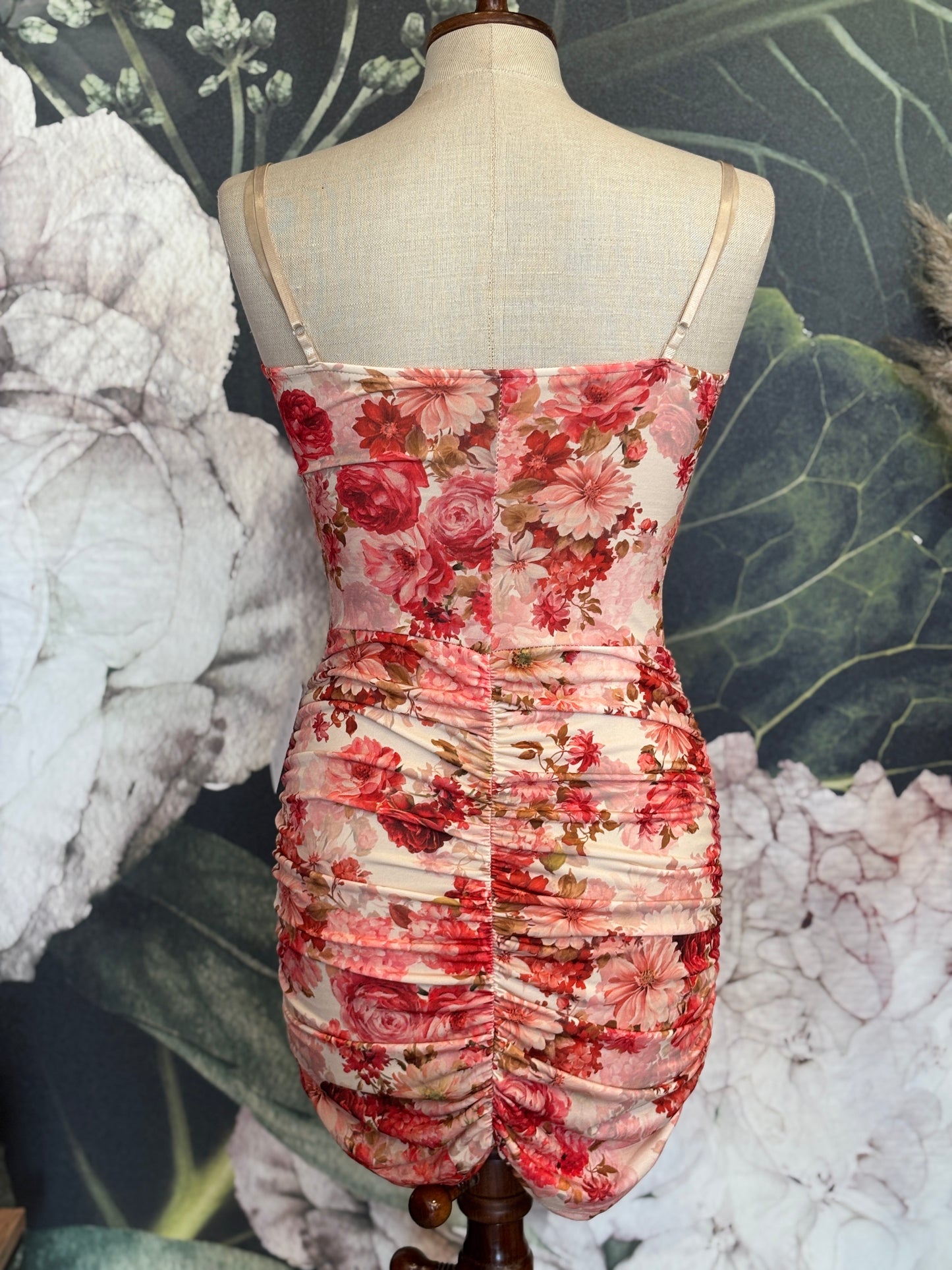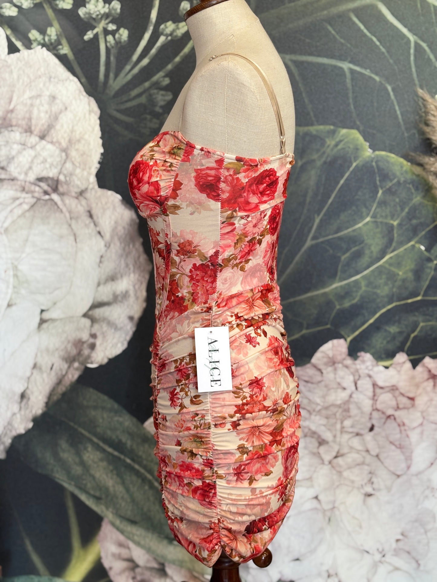 Abito a tubino con vestibilità aderente, scollo a cuore con coppa preformata e bustino con stecche non rigide stile corsetto. Drappeggi laterali, drappeggio nella parte frontale e sul retro. Spalline regolabili.