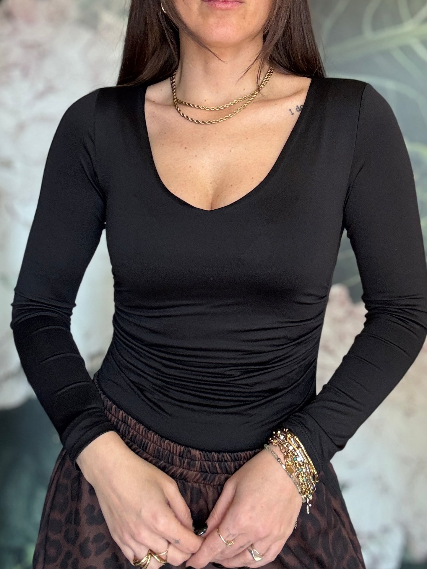 Body basico, scollato a V, con arricciature laterali, vestibilità aderente e fasciante.