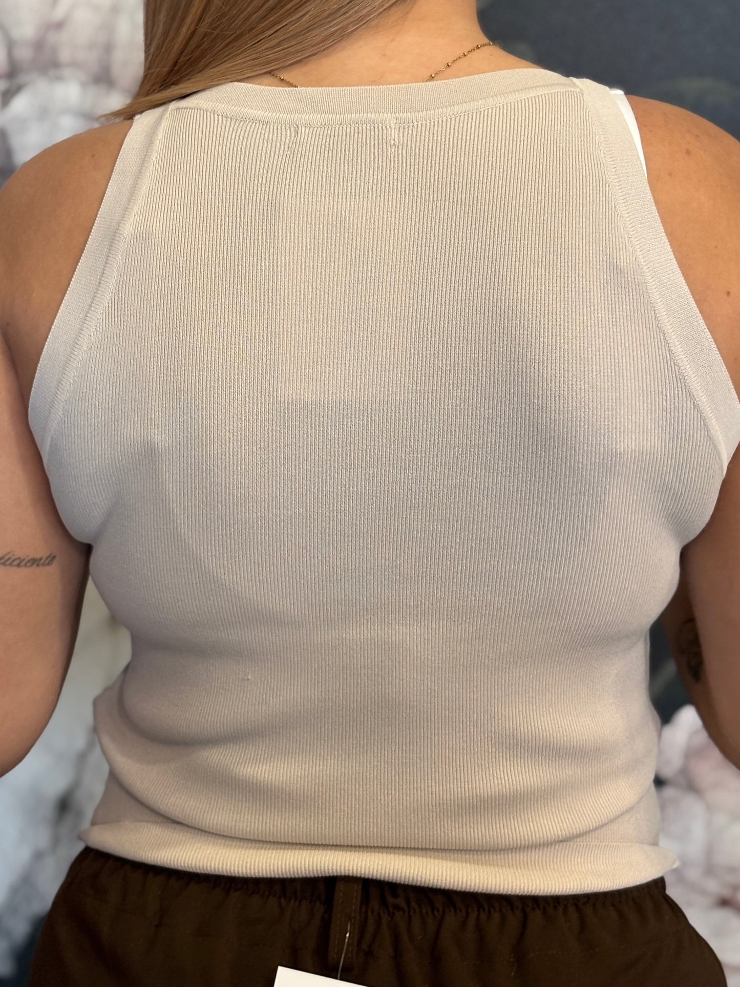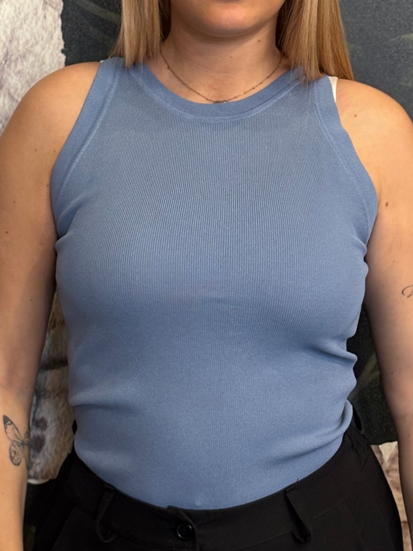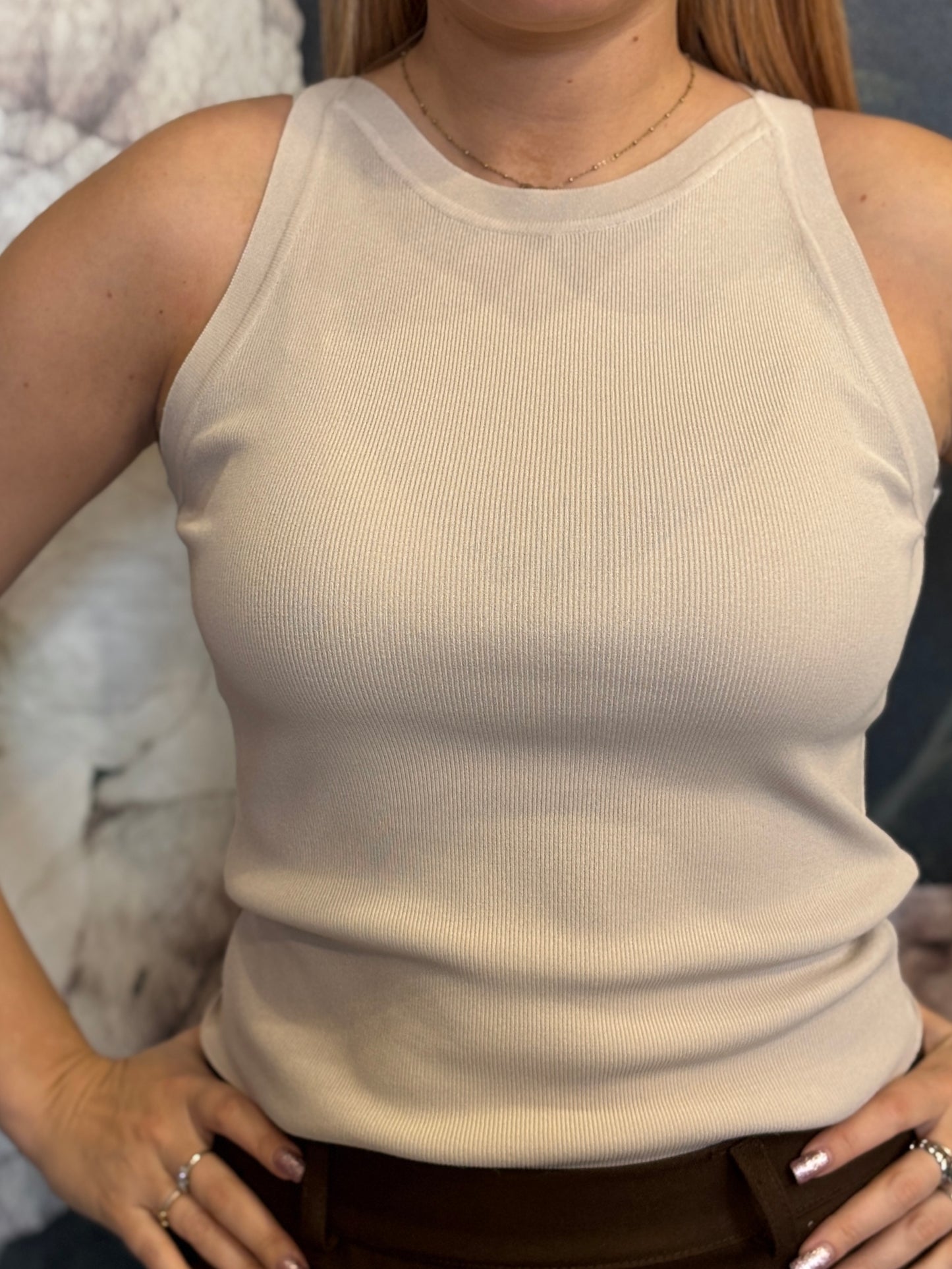 Top smanicato in maglia a costine. Il collo alto leggermente strutturato e il taglio americano valorizzano spalle e décolleté, creando una silhouette moderna e femminile. La lavorazione a costine dona struttura e raffinatezza.