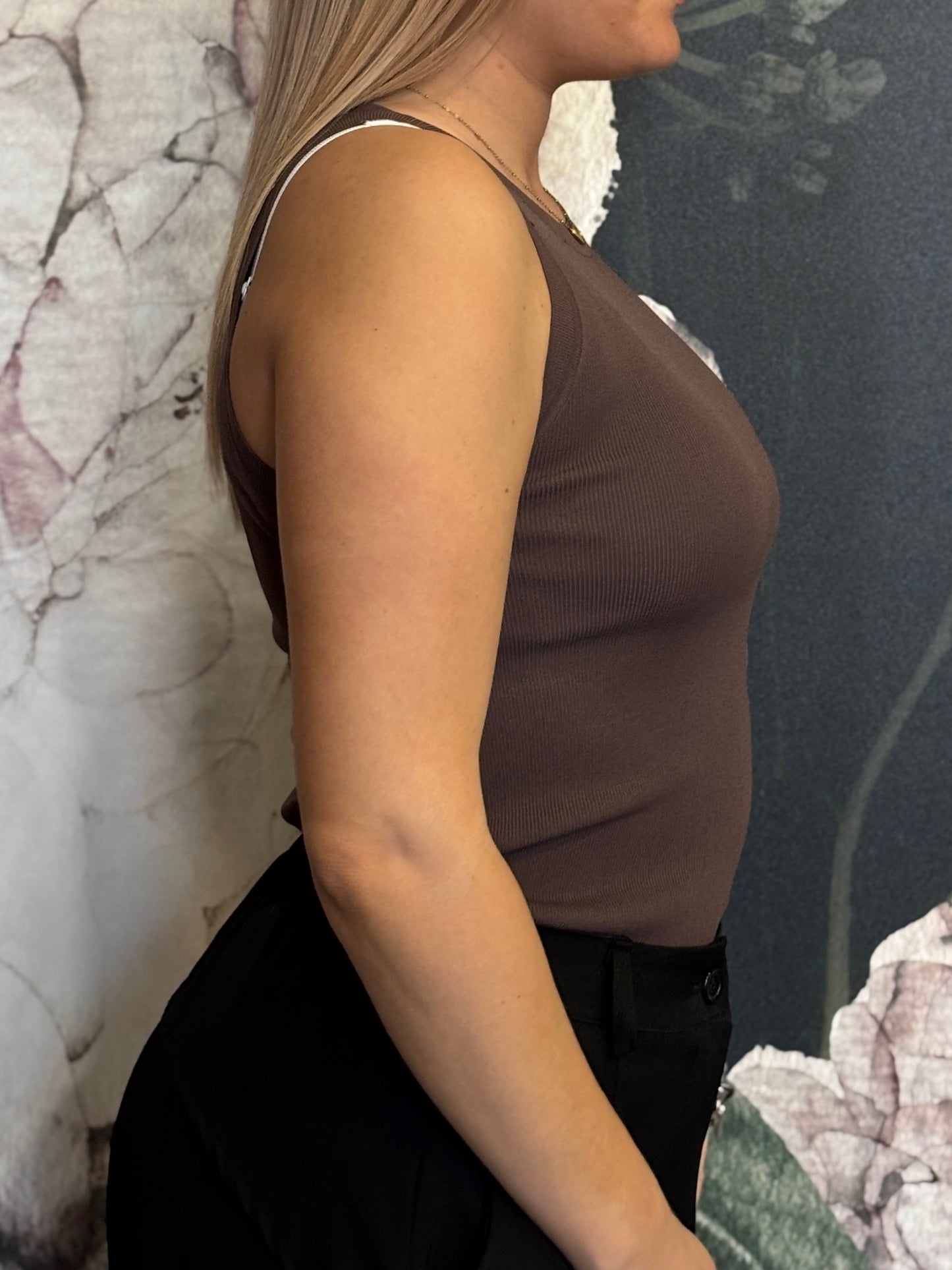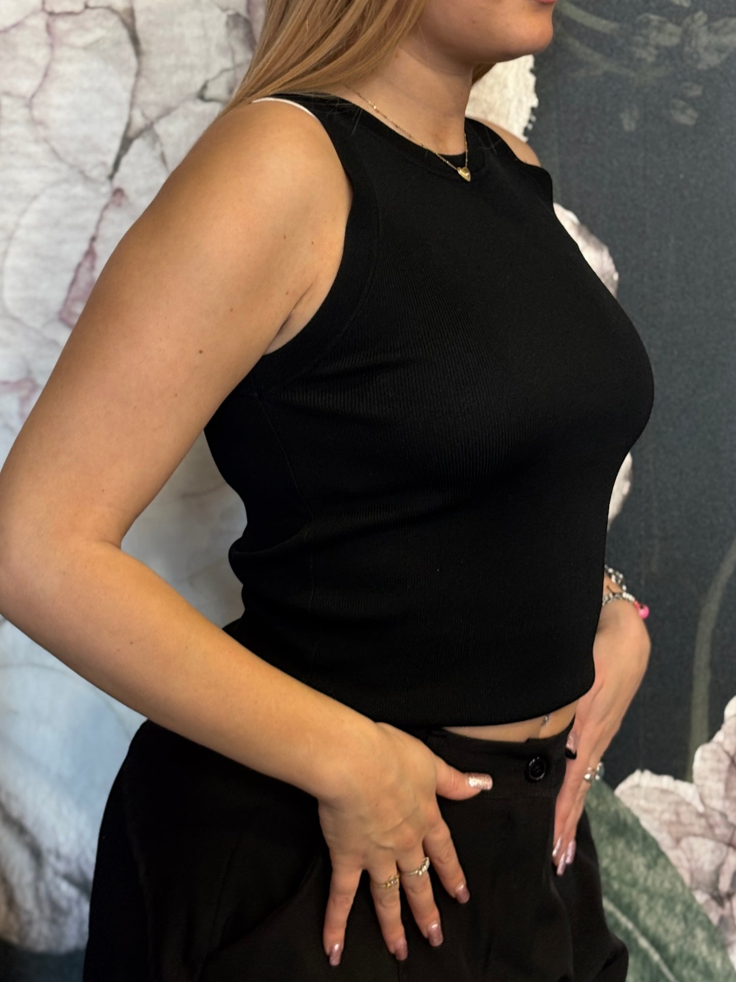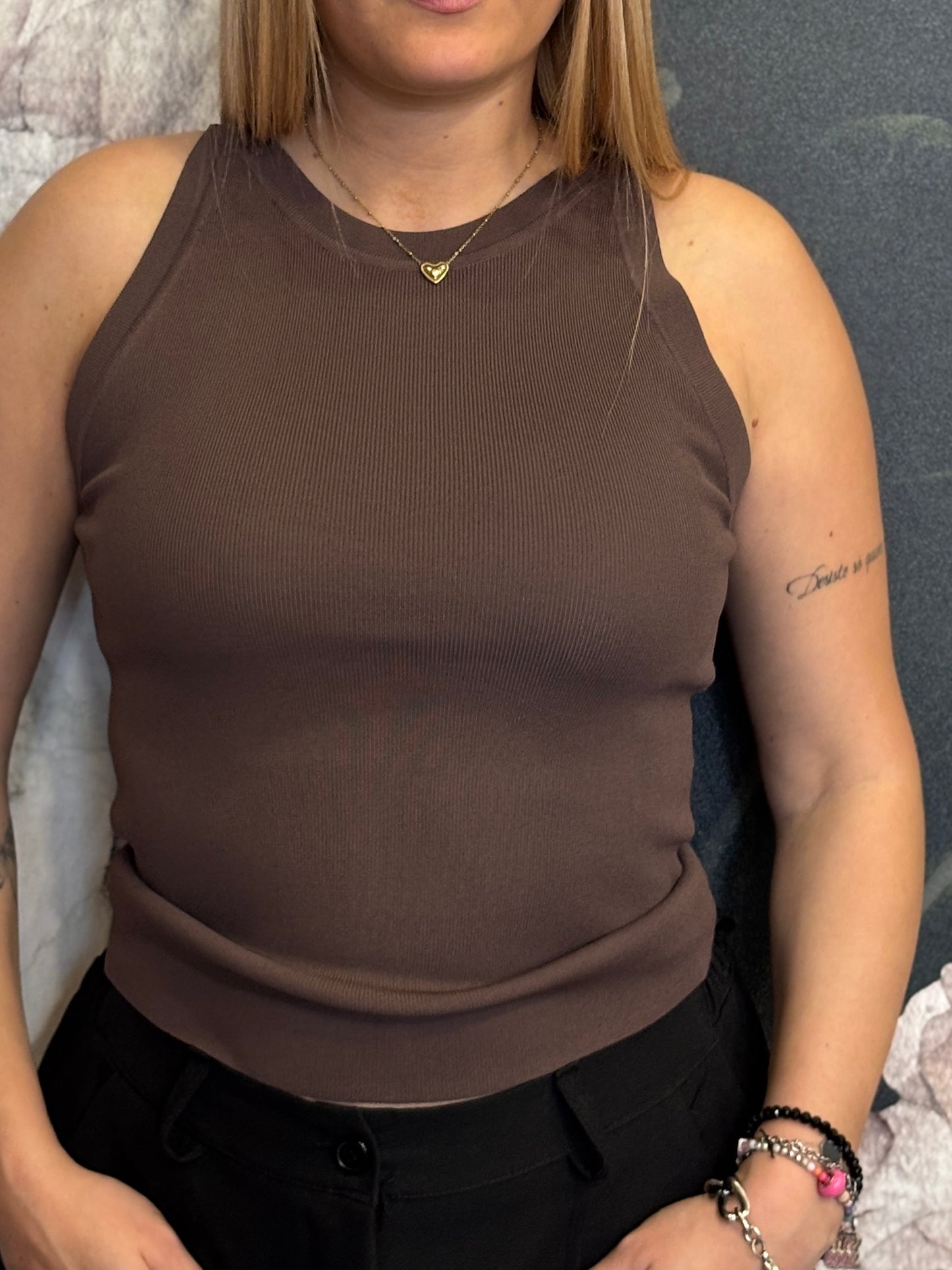 Top smanicato in maglia a costine. Il collo alto leggermente strutturato e il taglio americano valorizzano spalle e décolleté, creando una silhouette moderna e femminile. La lavorazione a costine dona struttura e raffinatezza.