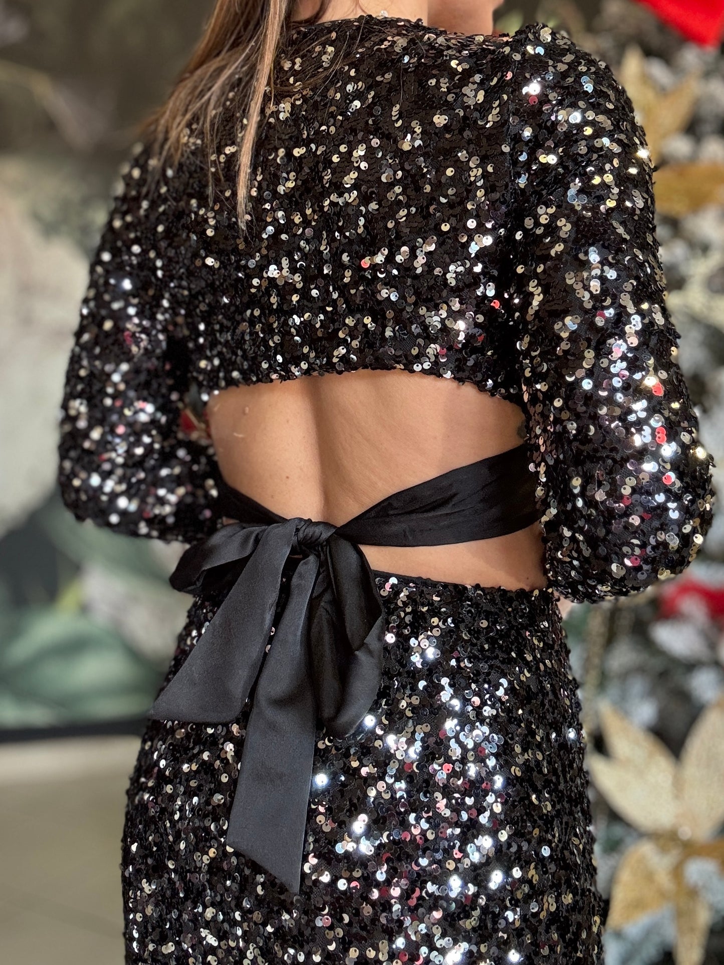Top crop a manica lunga, interamente realizzato in paillettes, fodera interna, i due lacci in raso da legare sul busto donano un tocco di eleganza al capo.