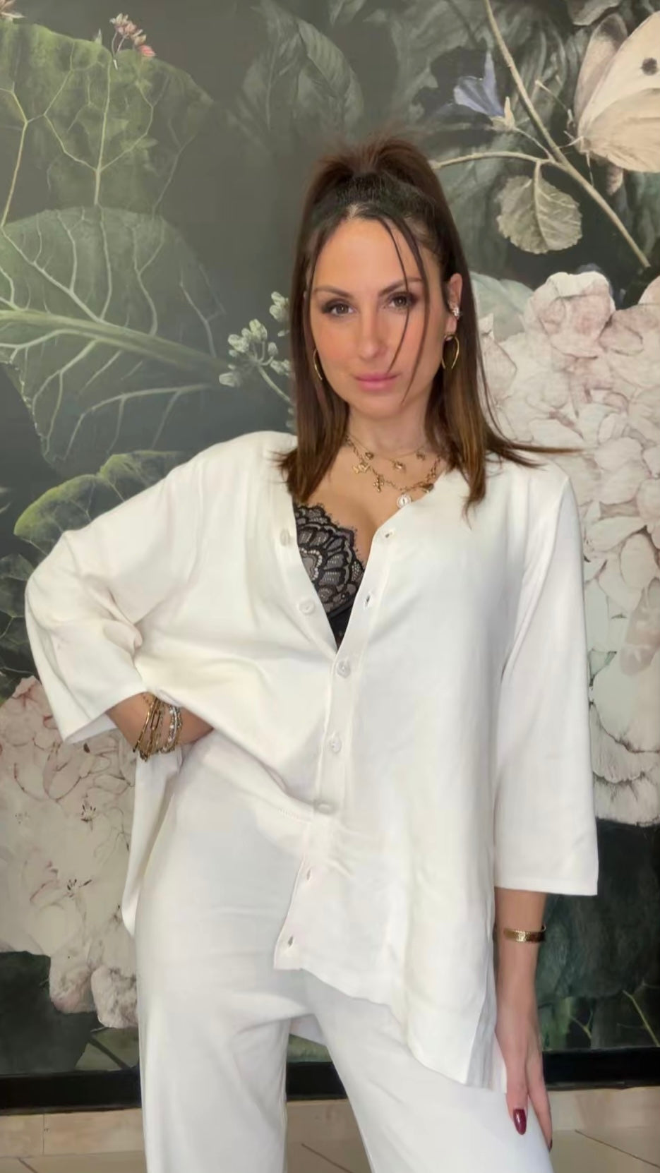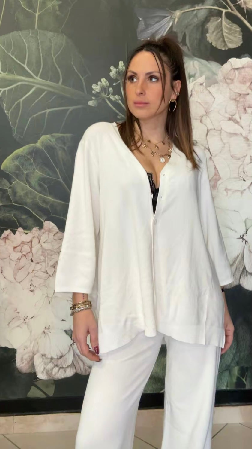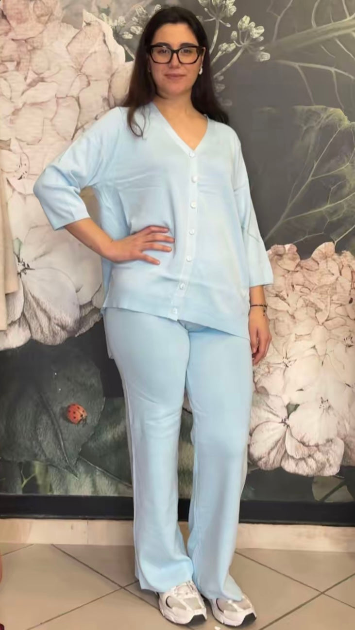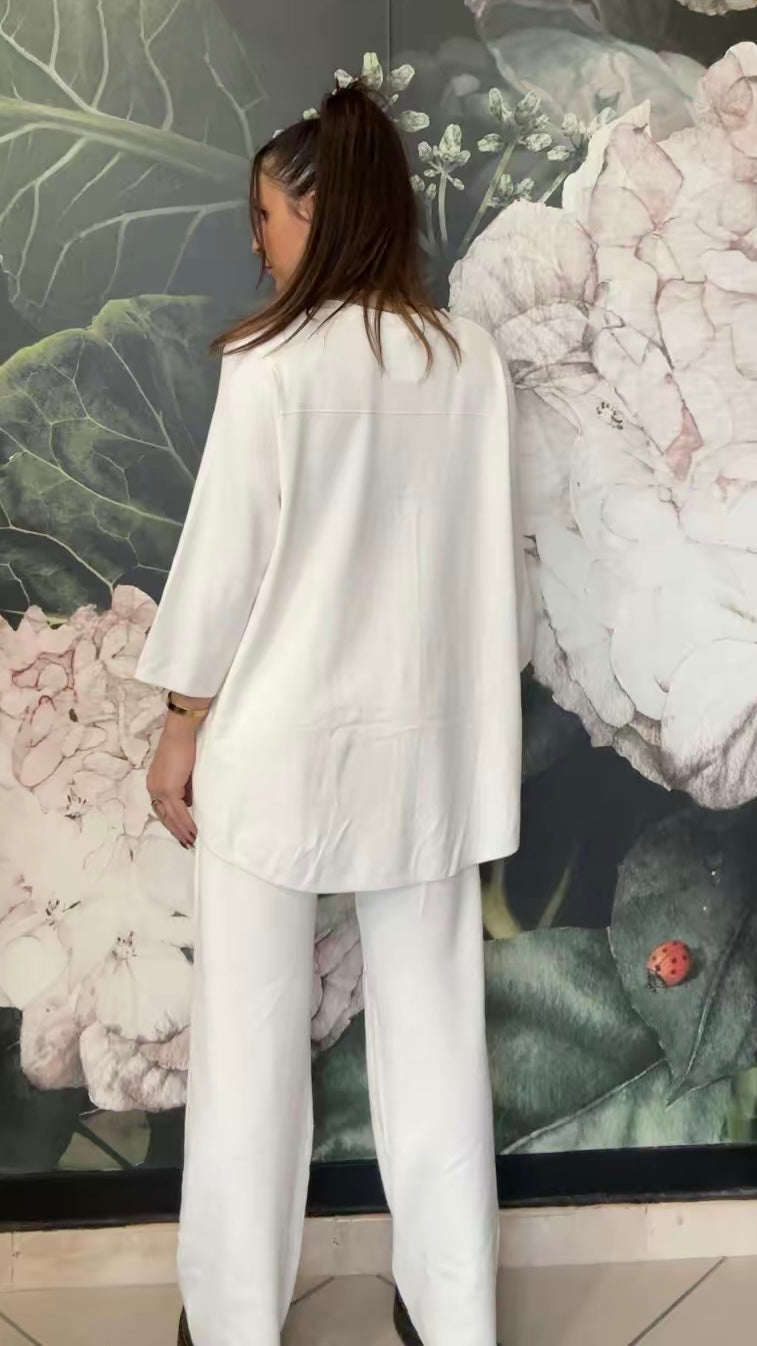 Coordinato composto da camicia oversize e pantalone morbido. La camicia presenta una linea morbida e fluida, chiusura frontale con bottoni e manica a tre quarti. Il pantalone ha una vestibilità comoda e una linea dritta.