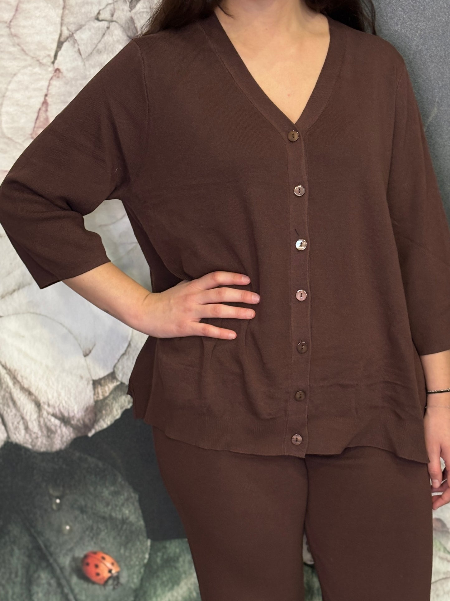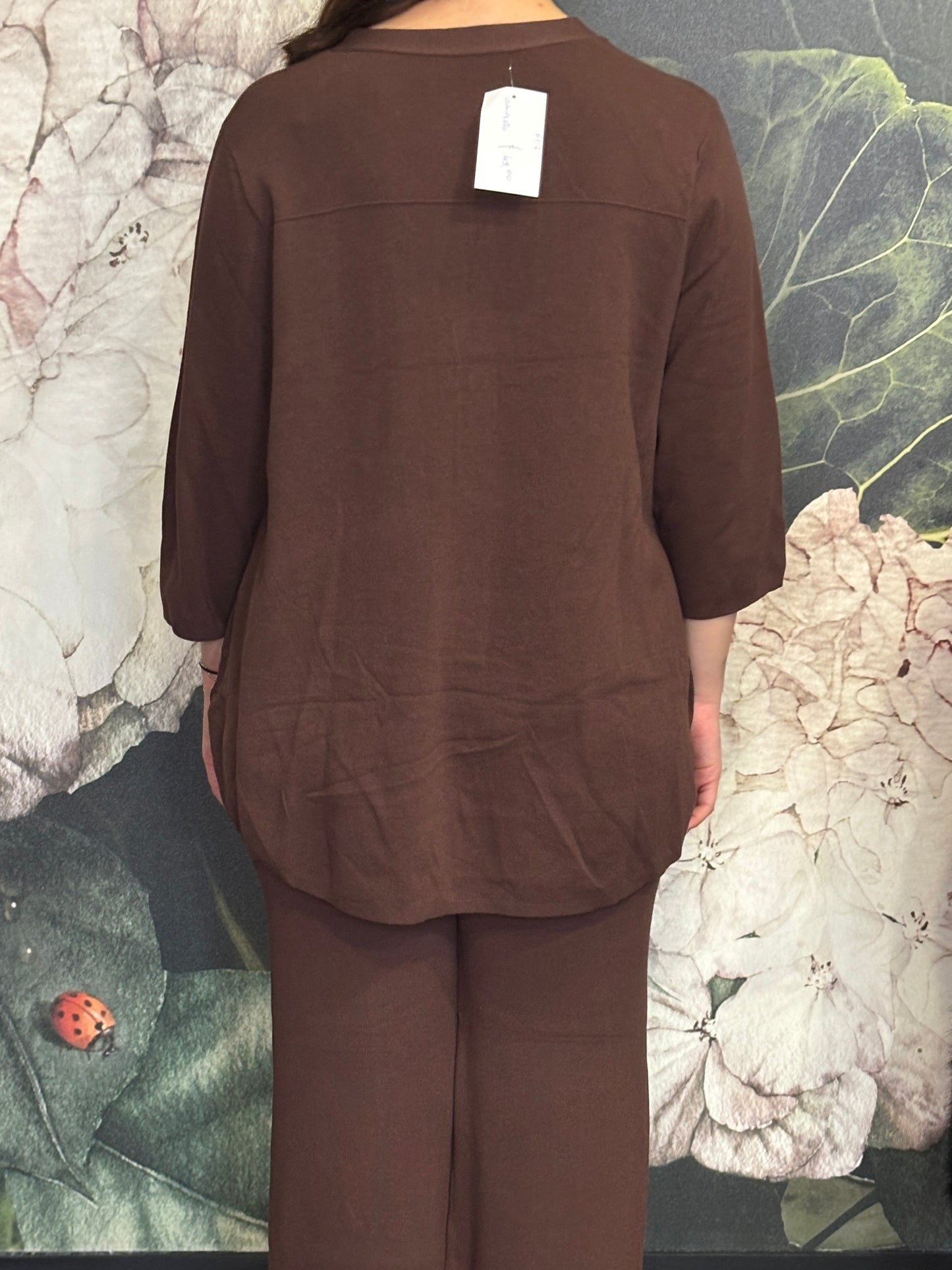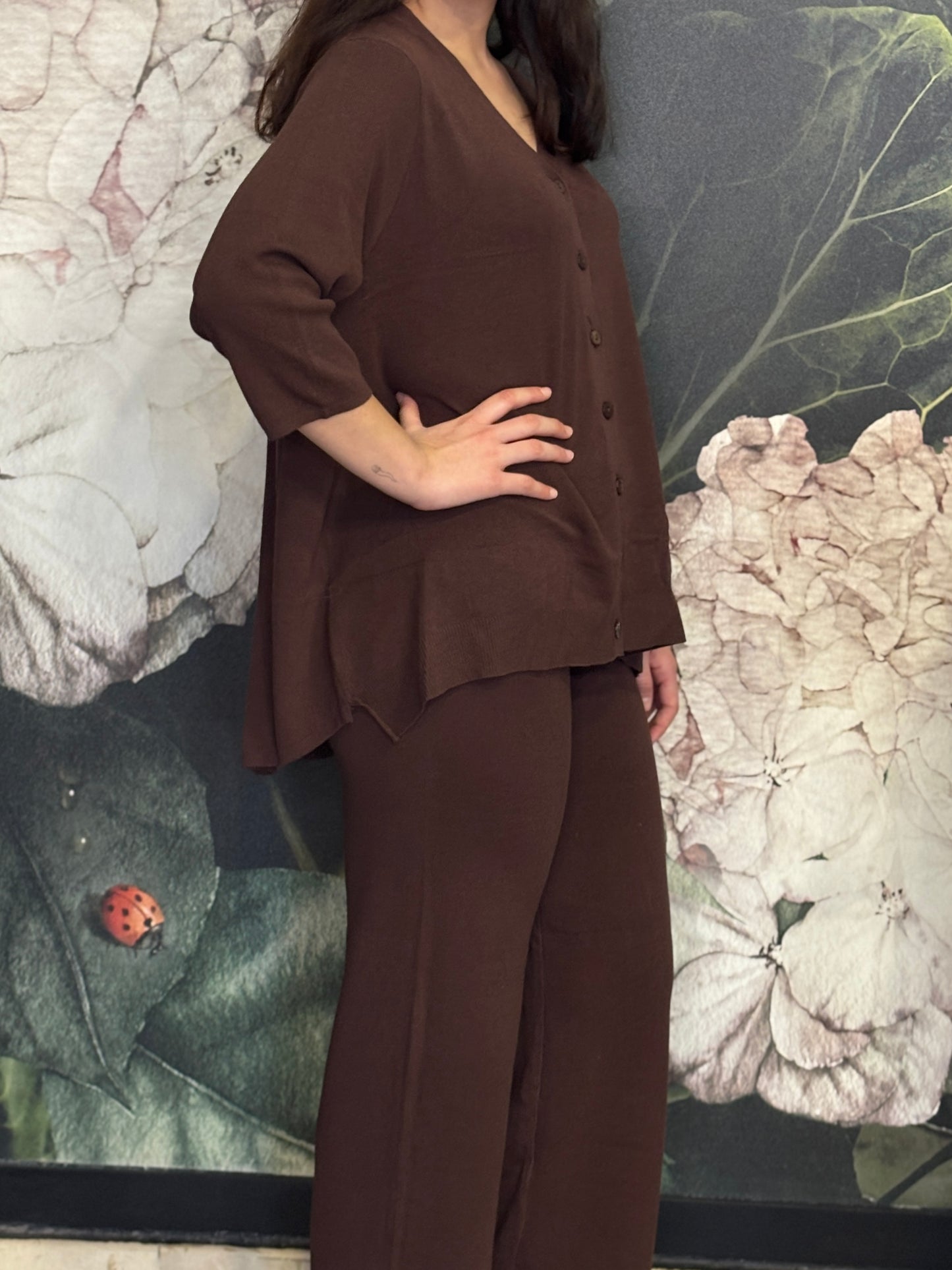 Coordinato composto da camicia oversize e pantalone morbido. La camicia presenta una linea morbida e fluida, chiusura frontale con bottoni e manica a tre quarti. Il pantalone ha una vestibilità comoda e una linea dritta.