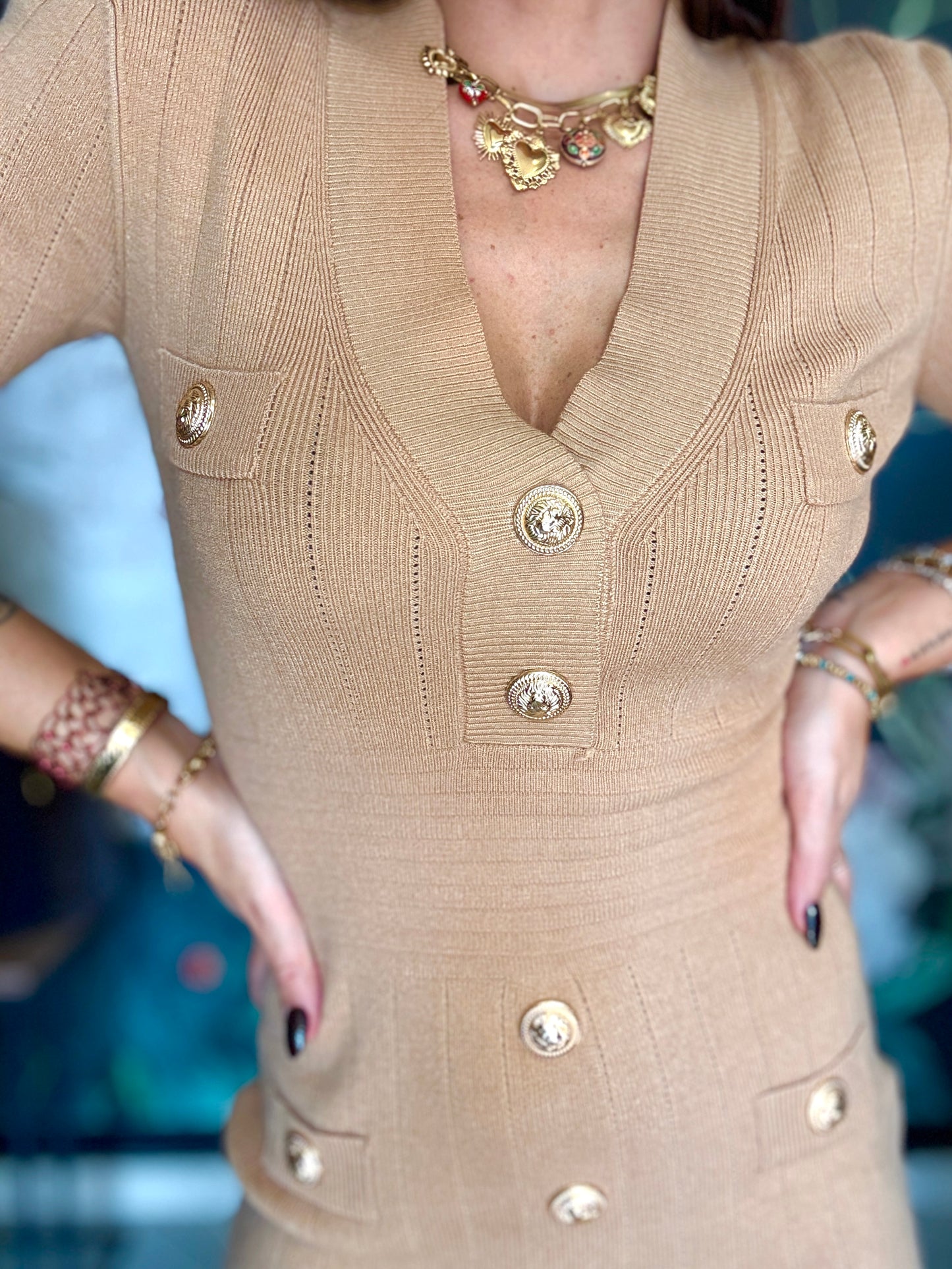 Vestito a costine a tubino, in maglia leggera, tinta unica con bottoni decorativi in metallo colore Oro, scollo a V, manica corta.